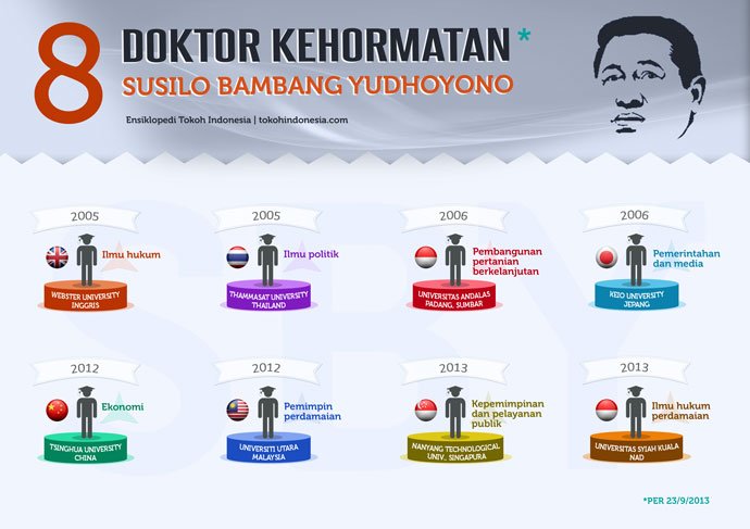 [BERITA TOKOH] – Infografis – Presiden Susilo Bambang Yudhoyono telah mendapatkan setidaknya delapan gelar doktor kehormatan (honoris causa). Dua gelar dari universitas di Indonesia dan enam gelar dari universitas-universitas di dunia seperti Singapura, Malaysia, China, Thailand, Jepang, dan Inggris. Unduh Infografis (High Resolution)