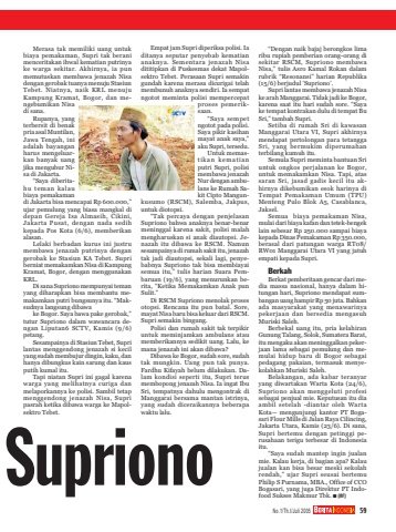 No.1/Th.I/Juli 2005 59Merasa tak memiliki uang untukbiaya pemakaman, Supri tak beranimenceritakan ihwal kematian putrinyake warga sekitar. Akhirnya, ia punmemutuskan membawa jenazah Nisadengan gerobak tuanya menuju StasiunTebet. Niatnya, naik KRL menujuKampung Kramat, Bogor, dan mengebumikan Nisadi sana.Rupanya, yangterbersit di benakpria asal Muntilan,Jawa Tengah, iniadalah bayanganharus mengeluarkan banyak uangjika mengubur Nisa di Jakarta.“Saya diberitahu teman kalaubiaya pemakamandi Jakarta bisa mencapai Rp 600.000,”ujar pemulung yang biasa mangkal didepan Gereja Isa Almasih, Cikini,Jakarta Pusat, dengan nada sedihkepada Pos Kota (6/6), memberikanalasan.Lelaki berbadan kurus ini justrumembawa jenazah putrinya dengangerobak ke Stasiun KA Tebet. Supriberniat memakamkan Nisa di KampungKramat, Bogor, dengan menggunakanKRL.Di sana Supriono mempunyai temanyang diharapkan bisa membantu memakamkan putri bungsunya itu. “Maksudnya langsung dibawake Bogor. Saya bawa pake gerobak,”tutur Supriono dalam wawancara dengan Liputan6 SCTV, Kamis (9/6)petang.Sesampainya di Stasiun Tebet, Suprilantas menggendong jenazah si kecilyang sudah membujur dingin, kaku, danhanya dibungkus kain sarung dan kausputih kumal itu.Tapi niatan Supri ini gagal karenawarga yang melihatnya curiga danmelaporkannya ke polisi. Sambil tetapmenggendong jenazah Nisa, Supripasrah ketika dibawa warga ke Mapolsektro Tebet.Empat jam Supri diperiksa polisi. Iaditanya seputar penyebab kematiananaknya. Sementara jenazah Nisadititipkan di Puskesmas dekat Mapolsektro Tebet. Perasaan Supri semakingundah karena merasa dicurigai telahmembunuh anaknya sendiri. Ia sempatngotot meminta polisi mempercepatproses pemeriksaan.“Saya sempetngotot pada polisi.Saya pikir kasihanmayat anak saya,”aku Supri, tersedu.Untuk memastikan kematianputri Supri, polisimembawa jenazahNur dengan ambulans ke Rumah Sakit Cipto Mangunkusumo (RSCM), Salemba, Jakpus,untuk diotopsi.“Tak percaya dengan penjelasanSupriono bahwa anaknya benar-benarmeninggal karena sakit, polisi malahmengharuskan si anak diautopsi. Jenazah itu dibawa ke RSCM. Namunsesampainya di rumah sakit itu, jenazahtak jadi diautopsi, sekali lagi, penyebabnya Supriono tak bisa membiayaisemua itu,” tulis harian Suara Pembaruan (19/6), yang menurunkan berita, “Ketika Memakamkan Anak punSulit.”Di RSCM Supriono menolak prosesotopsi. Rencana itu pun batal. Sore,mayat Nisa baru bisa keluar dari RSCM.Supri semakin bingung.Polisi dan rumah sakit tak terpikiruntuk meminjamkan ambulans ataumemberikannya sedikit uang. Lalu, kemana jenazah ini akan dibawa?Dibawa ke Bogor, sudah sore, sudahtak mungkin. Uang pun tak punya.Fardhu Kifayah belum dilakukan. Dalam kondisi seperti itu, Supri terusmembopong jenazah Nisa. Ia ingat IbuSri, tempatnya dahulu mengontrak diManggarai bersama mantan istrinya,yang sudah diceraikannya beberapawaktu lalu.Supriono“Dengan naik bajaj berongkos limaribu rupiah pemberian orang-orang disekitar RSCM, Supriono membawaNisa,” tulis Asro Kamal Rokan dalamrubrik “Resonansi” harian Republika(15/6) berjudul ‘Supriono’.Supri lantas membawa jenazah Nisake arah Manggarai. Tidak jadi ke Bogor,karena saat itu hari sudah sore. “Sayake tempat kontrakan dulu di tempat BuSri,” tambah Supri.Setiba di rumah Sri di kawasanManggarai Utara VI, Supri akhirnyamendapat pertolongan para tetanggaSri, yang bermukim diperumahanterbilang kumuh itu.Semula Supri meminta bantuan Sriuntuk ongkos perjalanan ke Bogor,untuk memakamkan Nisa. Tapi, atassaran Sri, jasad gadis kecil itu akhirnya dikebumikan esok harinya diTempat Pemakaman Umum (TPU)Menteng Pulo Blok A5, Casablanca,Jaksel.Semua biaya pemakaman Nisa,mulai dari biaya kafan dan tetek-bengeklain sebesar Rp 250.000 sampai biayakepada Dinas Pemakaman Rp 350.000,berasal dari patungan warga RT08/RW01 Manggarai Utara VI yang jatuhempati kepada Supri.BerkahBerkat pemberitaan gencar dari media massa nasional, hanya dalam hitungan hari, Supriono mendapat sumbangan uang hampir Rp 50 juta. Bahkanada masyarakat yang menawarinyapekerjaan dan bersedia mengasuhMuriski Saleh.Berbekal uang itu, pria kelahiranGunung Talang, Solok, Sumatera Barat,itu mengaku akan meninggalkan pekerjaan lama sebagai pemulung dan memulai hidup baru di Bogor sebagaipedagang pakaian, termasuk menyekolahkan Muriski Saleh.Belakangan, ada kabar teranyaryang diwartakan Warta Kota (24/6),Supriono akan menggeluti profesisebagai penjual mie. Keputusan itu diaambil setelah -diantar oleh WartaKota— mengunjungi kantor PT Bogasari Flour Mills di Jalan Raya Cilincing,Jakarta Utara, Kamis (23/6). Di sana,Supri bertemu dengan petinggi perusahaan terigu terbesar di Indonesiaitu.“Saya sudah mantep ingin jualanmie. Kalau kerja, di bagian apa? Kalaujualan kan bisa besar meski sekolahrendah,” ujar Supri seusai bertemuPhilip S Purnama, MBA., Office of CCOBogasari, yang juga Direktur PT Indofood Sukses Makmur Tbk. ■ (AF)
