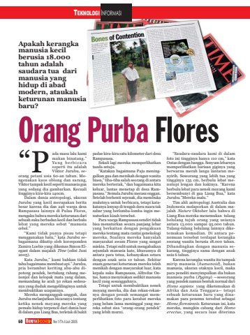 TEKNOLOGI INFORMASI60 No.1/Th.I/Juli 2005“Pada masa lalu kamimakan binatang.”Ya n g b e r b i c a r aseperti itu adalahViktor Jurubu, seorang petani usia 60-an tahun. Mengenakan kaos oblong dan sarung,Viktor tampak kecil seperti manusia guayang sedang dia gambarkan. Kecualitingginya kira-kira 140cm.Dalam dunia antropologi, ukuranJurubu yang kecil merupakan beritabesar karena dia dan 246 warga desaRampasasa lainnya di Pulau Flores,mengaku bahwa mereka keturunan darisebuah suku berbadan kecil dan berbululebat yang mereka sebut “manusiacebol.”“Kami tidak punya pisau tetapimenggunakan batu,” kata Jurubu sebagaimana dikutip oleh korespondenZamira Loebis yang dikemas Simon Elegant dalam majalah Time (edisi Juni2005).Kata Jurubu,” kami bahkan tidaktahu bagaimana membuat api.” Jurubu,pria berambut keriting abu-abu dipotong pendek, bertulang rahang menonjol dan kelopak mata yang dalam,memandang ke arah 30 rekan sedesanya yang duduk mengelilinginya untukmembuktikan ucapannya.Mereka mengangguk-angguk, danJurubu melanjutkan bicaranya tentangketika nenek moyang mereka yangpemalu hidup terpencil dari dunia luardi dalam gua Liang Bua, terletak di bukitpadas kira-kira satu kilometer dari desaRampasasa.Sekali lagi mereka memperlihatkantanda setuju.“Katakan bagaimana Paju meninggalkan gua dan menikah dengan wanitabiasa,” tiba-tiba salah seorang di antaramereka berteriak, “dan bagaimana kitakeluar, lantas menetap di desa Rampasasa.” Semula Jurubu merasa enggan.Setelah berhenti sejenak, dia membukamulutnya untuk berbicara, tetapi katakatanya lenyap di tengah deru suara taksabar yang berlomba-lomba ingin menuturkan kisah tersebut.Para warga Rampasasa sendiri tidakbisa menuturkan secara panjang lebaryang berkaitan dengan pengakuanmereka tentang mata rantai genekologimereka. Soalnya mereka hanyalahmasyarakat awam Flores yang sangatmiskin. Tetapi sulit untuk mengabaikansejumlah manusia kate, khususnya diantara para tetua, kebanyakan setaradengan anak usia 10 tahun. Sekitarenam generasi keturunan mereka telahmenikah dengan masyarakat luar, katakepala suku Rampasasa, Alfredus Ontas, hanya menyisakan sedikit manusiakecil yang sesungguhnya.Tetapi untuk membuktikan nenekmoyang mereka, dia dan rekan-rekannya dengan penuh semangat memperlihatkan foto para kerabat merekayang belum lama meninggal yang mereka sebut sisa “orang-orang pendek”yang lebih murni.Apakah kerangkamanusia kecilberusia 18.000tahun adalahsaudara tua darimanusia yanghidup di abadmodern, ataukahketurunan manusiabaru?“Saudara-saudara kami di dalamfoto ini tingginya hanya 110 cm,” kataOntas dengan bangga. Senyum lebarnyamemperlihatkan barisan giginya yangberwarna merah langu lantaran menyirih. Seseorang yang lebih tua yangtingginya 135 cm, berbulu lebat menutupi lengan dan kakinya. “Karenaberbulu lebat para nenek moyang kamibersembunyi di gua Liang Bua,” kataJurubu.”Mereka malu.”Tim ahli antropologi Australia danIndonesia melaporkan di dalam majalah Nature Oktober lalu bahwa diLiang Bua mereka menemukan tulangbelulang tujuh orang yang usianyaantara 13.000 sampai 95.000 tahun.Tulang-tulang belulang lainnya diketemukan kemudian. Di antara penemuan tersebut terdapat kerangkaseorang wanita berusia 18.000 tahun.Dibandingkan dengan manusia sekarang, tingginya sama dengan anakusia 6 tahun.Karena kerangka wanita itu tampakmirip manusia (humanoid), bukanmanusia, ukuran otaknya kecil, makapara peneliti menyimpulkan dia bukanmanusia purba (Pygmy) —seseorangyang pendek namun bentuk normal dariHomo sapiens yang diketemukan diAfrika dan Asia Tenggara— tetapisebuah keturunan baru yang dinamakan para penemu tersebut sebagaiHomo floresiensis. Keturunan ini, katamereka, mungkin cabang dari Homoerectus, yang secara luas diterimaOrang PurbaFloresTEKNOLOGI INFORMASI
