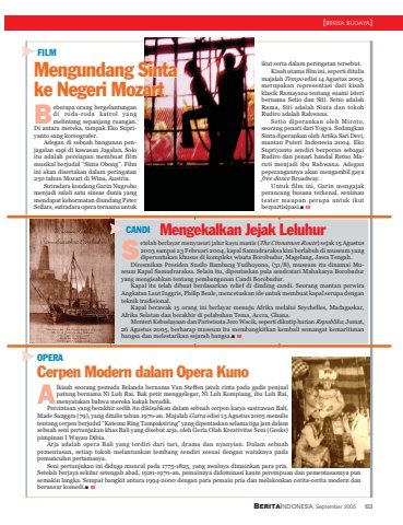 BERITAINDONESIA, September 2005 63Beberapa orang bergelantungandi roda-roda katrol yangmelintang sepanjang ruangan.Di antara mereka, tampak Eko Supriyanto sang koreografer.Adegan di sebuah bangunan penjagalan sapi di kawasan Jagalan, Soloitu adalah persiapan membuat filmmusikal berjudul “Sinta Obong”. Filmini akan disertakan dalam peringatan250 tahun Mozart di Wina, Austria.Sutradara kondang Garin Nugrohomenjadi salah satu sineas dunia yangmendapat kehormatan diundang PeterSellars, sutradara opera ternama untukFILMMengundang Sintake Negeri Mozartikut serta dalam peringatan tersebut.Kisah utama film ini, seperti ditulismajalah Tempo edisi 14 Agustus 2005,merupakan representasi dari kisahklasik Ramayana tentang suami isteribernama Setio dan Siti. Setio adalahRama, Siti adalah Sinta dan tokohRudiro adalah Rahwana.Setio diperankan oleh Miroto,seorang penari dari Yogya. SedangkanSinta diperankan oleh Artika Sari Devi,mantan Puteri Indonesia 2004. EkoSupriyanto sendiri berperan sebagaiRudiro dan penari handal Retno Maruti menjadi ibu Rahwana. Adeganpeperangannya akan mengambil gayafree dance Broadway.Untuk film ini, Garin mengajakperancang busana terkenal, senimanteater maupun perupa untuk ikutberpartisipasi.■ RHAlkisah seorang pemuda Belanda bernama Van Steffen jatuh cinta pada gadis penjualpatung bernama Ni Luh Rai. Bak petir menggelegar, Ni Luh Kompiang, ibu Luh Rai,menyatakan bahwa mereka kakak beradik.Percintaan yang berakhir sedih itu dikisahkan dalam sebuah cerpen karya sastrawan Bali,Made Sanggra (79), yang ditulis tahun 1970-an. Majalah Gatra edisi 13 Agustus 2005 menulistentang cerpen berjudul “Katemu Ring Tampaksiring” yang dipentaskan selama tiga jam dalamsebuah seni pertunjukan khas Bali yang disebut arja, oleh Geria Olah Kreativitas Seni (Geoks)pimpinan I Wayan Dibia.Arja adalah opera Bali yang terdiri dari tari, drama dan nyanyian. Dalam sebuahpementasan, setiap tokoh melantunkan tembang sendiri sesuai dengan wataknya padapemunculan pertamanya.Seni pertunjukan ini diduga muncul pada 1775-1825, yang awalnya dimainkan para pria.Setelah berjaya sekitar setengah abad, 1920-1970-an, pemainnya didominasi kaum perempuan dan pementasannya punsemakin langka. Sempat bangkit antara 1994-2000 dengan para pemain pria dan melakonkan cerita-cerita modern danberunsur komedi.■ RHOPERACerpen Modern dalam Opera KunoSetelah berlayar menyusuri jalur kayu manis (The Cinnamon Route) sejak 15 Agustus2003 sampai 23 Februari 2004, kapal Samudraraksa kini berlabuh di museum yangdiperuntukan khusus di kompleks wisata Borobudur, Magelang, Jawa Tengah.Diresmikan Presiden Susilo Bambang Yudhoyono, (31/8), museum itu dinamai Museum Kapal Samudraraksa. Selain itu, dipentaskan pula sendratari Mahakarya Borobuduryang mengisahkan tentang pembangunan Candi Borobudur.Kapal itu telah dibuat berdasarkan relief di dinding candi. Seorang mantan perwiraAngkatan Laut Inggris, Philip Beale, mencetuskan ide untuk membuat kapal serupa denganteknik tradisional.Kapal berawak 15 orang ini berlayar menuju Afrika melalui Seychelles, Madagaskar,Afrika Selatan dan berakhir di pelabuhan Tema, Accra, Ghana.Menteri Kebudayaan dan Pariwisata Jero Wacik, seperti dikutip harian Republika, Jumat,26 Agustus 2005, berharap museum itu membangkitkan kembali semangat kemaritimanbangsa dan melestarikan sejarah bangsa.■ RHCANDI Mengekalkan Jejak LeluhurMengundang Sintake Negeri Mozart(BERITA BUDAYA)