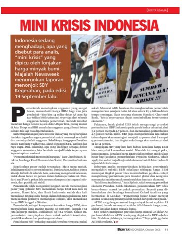 BERITAINDONESIA, Oktober 2005 11(BERITA UTAMA)Pemerintah menetapkan anggaran yang sangatbesar, mensubsidi harga BBM bagi 220 jutapenduduk—kira-kira 14 miliar dolar AS atau Rp140 triliun lebih tahun ini, sepertiga dari seluruhanggaran belanja pemerintah. Subsidi tersebutmembuat harga bensin 24 sen dolar AS per liter, paling murahdi Asia. Tetapi era BBM murah dan anggaran yang diberati bebansubsidi tak lagi bisa dipertahankan.Ini tentu pandangan para investor dunia yang mengharapkantindakan tegas dan segera pemerintah untuk memangkas subsididan menutup defisit anggaran. Sebaliknya, tanggapan PresidenSusilo Bambang Yudhoyono, akrab dipanggil SBY, lamban danragu-ragu. Dan, sekarang, apa yang dianggap sebagai defisitanggaran sementara, bisa berubah menjadi krisis kepercayaankepemimpinan nasional.“Pemerintah tidak memenuhi harapan,” kata Chatib Basri, direktur Lembaga Riset Ekonomi dan Sosial, Universitas Indonesia.Kegelisahan pasar sudah terungkap. Mata uang rupiah,kehilangan nilai 10 persen tahun ini. Bursa saham, tadinya punyakinerja terbaik di seluruh Asia, sekarang mengalami kelesuan,indek dasar turun 12 persen dalam beberapa bulan ini. Standard and Poor’s, pekan lalu menurunkan posisi ratingnya Indonesia, dari positif jadi stabil.Pemerintah telah mengambil langkah untuk menenangkanpasar yang gelisah: SBY menaikkan harga BBM rata-rata 29persen, Maret lalu, dan Bank Indonesia sudah dua kalimenaikkan tingkat suku bunga dalam beberapa pekan ini. SBYmenekankan perlunya memangkas subsidi, dan menaikkanharga BBM tanggal 1 Oktober.Pemerintah, sebagai kompensasi kenaikan harga BBM, akanmenyalurkan dana masing-masing Rp 100.000.- kepada 15,2juta keluarga miskin. Jumlahnya Rp 15,2 triliun. Selain itu,pemerintah menyiapkan dana untuk subsidi kesehatan,pendidikan dasar dan pembangunan desa.Pendekatan SBY terhadap masalah tersebut ternyata mahalsekali. Menurut ADB, bantuan itu mengharuskan pemerintahmengeluarkan 400 juta dolar AS atau setara Rp 4 triliun dalamtempo seminggu. Kata seorang ekonom Standard CharteredBank, “krisis kepercayaan dapat menimbulkan kemerosotanekonomi.”Faktanya, bank global UBS telah mengurangi proyeksipertumbuhan GDP Indonesia pada paruh kedua tahun ini, dari5,2 persen menjadi 4,7 persen, dan meramalkan pertumbuhan4,3 persen tahun 2006. UBS juga memperkirakan laju inflasitahun depan akan meningkat menjadi 12 persen dari 8 sampai9 persen tahun ini, dan tingkat suku bunga akan melompat dari12 ke 14 persen.Tanggapan SBY yang hati-hati bahwa kenaikan harga BBMbisa menyulut kerusuhan sosial. Masalah ini sangat peka;kenyataannya, kenaikan harga BBM telah memberi andil cukupbesar bagi jatuhnya pemerintahan Presiden Soeharto, tahun1998, dan sudah terjadi sejumlah demonstrasi di Jakarta dan disejumlah kota lainnya.Beberapa analis memperkirakan kebijakan pemerintahmengakhiri subsidi BBM sekaligus sehingga harga BBMmencapai tingkat pasar bisa menimbulkan gejolak—tetapimengimbangi permintaan para investor global dan keinginanmasyarakat miskin untuk membutuhkan bantuan ekonomi.“Ini dilema tradisional,” kata Sjahrir, salah seorang penasihatekonomi Presiden. Boleh dikatakan, pemerintahan SBY tidakbenar-benar masuk ke pokok persoalan. Seperti yang dikemukakan oleh lembaga konsultansi Oxford Analitica yangbermarkas di London: “Pemerintah benar-benar merajutasumsi-asumsi anggarannya lebih rendah dari perkiraan pasar.”APBN 2005 dengan asumsi harga minyak bumi 24 dolar ASper barel, berada 10 sampai 20 dolar AS di bawah harga pasar,akibat lonjakan harga minyak dunia.SBY sendiri meragukan proyeksi harga minyak 40 dolar ASper barel di dalam APBN 2006 yang diajukan ke DPR sebulanlalu. Di dalam pidatonya, ia mengatakan:”“Saya pikir 55 dolarAS lebih realistis.”■ SHMINI KRISIS INDONESIAIndonesia sedangmenghadapi, apa yangdisebut para analis,“mini krisis” yangdipicu oleh lonjakanharga minyak bumi.Majalah Newsweekmenurunkan laporanmenonjol: SBYKegerahan, pada edisi19 September lalu.