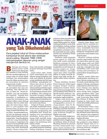 BERITAINDONESIA, Oktober 2005 65(BERITA FEATURE)Beberapa pria bersenjatakan jarum suntikberisi racun datang duahari sebelum Li Juan bersalin.Mereka membaringkannya ditempat tidur di sebuah kliniksetempat, dan menancapkanjarum ke dalam perutnya sampai menembus ke janinnyayang berusia 9 bulan.“Saat-saat pertama saya masih merasakan bayi saya menendang,” kata calon ibu berusia 23 tahun itu. “Sesaat kemudian, saya tak merasakandia bergerak.” Sepuluh harikemudian, Li melahirkan seorang bayi perempuan yangsedianya diberi nama Shuang(Cahaya). Bayi itu sudah mati.Agar dia benar-benar yakin,kata Li, para pejabat—darikawasan Linyi, di mana ia menetap, propinsi Shandong, China Timur—membenamkan mayat bayi itu beberapa menit didalam sebuah baskom air di sisitempat tidur. Yang dia pikirkanpada hari yang menyakitkanitu, kenang Li, bagaimana diamenyewa seorang bandit untukmembalas dendam pada orangorang yang telah membunuhbayinya, karena setiap kelahiran, kata mereka, melanggarprogram keluarga berencanaChina.Sejak tahun 1980, ketikaChina menerapkan apa yangdikenal sebagai kebijakan satuanak, para pejabat di propinsisering melakukan hal-hal yangberlebihan—memaksakan sterilisasi dan aborsi di antarapara pasangan—untuk menekan jumlah penduduk negeriyang berjumlah 1,3 miliar jiwaitu berkembang menjadi mimpi Malthus. Para petinggi pemerintah berupaya mengendalikan penduduk China untukmendorong pertumbuhan ekonomi dengan mengurangi jumlah mulut yang disuap.Tetapi di Prancis, pemerintah malah memberikan insentif dan bonus kepada para ibuyang mau mengandung danmelahirkan bayi. Prancis mengalami zero pertumbuhanpenduduk, karena para keluarga lebih memilih mengadopsi anak-anak dari negaranegara lain ketimbang melahirkan sendiri.Tahun 2002, tatkala kebebasan pribadi menyebar di bidangbidang kehidupan lainnya,parlemen China memilih untukmelonggarkan kebijakan yangsangat tidak populer itu. Selainmelarang kelahiran anak lebihdari kebijakan, undang-undangbaru melakukan pembaruan,mengizinkan pasangan memiliki anak lebih dari satu asalkanmereka mau membayar dendadalam jumlah besar.Dendanya untuk pasanganpetani seperti Li—USD 365atau lebih untuk tambahankelahiran pertama di Linyi,sekitar empat kali dari rata-ratapenghasilan bersih tahunan diprovinsi miskin itu. Tetapi,setidak-tidaknya, pasangansuami-istri China memilikipilihan di dalam masalah keluarga yang tidak mereka dapatkan tahun-tahun sebelumnya.Namun demikian, birokratPartai Komunis tidak begitutanggap dengan undangundang baru tersebut. Disamping peraturan, kemajuan karirpara pemimpin lokal, khusus didaerah-daerah pedesaan, masih sangat tergantung padapenekanan angka kelahiran.“Angka yang buruk padakepadatan penduduk dapatmenggagalkan promosi seorang pejabat,” kata Tu Bisheng, seorang aktivis hukumdi Beijing yang telah membantumendokumentasi pelanggaranyang berkaitan dengan kebijakan satu anak.Pada pertemuan tingkat provinsi, para pejabat Linyi dipersalahkan karena tingginya angka kelahiran ekstra di seluruhShandong. Karena itu, provinsitersebut melancarkan kampanye brutal sterilisasi danaborsi paksa bertahun-tahun.Para pejabat lokal di China melancarkankampanye brutal aborsi dan strelisasisecara paksa. Majalah TIME (19/9)menyampaikan laporan yang sangatmenyentuh berikut ini.yang Tak DikehendakiANAK-ANAK Dimulai bulan Maret, parapejabat KB di sembilan kecamatan dan tiga kabupatenLinyi, menjelajahi desa-desauntuk mencari para ibu yangkedapatan mengandung anakanak kedua untuk diaborsi dandisteril paksa.Menurut undang-undangtersebut yang berlaku di hampir semua desa, para ibu yangsudah punya anak satu tidakdiperbolehkan mengandunganak lagi, sedangkan ibu yangmelahirkan anak cacad atauseorang anak perempuan, diperkenankan mengandung bayi kedua.Banyak wanita tidak maumelaksanakan ketentuan tersebut. Mereka sering sembunyidi rumah-rumah keluarga. Paraanggota keluarga perempuanyang melawan aborsi dan sterilisasi ditahan atau dipaksamembayar “biaya belajar dimana mereka harus mengakupunya pemikiran salah,” kataTeng Biao, seorang instrukturpada Universitas Ilmu Politikdan Hukum di Beijing, berkunjung ke Linyi bulan laluuntuk menyelidiki pelaksanaankampanye tersebut.Di kecamatan Yinan, Linyi,sekurang-kurangnya 7.000pasangan dipaksa melaksanakan sterilisasi antara Maret danJuli, menurut para pengacarayang berbicara kepada parapejabat KB lokal.Beberapa penduduk desadan pengacara yang didakwadipukul sampai mati di tahanan karena membantukeluarga-keluarga menghindari sterilisasi. ■ SH(BERITA FEATURE)DEMO ANTI ABORSI