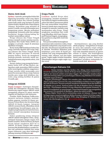 BERITA MANCANEGARA56 BERITAINDONESIA, Januari 2006Demo Anti-ArabSydney: Australia pertengahan bulan laludiguncang kerusuhan rasial yang dipicuoleh berita bahwa dua relawan penjagapantai kulit putih yang bertugas di pantaiselatan Sydney dipukul oleh warga imigranLibanon. Kerusuhan yang menjalar dipantai Cronulla, merusak ketenangan parapengunjung pantai. Mereka melemparipengunjung, termasuk polisi dan petugaskesehatan, dengan kaleng-kaleng birsembari meneriakkan antiras.Warga Libanon dan Timur Tengahlainnya menjadi sasaran amukan mereka.Kepolisian New South Wales (NSW) menangkap 12 perusuh, empat di antaranyadijadikan tersangka.Berita-berita SMS bertebaran bahwa duawarga Australia dipukul oleh warga imigran Libanon dan Timur Tengah. BeritaSMS itu segera menyebar di seluruhpenjuru Sydney. Pesan itu menghasutpemuda-pemuda Australia untuk memukuli keturunan yang mereka sebut, Lebsand Wogs.Harian Indopos yang mengutip kantorkantor berita AFP, AP dan Reuters, melaporkan sejak munculnya SMS tersebut,polisi menyiagakan puluhan anggotanya.Tetapi mereka tidak menyangka parapenyerbu mencapai ribuan orang. Sasaranmereka para warga Arab kelahiran Australia yang sedang berlibur di pantaiCronulla. ■ SHIntegrasi ASEANKuala Lumpur: Tantangan ekonomipolitik dan kebangkitan ekonomi Chinamendorong negara-negara ASEAN untukmenggalang integrasi di antara mereka.Gagasan ini dipelopori oleh Indonesia.Presiden Susilo Bambang Yudhoyono,menurut wartawan Indopos, menyampaikan gagasan tersebut di depan pertemuan Forum Bisnis dan Investasi ketigaASEAN di Kuala Lumpur. IntegrasiASEAN, menurut Susilo, dibutuhkan untukmengimbangi kecendrungan yang meningkat pengelompokan di suatu kawasan,selain inisiatif menciptakan keamananbersama.Faktor pendorong utama integrasiASEAN adalah kebangkitan China, mengantisipasi kerjasama dengan negara tiraibambu tersebut. Susilo berbicara di depanforum dalam rangkaian KTT ke-11ASEAN. Di Kuala Lumpur SBY sempatbertemu PM Abdullah Badawi, membicarakan soal perbatasan Ambalat dan warganegara Indonesia yang akan kehilanganpeluang menetap di Malaysia. ■ SHPenerbangan Rahasia CIALondon: Badan Intelijen Amerika Serikat, CIA, diduga telah memindahkanteroris ke sejumlah penjara rahasia di Eropa lewat penerbangan misteriusnya.Dugaan ini muncul setelah surat kabar Inggris The Guardian membocorkandokumen tentang sekitar 300 penerbangan rahasia yang dilakukan CIA melaluisejumlah negara di Eropa.Dugaan penerbangan rahasia CIA semakin jelas. Surat kabar Perancis LeFigaro melaporkan pesawat CIA yang memindahkan terdakwa teroris singgahdua kali di Perancis. Pesawat pertama mendarat di Bandara Brest dari Keflavikdi Islandia (31/3-2002). Pesawat kedua CIA tiba di Bandara Paris Le Bourgetdari Oslo. Penerbangan rahasia CIA juga dilaporkan oleh pejabat Denmark, dimana CIA melakukan 20 penerbangan. Pemerintah Hongaria juga mengatakandua pesawat CIA mendarat di Budapest dalam dua tahun terakhir.Human Rights Watch, (31/11) menyiarkan nama 26 tahanan ‘siluman’ dariberbagai negara yang kemungkinan disiksa di penjara rahasia CIA di luar negeri.Dari 26 nama itu terdapat Hambali, WNI, yang ditangkap di Thailand (11/8-2003), lalu diterbangkan ke AS. ■ AFP, AP, REUTERS, KOMPAS, SHEropa PanikLondon: Apakah Eropa akanterpanggang—ataukah membeku?Para ilmuwan Inggris membenarkanpekan lalu bahwa pemanasan globalbisa saja menurunkan temperatur,karena es kutub utara yang mencair,mengalir ke samudra-samudra yangmemanaskan suhu Eropa. Tetapipengkajian mendalam dari studiyang dihasilkan oleh Pusat Oseanografi Nasional Inggris, mengungkapkan gambaran yang lebih rumit dantidak pasti.Para periset melihat kemungkinanpenurunan suhu sementara waktu, tetapibukanlah malapetaka yang terjadi secaratiba-tiba. Tim ilmuwan meneliti lima titikdi Atlantik. Penelitian dilakukan padakedalaman 4.000 meter di bawah permukaan laut yang mengumpulkan datatentang; suhu, tekanan, arus dan kadargaram. Angka-angka tersebut kemudiandibandingkan dengan angka-angka 1957dan 2004.Kesimpulannya; apa yang disebutsabuk pengisap—mengalirkan air hangatke utara dari samudra tropis sebagaibagian dari sirkulasi raksasa yang membuat suhu Antarktik menurun 30 persenselama 12 tahun. Ada kemungkinanpemanasan global bisa membuat buntusabuk pengisap tersebut. Namun kemungkinan terjadinya malapetaka kebekuan masih jauh. ■ Newsweek, SH