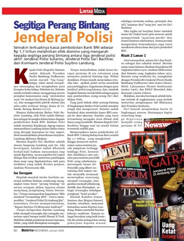 LINTAS MEDIA60 BERITAINDONESIA, Januari 2006Segitiga Perang BintangKepala Polri (Kapolri) Sutantosudah didesak PresidenSusilo Bambang Yudhoyonountuk meraih “big bang”ketiga, yakni untuk secepatnya menangkap dan menghukum parakoruptor kelas kakap. Sebelum ini, Sutantosudah terbukti sukses menggulung terorispenjahat kemanusian sang “demolotionman” Dr Azahari bin Husin di Malang (9/11), dan menggerebek pabrik ekstasi dansabu-sabu terbesar ketiga dunia di Cikande, Serang, Banten (11/11).Mantan Kabareskrim Mabes Polri Suyitno Landung, oleh Polri sudah ditetapkan sebagai tersangka dalam kasus dugaanpembobolon Bank BNI. Bahkan Polrisudah meminta Kejaksaan Agung supayamemasukkan Landung dalam daftar namayang dicegah bepergian ke luar negeri,demi memudahkan pemeriksaan lanjutan.Landung akhirnya ditahan.Mantan Kapolri Da’i Bachtiar adalahatasan langsung Landung saat itu. Adakecurigaan, kendati sudah dibantahberkali-kali bahkan menyatakan siapuntuk diperiksa, secara pipeline Da’i patutdiduga ikut terlibat menerima pembagiandana suap yang digelontorkan oleh paraterdakwa yang sudah divonis penjara,Andrian Waworuntu dkk.Isu SeragamMajalah-majalah berita berskala nasional terbitan ibukota cenderung mengangkat tema besar “perang bintang” inisecara seragam dalam laporan utamamenjelang penghujung bulan Desember.”Tempo memaparkan bagaimana “BilaJenderal Tersandung BNI”. Gatra memprediksi, “Jenderal Polisi Di Ambang Bui”,sementara Forum mempertanyakan,“Kapan Suyitno CS Menyusul Andrian?”Tempo melaporkan Suyitno Landungtelah menjadi tersangka dan mengaku menerima upeti berupa mobil Nissan X-Trail.Mobil itu adalah pemberian kawan lamanya,Ishak, yang telah ditetapkan tersangka.Tempo menyebutkan inilah kasus korupsi pertama di era reformasi yangmenyeret jenderal bintang tiga. Walaudemikian Tempo masih menyisakan retorika lain, apakah polisi serius menelisikpara petingginya, bagaimana dengan parajenderal polisi yang lainnya, dan, ataukahlangkah Sutanto ini tak lebih sebagai upayasaja pembersihan orang-orang Da’i dariMabes Polri.Yang pasti babak akhir perang bintangdi lingkungan Mabes Polri sudah semakinsengit dan mengerucut. Sutanto sudahbertekad akan membuka kasus BNI sampai ke akar-akarnya. Suyitno yang turuttersandung mengaku stres dibuat olehkasus yang membelit. Mantan Kapolri Da’iBachtiar hingga saat ini masih belumtersentuh sedikti pun.Menyeruaknya kasus pembobolan LCBank BNI Cabang Kebayoran Baru senilaiRp 1,7 triliun, yang mengkristalhingga menyeret-nyeretnama-nama mantan pucuk pimpinan tertinggilembaga Polri, berawaldari disidiknya satu persatu para mantan penyidikPolri yang sebelumnyamenangani kasus ini.Penyidik yang diberi wewenang oleh negara untuk menyidik termasukmenetapkan seseorangmenjadi tersangka, kini,gantian menjadi pihakyangdisidik dan ditetapkan sebagai tersangka sekaliguspenghuni “hotel prodeo”.Setelah Kombes IrmanSantoso dan Brigjen SamuelIsmoko, misalnya, menyusulkemudian nama Suyitno Landung. Bukan mustahil Suyitnobekerja sendirian. Namun sebagai bawahan yang baik tentulah dia selalu melaporkan setiappekerjaan kepada atasan,sekaligus meminta arahan, petunjuk, danACC lanjutan dari”‘sang bos’ saat itu Da’iBachtiar.Jika logika ini berjalan linier tentulahnama Da’i bakal turut pula terseret untukmemperindah “nyanyian merdu” dariIrman Santoso sebelumnya. Irman pernahmengatakan komandannya juga turutmenikmati aliran dana dari para pembobolBNI.Kisah 2 Lawan 1Gatra menyebut, antara Da’i dan Suyitno sebagai dua sahabat kental. Merekasama-sama lulusan Akademi Kepolisian RIAngkatan tahun 1972, setahun lebih seniordari Sutanto yang Angkatan tahun 1973.Sutanto yang sendirian itu, seangkatandengan Presiden RI Jenderal (Purn) SusiloBambang Yudhoyono (dari matra Darat),KSAL Laksamana Slamet Soebiyanto(matra Laut), dan KSAU Marsekal JokoSoeyanto (matra Udara).Malahan, mereka berempat adalah lulusan terbaik di angkatannya yang berhakmenerima penghargaan Adi Makayasadari Presiden Soeharto.Da’i banyak menjalankan karier dilingkungan reserse. Bintangnya begitucemerlang hingga dipercayamenjadi orangpertama di TriJenderal PolisiSemakin terkuaknya kasus pembobolan Bank BNI sebesarRp 1,7 triliun melahirkan efek domino yang mengarahkepada segitiga perang bintang antara tiga jenderal polisiaktif: Jenderal Polisi Sutanto, Jenderal Polisi Da’i Bachtiar,dan Komisaris Jenderal Polisi Suyitno Landung.