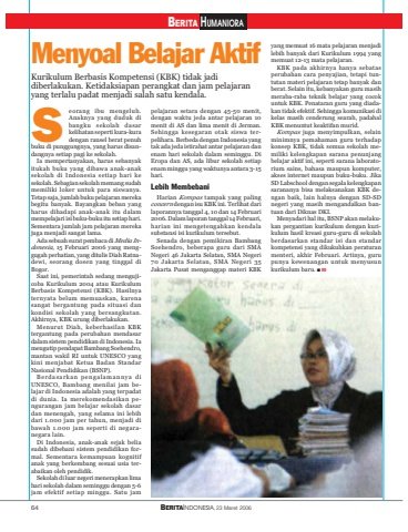 BERITA HUMANIORA64 BERITAINDONESIA, 23 Maret 2006Seorang ibu mengeluh.Anaknya yang duduk dibangku sekolah dasarkelihatan seperti kura-kuradengan ransel berat penuhbuku di punggungnya, yang harus disandangnya setiap pagi ke sekolah.Ia mempertanyakan, harus sebanyakitukah buku yang dibawa anak-anaksekolah di Indonesia setiap hari kesekolah. Sebagian sekolah memang sudahmemiliki loker untuk para siswanya.Tetap saja, jumlah buku pelajaran merekabegitu banyak. Bayangkan beban yangharus dihadapi anak-anak itu dalammempelajari isi buku-buku itu setiap hari.Sementara jumlah jam pelajaran merekajuga menjadi sangat lama.Ada sebuah surat pembaca di Media Indonesia, 15 Februari 2006 yang menggugah perhatian, yang ditulis Diah Ratnadewi, seorang dosen yang tinggal diBogor.Saat ini, pemerintah sedang mengujicoba Kurikulum 2004 atau KurikulumBerbasis Kompetensi (KBK). Hasilnyaternyata belum memuaskan, karenasangat bergantung pada situasi dankondisi sekolah yang bersangkutan.Akhirnya, KBK urung diberlakukan.Menurut Diah, keberhasilan KBKtergantung pada perubahan mendasardalam sistem pendidikan di Indonesia. Iamengutip pendapat Bambang Soehendro,mantan wakil RI untuk UNESCO yangkini menjabat Ketua Badan StandarNasional Pendidikan (BSNP).Berdasarkan pengalamannya diUNESCO, Bambang menilai jam belajar di Indonesia adalah yang terpadatdi dunia. Ia merekomendasikan pengurangan jam belajar sekolah dasardan menengah, yang selama ini lebihdari 1.000 jam per tahun, menjadi dibawah 1.000 jam seperti di negaranegara lain.Di Indonesia, anak-anak sejak beliasudah dibebani sistem pendidikan formal. Sementara kemampuan kognitifanak yang berkembang sesuai usia terabaikan oleh pendidik.Sekolah di luar negeri menerapkan limahari sekolah dalam seminggu dengan 5-6jam efektif setiap minggu. Satu jampelajaran setara dengan 45-50 menit,dengan waktu jeda antar pelajaran 10menit di AS dan lima menit di Jerman.Sehingga kesegaran otak siswa terpelihara. Berbeda dengan Indonesia yangtak ada jeda istirahat antar pelajaran danenam hari sekolah dalam seminggu. DiEropa dan AS, ada libur sekolah setiapenam minggu yang waktunya antara 3-15hari.Lebih MembebaniHarian Kompas tampak yang palingconcern dengan isu KBK ini. Terlihat darilaporannya tanggal 4, 10 dan 14 Februari2006. Dalam laporan tanggal 14 Februari,harian ini mengetengahkan kendalasubstansi isi kurikulum tersebut.Senada dengan pemikiran BambangSoehendro, beberapa guru dari SMANegeri 46 Jakarta Selatan, SMA Negeri70 Jakarta Selatan, SMA Negeri 35Jakarta Pusat menganggap materi KBKMenyoal Belajar AktifKurikulum Berbasis Kompetensi (KBK) tidak jadidiberlakukan. Ketidaksiapan perangkat dan jam pelajaranyang terlalu padat menjadi salah satu kendala.yang memuat 16 mata pelajaran menjadilebih banyak dari Kurikulum 1994 yangmemuat 12-13 mata pelajaran.KBK pada akhirnya hanya sebatasperubahan cara penyajian, tetapi tuntutan materi pelajaran tetap banyak danberat. Selain itu, kebanyakan guru masihmeraba-raba teknik belajar yang cocokuntuk KBK. Penataran guru yang diadakan tidak efektif. Sehingga komunikasi dikelas masih cenderung searah, padahalKBK menuntut keaktifan murid.Kompas juga menyimpulkan, selainminimnya pemahaman guru terhadapkonsep KBK, tidak semua sekolah memiliki kelengkapan sarana penunjangbelajar aktif ini, seperti sarana laboratorium sains, bahasa maupun komputer,akses internet maupun buku-buku. JikaSD Labschool dengan segala kelengkapansarananya bisa melaksanakan KBK dengan baik, lain halnya dengan SD-SDnegeri yang masih mengandalkan bantuan dari Diknas DKI.Menyadari hal itu, BSNP akan melakukan pergantian kurikulum dengan kurikulum hasil kreasi guru-guru di sekolahberdasarkan standar isi dan standarkompetensi yang dikukuhkan peraturanmenteri, akhir Februari. Artinya, gurupunya kewenangan untuk menyusunkurikulum baru. ■ RH