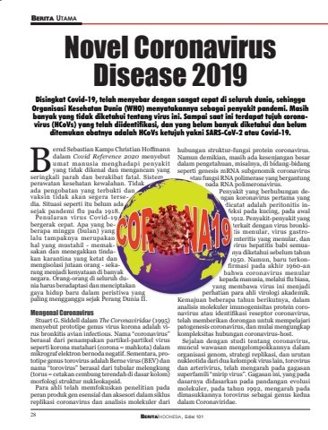 28 BERITAINDONESIA, Edisi 101BERITA UTAMA28Bernd Sebastian Kamps Christian Hoff mann dalam Covid Reference 2020 menyebut umat manusia menghadapi penyakit yang tidak dikenal dan mengancam yang seringkali parah dan berakibat fatal. Sistem perawatan kesehatan kewalahan. Tidak ada pengobatan yang terbukti dan vaksin tidak akan segera tersedia. Situasi seperti itu belum ada sejak pandemi flu pada 1918.Penularan virus Covid-19 bergerak cepat. Apa yang beberapa minggu (bulan) yang lalu tampaknya merupakan hal yang mustahil - memaksakan dan menegakkan tindakan karantina yang ketat dan mengisolasi jutaan orang - sekarang menjadi kenyataan di banyak negara. Orang-orang di seluruh dunia harus beradaptasi dan menciptakan gaya hidup baru dalam peristiwa yang paling mengganggu sejak Perang Dunia II.Mengenal CoronavirusStuart G. Siddell dalam The Coronaviridae (1995) menyebut prototipe genus virus korona adalah virus bronkitis avian infectious. Nama “coronavirus” berasal dari penampakan partikel-partikel virus seperti korona matahari (corona = mahkota) dalam mikrograf elektron bernoda negatif. Sementara, prototipe genus torovirus adalah Berne virus (BEV) dan nama “torovirus” berasal dari tubular melengkung (torus = cetakan cembung terendah di dasar kolom) morfologi struktur nukleokapsid. Para ahli telah memfokuskan penelitian pada peran produk gen esensial dan aksesori dalam siklus replikasi coronavirus dan analisis molekuler dari Novel Coronavirus Disease 2019Disingkat Covid-19, telah menyebar dengan sangat cepat di seluruh dunia, sehingga Organisasi Kesehatan Dunia (WHO) menyatakannya sebagai penyakit pandemi. Masih banyak yang tidak diketahui tentang virus ini. Sampai saat ini terdapat tujuh coronavirus (HCoVs) yang telah diidentifikasi, dan yang belum banyak diketahui dan belum ditemukan obatnya adalah HCoVs ketujuh yakni SARS-CoV-2 atau Covid-19.hubungan struktur-fungsi protein coronavirus. Namun demikian, masih ada kesenjangan besar dalam pengetahuan, misalnya, di bidang-bidang seperti genesis mRNA subgenomik coronavirus atau fungsi RNA polimerase yang bergantung pada RNA polimeronavirus.Penyakit yang berhubungan dengan koronavirus pertama yang dicatat adalah peritonitis infeksi pada kucing, pada awal 1912. Penyakit-penyakit yang terkait dengan virus bronkitis menular, virus gastroenteritis yang menular, dan virus hepatitis babi semuanya diketahui sebelum tahun 1950. Namun, baru terkonfirmasi pada akhir 1960-an bahwa coronavirus menular kepada manusia, melalui fl u biasa, yang membawa virus ini menjadi perhatian para ahli virologi akademik. Kemajuan beberapa tahun berikutnya, dalam analisis molekuler imunogenisitas protein coronavirus atau identifi kasi reseptor coronavirus, telah memberikan dorongan untuk mempelajari patogenesis coronavirus, dan mulai mengungkap kompleksitas hubungan coronavirus-host.Sejalan dengan studi tentang coronavirus, muncul wawasan mengelompokkannya dalam organisasi genom, strategi replikasi, dan urutan nukleotida dari dua kelompok virus lain, torovirus dan arterivirus, telah mengarah pada gagasan superfamili “mirip virus”. Gagasan ini, yang pada dasarnya didasarkan pada pandangan evolusi molekuler, pada tahun 1992, mengarah pada dimasukkannya torovirus sebagai genus kedua dalam Coronaviridae.