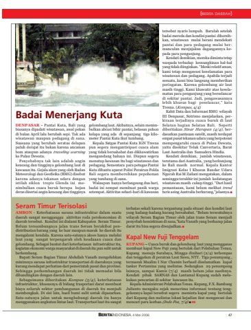 (BERITA DAERAH)BERITAINDONESIA, 4 Mei 2006 47DENPASAR - Pantai Kuta, Bali yangbiasanya dipadati wisatawan, awal pekandi bulan April lalu berubah sepi. Tak adawisatawan maupun pedagang di sana.Suasana yang berubah seratus delapanpuluh derajat itu bukan karena ancamanbom ataupun adanya traveling warningke Pulau Dewata.Penyebabnya tak lain adalah anginkencang dan tingginya gelombang laut dikawasan itu. Gejala alam yang oleh BadanMeteorologi dan Geofisika (BMG) disebutkarena adanya tekanan udara denganistilah siklon tropis Glenda ini menimbulkan cuaca buruk berupa hujanderas disertai angin kencang dan tingginyagelombang laut. Akibatnya, selain menimbulkan abrasi bibir pantai, belasan pohonkelapa yang ada di sepanjang tiga kilometer Pantai Kuta ikut tumbang.Kepala Satgas Pantai Kuta IGN Tresnapun segera mengantisipasi cuaca alamyang tidak bersahabat dan dikhawatirkanmengundang bahaya ini. Diapun segeramenutup kawasan itu bagi wisatawan danpedagang. Sementara para petugas PantaiKuta dibantu aparat Polisi Perairan PoldaBali segera membersihkan pepohonanyang tumbang di sana.Walaupun hanya berlangsung dua hari,badai ini sempat membuat panik wargasetempat. Aktivitas sehari-hari di kawasantersebut nyaris lumpuh. Barulah setelahbadai mereda dan kondisi pantai dibersihkan, wisatawan mulai berani mendekatipantai dan para pedagang mulai bermunculan menjajakan dagangannya kepada para pengunjung.Kendati demikian, mereka diminta tetapwaspada terhadap kemungkinan hal-halyang tidak diinginkan. “Meski relatif aman,kami tetap mengawasi keselamatan parawisatawan dan pedagang. Apabila terjadisesuatu, kami bisa langsung memberikanperingatan. Karena gelombang air lautmasih tinggi. Kami khawatir atas keselamatan para pengunjung yang berselancardi sekitar pantai. Jadi, pengawasannyalebih khusus bagi peselancar,” kataTresna. (Kompas, 4/4)Kabit Data dan Informasi BMG wilayahIII Denpasar, Sutrisno menjelaskan, perkiraan terjadinya cuaca buruk di lautSelatan bagian Selatan Bali. Sepertidiberitakan Sinar Harapan (4/4), berdasarkan pantauan satelit, masih terdapatempat pusat tekanan udara yang berpotensimempengaruhi cuaca di Pulau Dewata,yaitu disekitar Teluk Canvertaria, BaratLaut Australia dan Samudera Hindia.Kendati demikian, jumlah wisatawan,terutama dari Australia, yang berkunjungke Bali masih normal. Kepala KantorImigrasi Kelas I Khusus Bandar UdaraNgurah Rai M Zailani mengatakan, dalamseminggu terakhir ini jumlah kedatanganwisatawan masih cukup tinggi. “Dari hasilpemantauan, kami belum melihat trendturis asing Australia berkurang,”jelasnya.■Badai Menerjang KutaSeram Timur TerisolasiAMBON - Keterbatasan sarana infrastruktur dalam suatudaerah sangat mengganggu aktivitas roda perekonomian didaerah tersebut. Kondisi ini dialami Kabupaten Seram Timur.Belum tersambungnya jalan trans Seram berakibat pendistribusian barang yang ke luar maupun masuk ke daerah itumengalami kendala. Karena satu-satunya akses hanya melaluilaut yang sangat terpengaruh oleh keadaaan cuaca dangelombang. Sebagai buntut dari keterbatasan infrastruktur itu,kegiatan ekonomi warga masyarakat di daerah itu pun sulit untukberkembang.Bupati Seram Bagian Timur Abdullah Vanath mengeluhkanminimnya sarana infrastruktur transportasi di daerahnya yangkurang mendapat perhatian dari pemerintah pusat dan provinsi.Sehingga perkembangan daerah ini tidak memadai biladibandingkan dengan daerah lain.Sebagaimana diberitakan Kompas (5/4), keterbatasaninfrastruktur, khususnya di bidang trasportasi darat membuatbiaya seluruh sektor pembangunan di daerah itu menjadimembengkak. Di sisi lain, hasil bumi sulit untuk dipasarkan.Satu-satunya jalan untuk menghubungi daerah itu hanyamenggunakan angkutan lintas laut. Transportasi laut itu sangatterbatas sekali karena tergantung pada situasi dan kondisi lautyang kadang-kadang kurang bersahabat. “Belum tersentuhnyawilayah Seram Bagian Timur oleh jalan trans Seram menjadipenyebab kemiskinan di sana,”kata Vanath yang berharap jalandarat itu bisa segera diwujudkan.■Kapal New Fuji TenggelamKUPANG – Cuaca buruk dan gelombang laut yang mengganasmembuat kapal New Fuji yang bertolak dari Pelabuhan Tenau,Kupang menuju Surabaya, Minggu dinihari (2/4) terhempasdan tenggelam di perairan Laut Sawu, NTT. Tiga penumpang ,termasuk Mualim I Nur Chamin berhasil diselamatkan kapaltanker Pertamina yang melintas. Sedangkan 29 penumpanglainnya, sampai Kamis (7/4) masih belum jelas nasibnya.Kendati pihak SARNAS dan Lantamal Kupang sudah melakukan pencarian di sekitar kawasan itu.Kepala Administrasi Pelabuhan Tenau. Kupang, F.X. BambangJulianto mengaku sejak menerima informasi tentang tenggelamnya kapal tersebut segera meminta kapal yang bertolakdari Kupang dan melintas lokasi kejadian ikut mengawasi danmencari para korban.(Indo Pos, 7/4) ■ AM