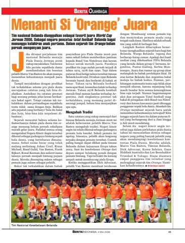 BERITAINDONESIA, 4 Mei 2006 49BERITA O (BERITA OLAHRAGA) LAHRAGAJika dirunut perjalanan timnasional Belanda menujuPiala Dunia Jerman 2006cukup meyakinkan. Tak heranbila pecinta sepakbola duniamendambakan tim besutanpelatih Marco Van Basten itu akan mampumenembus kebuntunnya menjadi juaradunia.Tampil meyakinkan dengan predikattak terkalahkan selama pra piala duniamerupakan catatan yang tak bisa diabaikan. Andaikan itu catatan prestasibagi seorang petinju jelas lawan berikutnya bakal ngeri. Tetapi catatan tak terkalahkan dalam pertandingan sepakbolatentu tidak sama dengan tinju. Bahkanada pepatah yang berbunyi ‘bola itu bulatdan licin, bisa-bisa kita terpeleset dibuatnya’.Sejarah mencatat bahwa selama keikutsertaanya dalam piala dunia tim orange memang belum pernah sekalipunmaraih gelar juara. Padahal semua orangmengetahui Negara Kincir Angin tersebutdikenal sebagai gudangnya bintang sepakbola dunia, yang bertebaran dimanamana. Sebut nama besar yang telahmalang melintang Johan Cruif, RinusMichael, Ruud Gulid, Van Basten, FrankRijkart, Ronal Koeman dan sederet namalainnya pernah menjadi bintang pujaandunia. Mereka disamping sukses sebagaipemain juga sukses sebagai pelatih.Rekor tak terkalahkan dalam babakpenyisihan pra Piala Dunia 2006 punsama sekali belum memberikan jaminankepada Ruud Van Nistelrooy dan kawankawan untuk meraih juara. Pasalnyapredikat itu juga sudah pernah terjadi ditahun 1974, 1978 dan 1990. Tapi dalamputaran final ketiga tahun tersebut timnasBelanda keok total. Di tahun 1990 Belandabermain buruk dan berhenti di babak 16besar. Tahun 1974 Belanda berhasilmencapai final, kemudian kalah terhadapJerman. Tahun 1978 Belanda kembalimeraih final namun kandas terhadap Argentina. Jadi singkatnya prestasi takterkalahkan, yang memang patut diancungi jempol, belum bisa menjanjikanapa-apa.Mengubah TradisiSatu catatan yang cukup menonjol daritimnas Belanda menuju Jerman 2006 iniadalah keberanian pelatih Marco VanBasten mengubah tradisi. Negeri kincirangin ini selalu dikenal sebagai gudangnyapemain bola handal. Sekali pemain iningetop, biasanya, pelatih akan langsungterpaku dengan pemain tersebut. Contohpaling hangat dapat dilihat pada timnasBelanda dalam kejuaraan Eropa tahun2004. Saat itu kesebelasan Orange daridepan sampai belakang penuh denganpemain bintang. Tapi terbukti itu kurangampuh untuk memboyong piala Eropa.Ketika menggantikan Dick Advocaat,pelatih Van Basten membuat terobosanMenanti Si ‘Orange’ JuaraTim nasional Belanda diunggulkan sebagai favorit juara World CupJerman 2006. Sebagai negara pencetus total football Belanda bagaimenunggu kelahiran anak pertama. Dalam sejarah tim Orange belumpernah mengenyam juara.dengan ‘Membuang’ semua pemain topdan menyisakan pemain muda yangtengah naik daun. Hasilnya adalah sebuahtim yang solid di berbagai lini.Langkah Basten diharapkan benarbenar menghasilkan sejarah baru bagi timBelanda. Warga Belanda tegang danberharap-harap cemas. Apalagi dari hasilundian yang dikeluarkan FIFA Belandayang berada dalam group C bersama Argentina, Pantai Gading, Serbia Montenegro. Juara dan runner up group akanmelangkah ke babak perdelapan final. Diatas kertas Belanda dan Argentina bakalmelaju ke babak kedua. Namun, perhitungan matematis tentu saja tidak akanmenjadi ukuran, karena sepanjang bolamasih bundar licin semua kemungkinanbisa saja terjadi. Namun bagaimanapunaksi dan peragaan Total football yangbakal di peragakan oleh Ruud van Nistelrooy dan kawan kawannya pasti ditunggupenggemar sepak bola dunia. Akankah timOrenge membuat sejarah baru untukmenembus kebuntuannya terwujud? Kitatunggu sejarah baru itu dalam putaran final yang berlangsung dari 9 Juni hingga9 Juli 2006 mendatang.Selain itu negeri kincir angin tersebut juga dalam perlehatan piala duniatahun ini mencatatkan dirinya sebagainegara yang paling banyak pelatih yangakan mendampingi kesebelasan kontestan Piala Dunia. Mereka adalah,Marco Van Basten, Timnas Belanda,Dick Advocaat, Korea Selatan, GuusHiddink Australia dan Leo BeenhakkerTrinidad & Tobago. Siapa diantaraempat punggawa tim tersebut yangmelengkapi sejarah tim Orange. Nantikan kehadirannya. ■ SB (berbagai sumber)Tim Nasional Kesebelasan Belanda