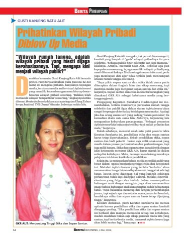 52 BERITAINDONESIA, 4 Mei 2006BERITA PEREMPUANDemikian komentar Gusti Kanjeng Ratu Alit bernadaprotes. Putri tertua Sinuhun Paku Buwono Ke XII(alm) ini mengaku prihatin, banyaknya tayanganmedia, terutama media audio visual infotainmentyang memiliki kecenderungan memblow up besarbesaran wilayah pribadi sesorang. “Bahkan telahmemasuki wilayah ‘tempat tidur’ seseorang,” ungkapnya ketikaditemui Berita Indonesia dalam acara peringatan Ulang Tahunke-59 Jenderal TNI (Purn) Wiranto, beberapa waktu lalu.GUSTI KANJENG RATU ALITGKR ALIT: Menjunjung Tinggi Etika dan Sopan Santun.Gusti Kanjeng Ratu Alit mengaku, tak pernah bisa mengerti,kendati yang banyak di ‘goda’ wilayah pribadinya itu paraselebritis. “Sebagai publik figur, selebritis kan juga manusia,”kilahnya. Artinya, menurut GKR Alit, sebesar apa punkepopuleran seseorang, ia juga memiliki wilayah pribadi yangmesti dihormati haknya. Media sebagai sarana informasi, perlujuga membatasi diri agar tidak terlalu jauh mencampuriurusan rumah tangga seseorang.“Saya pikir sopan santun dan etika tidak cuma perluditerapkan dalam tingkah laku dan sikap seseorang, tapimestinya media juga menganut sopan santun dan etika ini,”lanjutnya. Sopan santun dan etika media itu barangkali yangdimaksud GKR Alit sebagai kebebasan media yang bertanggungjawab.Pengageng Kaputren Surakarta Hadiningrat ini menambahkan, terlalu diumbarnya persoalan rumah tanggaselebritis dan publik figur dalam siaran infotainment akansangat berpengaruh terhadap kehidupan masyarakat. Apalagijika dua orang suami-istri yang sedang ‘dalam persoalan’ itukemudian diadu satu sama lain. Akhirnya, terpancing lalumengumbar keburukan pasangannya. “Sebagai penontoninfotainment kita bukannya terhibur tapi malah prihatin danmalu,” lanjutnya.Itulah sebabnya, menurut salah satu putri pewaris tahtaKeraton Surakarta ini, pendidikan etika dan sopan santunharus tetap dipertahankan. Sebab pendidikan etika, sopansantun dan budi pekerti bukan saja milik anak-anak yangmasih dalam proses pertumbuhan dan perkembangan, tapijuga milik bangsa. Etika dan sopan santun yang identik denganadat ketimuran menurut GKR Alit, harus masuk ke dalamsetiap lini kehidupan. Maka, ia sangat mendukung masuknyapelajaran ini dalam kurikulum pendidikan.Selain itu, ia menegaskan bahwa media memiliki andil yangbesar dalam upaya menjunjung tinggi etika dan kesopananini. Melalui infotainment yang terlalu ‘terbuka’ akanmenanamkan image bahwa wilayah rumah tangga tak ada lagibatas, kawin cerai dianggap hal yang lumrah sehinggaperkawinan tidak lagi dianggap saktral. Melalui sinetronsinetron yang fulgar dan terlalu bebas menempatkanhubungan anak dengan orangtua, juga akan menanamkanimage bahwa hubungan anak dan orangtua sudah bebas tanpabatas. “Saya bukannya menutup diri dengan perkembanganjaman, tapi sejauh apa dan sebatas mana jaman ini berubah,hendaknya etika dan sopan santun harus tetap dijunjungtinggi,” lanjutnya.Kendati demikian, putri Keraton Surakarta ini merasaoptimis karena pendidikan etika dan sopan santun kembalidianggap penting. “Jika pendidikan etika dan sopan santunini berhasil dan mampu memasuki setiap lini kehidupan,mudah-mudahan bukan saja sikap generasi muda kita yangsantun, tapi berita-berita media, termasuk infotainment jugaakan lebih santun lagi,” harapnya. ■ AD, SR“Wilayah rumah tangga, adalahwilayah pribadi yang mesti dijagakerahasiaannya. Tapi, mengapa kinimenjadi wilayah publik?”Prihatinkan Wilayah PribadiDiblow Up Media