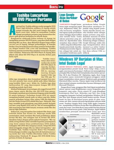 BERITA IPTEK54 BERITAINDONESIA, 4 Mei 2006Toshiba LuncurkanHD DVD Player PertamaAwal April ini, Toshiba akhirnya mulai menggelar DVDPlayer high-definition miliknya di Jepang setelahsempat tertunda dua kali (awal Januari dan akhirMaret 2006 lalu). Debut ini menjadikan Toshibasebagai perusahaan pertama yang menawarkan discplayer optik generasi berikutnya ke seluruh dunia.Konglomerat elektronik kedua terbesar di Jepang itumengatakan pemutar HD DVD anyar, yang akan diadu denganteknologi Blu-ray Sony, akan dibandrol dengan harga sekitar110.000 yen di Jepang. Sebagai perbandingan, di AmerikaSerikat, Sony bermaksud menawarkan pemutar berbasis Bluray dengan bandrol US$ 1.000 Juli mendatang. Toshibaberharap pemutar tersebut bisa memberi warna baru di pasarvideo rumahan. Peluncuran HD DVD Player di Jepang akandiikuti oleh debut HD DVD Player di Amerika Serikat padabulan April.Toshiba rencananya akan menawarkan dua modelHD DVD player diAmerika Serikat,yakni HD-XA1 danHD-A1, masingmasing denganbandrol US$ 799dan US$ 499. Toshiba juga mengatakan akan bermaksud menjual 600.000-700.000 pemutar baru secara global pada tahun fiskalnyayang berakhir Maret 2007. Selain itu, Toshiba juga akanmeluncurkan PC yang dipersenjatai dengan HD DVDmenjelang periode April-Juni.Setahun belakangan ini persaingan adu unggul format DVDmasa depan antara Blu-Ray dan HD DVD kian gencar.Persaingan membuat para konsumen bingung untuk memilihdi antara keduanya. Perbedaan format DVD ini sepertimengulang kembali sejarah pada 25 tahun yang lalu, ketikamuncul perbedaan format video antara VHS dan Betamax.Inti dari kedua format DVD adalah blue laser. Disinyalir, bluelaser memiliki jarak gelombang yang lebih pendek daripadared laser yang dipakai DVD saat ini. Hal ini memungkinkandisk menyimpan data lebih banyak, terutama untuk film dantelevisi high-definition.Hollywood, yang merupakan ikon industri film dunia, jugaterbelah dalam dua format itu. Beberapa studio filmmemutuskan untuk merekam film hasil produksinya dalamformat Blu-Ray, dan sebagian lain di format HD DVD.Demikian halnya dengan pelaku industri komputer. “Blu-ray(disk) sering disebut-sebut memiliki kapasitas penyimpananyang besar namun biaya pembuatannya lebih mahal,sedangkan HD (DVD disc) harganya murah. Tetapi HD DVDtidak ketinggalan dengan Blu-ray dalam hal kapasitas,” ujarYoshihide Fujii, Toshiba Corporate Senior Vice President.Perkembangan terakhir yang diperoleh BeritaIndonesia (10/04/2006) dari situs Toshiba diberitakan bahwa Toshibameluncurkan Notebook PC dengan HD DVD-ROM Drivepertama di dunia di Jepang.■permukaan bulan. Googlediharuskan membayar sejumlah uang kepada pemerintah Amerika karena mereka disebut-sebut sebagainegara pertama yang mendaratkan manusia di bulanpada tahun 1969 dengan NeilArmstrong sebagai awaknya.Google beberapa waktu lalujuga mengumumkan akanmenjual 5,3 miliar lembarsahamnya untuk mendapatkan dana sebesar US$ 2,1miliar.■TAMPAKNYA Google benarbenar ingin menguasai jagadraya. Bagaimana tidak, mereka berencana mengiklankan logonya pada permukaanbulan sehingga dapat terlihatjelas melalui bumi. Usaharaksasa pencarian yang ambisius ini, diperkirakan akanmemakan dana sebesar US$1 miliar yang akan dibayarkankepada pemerintah Amerika.Pembayaran tersebut digunakan sebagai hak untuk menancapkan benderanya padaLogo GoogleAkan Berkibardi BulanWindows XP Berjalan di MacIntel Sudah LegalAKHIR MINGGU PERTAMA APRIL, Apple Computer Inc.mengumumkan piranti lunak ‘Boot Camp’ (http://www.apple.com/macosx/bootcamp/). Software ini memungkinkanperangkat Mac berbasis Intel menjalankan dua sistem operasi:Mac OS X dan Windows XP. Dijelaskan Apple, Boot Campmerupakan upaya memenuhi keinginan pengguna untukdapat menjalankan sistem operasi Windows pada perangkatMacintosh (Mac) mereka. Namun Apple tetap bersikeras takakan menjual ataupun memberikan layanan dukungan padaMicrosoft Windows.Dengan Boot Camp, pengguna Mac Intel dapat menjalankansistem operasi yang diinginkannya secara bergantian padakomputer yang sama. Persis seperti PC yang dilengkapikemampuan dual boot. Beberapa saat lalu, dua orangpenggemar komputer berhasil menjalankan Windows XP diatas Mac Intel dengan piranti lunak buatan mereka. Pirantilunak itu bisa di-download secara gratis di situs www.onmac.net. Kini, rasanya tak perlu lagi gunakan software tidakresmi. Pasalnya dengan Boot Camp milik Apple ComputerInc., menjalankan Windows di atas Mac bisa dilakukan secaraaman dan resmi. Versi Beta Boot Camp sudah bisa bisa dicicipidan di-download secara gratis. Pada situsnya, Apple bahkanmemberikan petunjuk instalasi Boot Camp agar bisadijalankan secaramaksimal olehpengguna. Versigratisan tersebutakan berhenti berfungsi pada September 2007. Namun Apple berencana menyertakanBoot Camp padaOS X versi berikutnya, OS XLeopard.■