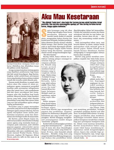 59(BERITA FEATURE)BERITAINDONESIA, 4 Mei 2006mempertanyakan mengapa kitab suciharus dilafalkan dan dihafalkan tanpadiwajibkan untuk dipahami.Ia juga mempertanyakan tentang agamayang dijadikan pembenaran bagi kaumlaki-laki untuk berpoligami. Bagi Kartini,lengkap sudah penderitaan perempuanJawa yang dunianya hanya sebatas tembokrumah dan tersedia untuk dimadu pula.Namun meski demikian, ia sangat yakinbahwa akan tiba zaman di mana pemahaman agama mempunyai perspektifkeadilan pada perempuan sebagaimanaakan tiba zaman baru, yaitu pembebasanhak-hak dasar perempuan dari kungkungan adat dan keadilan bagi kaumpribumi. Menurut Kartini, Islam memberiajaran yang baik, tetapi telah dinodaipemeluknya yang tidak tahu ajaran Islamyang suci dan menjadikan agama sebagaitopeng perbuatannya.Persoalan yang ia gugat merupakanpersoalan yang harus terus diperjuangkankalangan agama sampai sekarang. Karenaagama merupakan unsur utama pembentukan kesadaran sosial dan determinan atas berbagai tradisi di masyarakat.RA Kartini, puteri Bupati Jepara itu,telah menyuarakan rekonstruksi terhadapajaran agama yang menindas kaum perempuan pada zamannya, jauh sebelumgagasan-gagasan rekonstruksi ajaranagama yang berkeadilan pada perempuandisuarakan oleh para cendekiawan muslimah Aminah Wadud Hasim, FatimaMernissi, Asghaar Eli Engineer, RifaatHasan, pada era 1980-an dan 1990-an. ■RH /dari berbagai sumberSuatu kenangan yang tak akanhilang bagi sebagian besar kaumperempuan Indonesia saatmereka masih duduk di sekolahdasar, mengenakan kebaya Kartini dankonde besar di kepala, berjalan perlahanlahan dituntun ibunda menuju sekolah.Entah kenapa, Hari Kartini yang jatuhpada 21 April selalu diperingati sekolahsekolah dengan dengan lomba busanakebaya’‘mirip Ibu Kartini’, sementaraalunan musik mengumandangkan lagu“Ibu Kita Kartini.”Sayang sekali, hanya sebatas itu sosialisasi tentang pelopor semangat kesetaraan bagi perempuan pribumiitu. Banyak yangbelum pernahmembaca buah pikirannya yang terangkum dalambuku “Habis GelapTerbitlah Terang.”Padahal, di negeriBelanda, bukuyang judul aslinyaadalah “Door Duisternis Tot Licht”banyak dibaca berbagai kalangan.Menjadi suatu pengetahuan umumyang wajib diketahui.Selain mengundang decak kagumbanyak kalangan diberbagai negeri,surat-surat Kartini juga mengundanggugatan dan perdebatan. Gugatangugatan itu diantaranya ditujukan padakonsistensi apa yang ia kritik dan perjuangkan. Kartini dianggap mengkhianati perjuangannya sendiri dengan“menerima” poligami.Kartini telah membayangkan peristiwayang akan menimpanya itu. “… pasti tiba,saat di mana aku akan disandingkandengan seorang suami yang belum kukenal. Di Jawa, cinta hanyalah sebuahkhayalan…. Beradab, orang Jawa yangsangat beradab bisa dihitung dengan jari,tapi budaya dan pendidikan belumdiperhitungkan dalam hal immoralitas.Carilah dan mintalah sesuatu dari duniaaristokrasi laki-laki itu tapi bukan ini,moralitas, karena akan sia-sia. ... Akubenci, aku memandang rendah merekasemua, …”Pada pertengahan tahun 1903, saatberusia sekitar 24 tahun, niatnya untukmelanjutkan studi menjadi guru diBetawi pupus. Dalam sebuah suratkepada Nyonya Abendanon, Kartinimengungkap ia mengurungkan niatnyakarena akan menikah.Kartini yang gemar membaca menjadikan majalah dan buku-buku karyapengarang Eropasebagai santapansehari-hari yangmengilhaminyaagar kaum perempuan pribumi jugasemaju perempuanEropa.“Aku Mau ...”adalah motto Kartini. Sepenggalungkapan itu mewakili sosoknya.Kartini yang cerdasbisa berbicara tentang banyak hal:sosial, budaya,agama, bahkankorupsi.Sesungguhnya,perkawinan danpoligami tidak menenggelamkancita-citanya. Padasaat menjelang pernikahan, terdapatperubahan penilaian Kartini soal adatJawa. Ia menjadi lebih toleran. Ia menganggap pernikahan akan membawakeuntungan tersendiri dalam mewujudkan keinginan mendirikan sekolahbagi para perempuan bumiputra kalaitu. Dalam surat-suratnya kemudian,Kartini menyebutkan bahwa sangsuami tidak hanya mendukung keinginannya untuk mengembangkanukiran Jepara dan sekolah bagi perempuan bumiputra saja, tetapi jugamendorong Kartini untuk menulissebuah buku. RHAku Mau Kesetaraan“Aku dijuluki ’kuda kore’ atau kuda liar karena jarang sekali berjalan tetapipecicilan. Dan mereka memanggilku apalagi ya? Aku sering tertawa keraskeras, hingga gigiku kelihatan.”