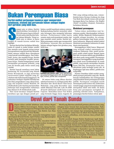 61(BERITA FEATURE)BERITAINDONESIA, 4 Mei 2006Sampai usia 12 tahun, Kartinidiperbolehkan bersekolah diELS (Europese Lagere School).Di sini antara lain Kartini belajar bahasa Belanda. Tetapi setelah usia 12 tahun, ia harustinggal di rumah karena sudah bisadipingit.Karena Kartini bisa berbahasa Belanda,maka di rumah ia mulai belajar sendiridan menulis surat kepada teman-temankorespondensi yang berasal dari Belanda.Salah satunya adalah Rosa Abendanonyang banyak mendukungnya. Dari bukubuku, koran, dan majalah Eropa, Kartinitertarik pada kemajuan berpikir perempuan Eropa. Timbul keinginannya untukmemajukan perempuan pribumi, yangsaat itu berada pada status sosial yangrendah.Kartini banyak membaca surat kabarSemarang De Locomotief yang diasuhPieter Brooshooft, ia juga menerimaleestrommel (paket majalah yang diedarkan toko buku kepada langganan). Diantaranya terdapat majalah kebudayaandan ilmu pengetahuan yang cukup berat,juga ada majalah wanita Belanda DeHollandsche Lelie. Kartini pun kemudianbeberapa kali mengirimkan tulisannyadan dimuat di De Hollandsche Lelie.Dari surat-suratnya tampak Kartinimembaca apa saja dengan penuh perhatian, sambil membuat catatan-catatan.Kadang-kadang Kartini menyebut salahsatu karangan atau mengutip beberapakalimat. Perhatiannya tidak hanyasemata-mata soal emansipasi wanita, tapijuga masalah sosial umum. Kartini melihat perjuangan wanita agar memperolehkebebasan, otonomi dan persamaanhukum sebagai bagian dari gerakan yanglebih luas.Di antara buku yang dibaca Kartinisebelum berumur 20, terdapat judul MaxHavelaar dan Surat-Surat Cinta karyaMultatuli, yang pada November 1901sudah dibacanya dua kali. Lalu De StilleKraacht (Kekuatan Gaib) karya LouisCoperus. Kemudian karya Van Eedenyang bermutu tinggi, karya Augusta deWitt yang sedang-sedang saja, romanfeminis karya Nyonya Goekoop de-JongVan Beek dan sebuah roman anti-perangkarangan Berta Von Suttner, Die WaffenNieder (Letakkan Senjata). Semuanyaberbahasa Belanda.Eksistensi perempuanTahun-tahun melelahkan saat kesetaraan gender diperjuangkan terbayarsudah. Ketika Megawati Soekarnoputeriterpilih sebagai presiden, itu sesungguhnya kemenangan bagi kaum perempuan Indonesia. Megawati adalah simboleksistensi perempuan Indonesia di matadunia internasional.Sesungguhnya tidak hanya Megawatiyang menjadi simbol emansipasi perempuan Indonesia. Kini, posisi perempuan sudah relatif sejajar dengan kaumlaki-laki, terutama dalam segi pendidikandan akses pada ruang publik. Perempuanberangsur meninggalkan ruang domestiknya untuk turut beraktualisasi di ranahpublik, yang semula merupakan domainkaum laki-laki. Perempuan turut beraktualisasi pada berbagai posisi elit, dilingkungan sipil atau militer, politik ataunonpolitik.Namun demikian tidak mudah mengubah persepsi patriarkis yang ada. Masihbanyak ketidakadilan dan ketimpanganyang dirasakan kaum perempuan di ranahpublik. Perempuan seringkali masihmenempati posisi nomor dua. Kekerasanrumah tangga yang terus terjadi misalnya,merupakan salah satu bukti. Di duniakerja pun perempuan seringkali dipandang sebelah mata. Tampaknya,perjuangan Kartini belum selesai. ■ RHDewi dari Tanah SundaDelapan tahun setelah kelahiran anak kelima BupatiJepara RMAA Sosroningrat, Raden Ajeng Kartini,seorang puteri bangsawan Priangan lahir dari pasanganRaden Rangga Somanegara dan Raden Ayu RajaPermas. Ia dinamai Raden Dewi Sartika.Hari itu, 4 Desember 1887, menandai kebangkitan kaumperempuan di tanah Sunda, seperti halnya yang diperjuangkanRaden Ajeng Kartini bagi perempuan Jawa.Seperti halnya Kartini, Dewi Sartika meyakini bahwapendidikan menjadi sarana yang meniscayakan kesejajaranposisi laki-laki perempuan dalam ruang sosial.Setelah berkonsultasi dengan Bupati R.A. Martenagara, pada16 Januari 1904, Dewi Sartika mendirikan Sakola Istri. Tenagapengajarnya ia sendiri dibantu dua saudara misannya, NyiPoerwa dan Nyi Oewid. Untuk sementara tempat belajarmeminjam ruangan di Paseban Barat di halaman depan rumahBupati Bandung.Murid yang diterima untuk kali pertama yakni 60 siswi, yangsebagian besar berasal dari masyarakat kebanyakan. Pada1905, sekolah tersebut pindah ke Jalan Ciguriang-Kebon Caukarena ruangan tak mampu lagi menampung jumlah siswiyang bertambah. Lokasi baru ini dibeli Dewi Sartika denganuang tabungan pribadinya, serta bantuan dana pribadi dariBupati Bandung.Setelah menikah dengan Raden Kanduruan Agah Suriawinata pada 1906 yang juga turut mendukung dan membantudalam memajukan sekolah yang didirikannya, pada 1910 DewiSartika mengubah Sakola Istri menjadi Sakola KaoetamaanIstri, dengan jangkauan lebih luas bahkan dari luar Jawa Barat.Dewi Sartika meninggal 11 September 1947 dan dimakamkan dengan upacara sederhana di pemakaman CigagadonDesa Rahayu Kecamatan Cineam. Tiga tahun kemudiandimakamkan kembali di kompleks Pemakaman BupatiBandung, Jalan Karang Anyar, Bandung. ■ RHBukan Perempuan BiasaKartini melihat perjuangan kaumnya agar memperolehkebebasan, otonomi dan persamaan hukum sebagai bagiandari gerakan yang lebih luas.PEREMPUAN MASA KINI: turut beraktualisasi pada berbagai posisi elit, di lingkungansipil, militer, politik dan nonpolitik.