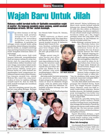 BERITA HUMANIORA62 BERITAINDONESIA, 4 Mei 2006Tiga tahun lamanya ia tak lagibercermin sejak peristiwamengerikan itu terjadi.Wajahnya tak menyisakankecantikan yang pernahdimilikinya. Ia menyadari itusehingga cermin menjadi benda palingmenakutkan dalam hidupnya kemudian.Siti Nur Jazilah, 22, menjadi contoh bagisiapa saja betapa banyak perempuan yangmasih mengalami kekerasan dalam rumah tangga.Berbagai media massa, baik cetakmaupun elektronik, mempublikasikankisah perempuan malang itu setiap hari.Harian Indo Pos yang paling intensifmemberitakan, bahkan menelusuri asalusul, hingga menemukan kakek-neneknya dan ayahnya yang sudah lama terpisah darinya. Bahkan, berkat penelusuran harian ini, polisi berhasil mengembangkan kasus penganiayaan terhadap perempuan yang awalnya disamarkan namanya menjadi Lisa. AdalahMulyono Eko, suami Lisa, yang menyiramkan air keras ke wajahnya sehinggamenjadi seperti itu. Saat ini, lelaki itutelah menjadi tersangka dan mendekamdi sel tahanan.Hari-hari menjelang operasi Lisa adalah hari yang paling ditunggu. Berbagaimedia mengulas persiapan yang dilakukan Rumah Sakit Umum Dr. Sutomo,Surabaya.Media Indonesia, 29 Maret 2006mengetengahkan judul “Saya Ingin Menjadi Manusia Baru.” Menurut harian ini,sejarah kembali tercatat di Indonesia.Rumah Sakit Umum Dr Soetomo Surabaya melakukangawe besar dengan menggelar operasi mengganti wajah (face off) pertama di Indonesia.Hingga operasi yang disebut operasi face off itudilakukan, tidak ada informasi siapa pelakunya itu dankenapa dia menyiram wajahLisa dengan air keras. Taksepatah kata pun keluar darimulut Lisa. Bahkan Dr Nalini, psikiater yang selalumendampinginya, tidak berhasil mengoreknya.Aksi tutup mulut Lisa tentu memancingrasa penasaran. Begitu pula halnyadengan petugas polisi, karena jika penyiraman air keras itu dilakukan dengansengaja, maka itu adalah suatu tindakpidana yang tidak bisa dibiarkan. Dimulailah pelacakan keluarga Lisa olehberbagai media.Lagi-lagi Indo Pos berhasil melaporkanlebih intensif. Dalam terbitannya 30Maret 2006, mereka berhasil melacakkeluarga Lisa. Alamat di Malang diburu.Di salah satu desa sekitar 40 kilometerdari kota Malang, Lisa dirawat sejak kecil.Di sana sebuah rumah sangat sederhanaberukuran sekitar 5m x 8m, tinggalpasangan suami istri yang sudah renta,Samsuri Kusnoto, 65, dan Wakinah, 60.Mereka itu kakek nenek Lisa.Ketika didatangi wartawan harian inidan diberitahu bahwa fotoyang dimuat di koran itu Lisa(wartawan koran ini menunjukkan foto Lisa di korankepada Samsuri dan Wakinah), Wakinah langsung menangis. “Jilah (nama kecil LisaRed) sejak tiga setengah tahunlalu meninggalkan rumah ini,”kata nenek 60 tahun itu dengan bahasa Jawa kromo inggil. Sejak itulah, Wakinah takpernah bertemu dengan cucukesayangannya itu.Dari cerita Wakinah danSamsuri, kedua orangtua Lisabercerai sejak 10 tahun lalu.”Lisa itu sekolahnya tidak sampai lulusmadrasah tsanawiyah (setingkat SMP),”kata Samsuri dikutip Indo Pos.Lisa alias Jilah adalah anak kedua daripasangan Siti Zulaikah-Saring. Sejakkecil, Lisa tinggal bersama orangtuaibunya. Rupanya, nasib Lisa tidak semujur teman-teman sebayanya. Karenakendala ekonomi, Siti Zulaikah terpaksapergi meninggalkan Lisa ketika Lisaberumur tiga tahun. Siti merantau ke arabSaudi, menjadi TKW.Sementara itu, ayah Jilah, Saring, barumengetahui perihal anaknya setelahmembaca berbagai koran yang ditunjukskan tetangga dan kerabatnya. Semula diatidak percaya karena wajah anaknya sulitdikenali lagi. Dia baru percaya setelahmelihat foto anaknya sebelum kecelakaanditampilkan di koran.Seperti diberitakan Kompas, 1 April2006, ia mengaku sudah lama kehilangankontak dengan anaknya yang terakhirdiketahuinya pergi ke Kalimantan.Masa lalu terungkapLisa datang ke Rumah Sakit Dr Sutomokarena ia kesulitan bernapas. Salah satulubang hidupnya tertutup kulit yangWajah Baru Untuk JilahMukanya sedikit berubah ketika dr Sjaifuddin menunjukkan wajahdi monitor. Dia langsung menghela napas panjang, sambil sesekalimenghapus airmata. Siti Nur Jazilah menangis.SITI NUR JAZILAHOperasi face off: Hari bersejarah untuk Lisa.