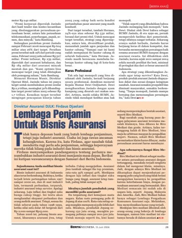 (BERITA KHAS)BERITAINDONESIA, 15 Juni 2006 29motor Rp 242 miliar.“Premi korporasi diperolah Jasindodari hasil tender dan kontes kecantikanyang diselenggarakan perusahaan-perusahaan besar, antara lain perusahaantelekomunikasi, penerbangan, pupuk, semen, dan minyak,” kata Bambang.Sedangkan perolehan premi Jasindosampai Februari 2006 mencapai Rp 604miliar atau 26% dari target. Peraihanpremi tersebut naik 19% dari periode yangsama, Februari 2005 yaitu sebesar Rp 507miliar. Premi terbesar, Rp 239 miliar,diperolah dari asuransi kebakaran, danRp 184 miliar dari asuransi minyakmentah dan gas. “Kami optimis bisamencapai target yang telah ditetapkanoleh pemegang saham,” kata Bambang.Menurut Herman Munir, DirekturOperasi Ritel, Jasindo tahun ini punyatarget untuk membukukan premi senilaiRp 2,2 triliun, meningkat 30% dibandingkan target premi tahun 2005 sebesar Rp1,7 triliun. Kenaikan target tersebutmengingat pencapaian kinerja tahun2005 yang cukup baik serta kondisipertumbuhan pasar asuransi yang masihkondusif.Dari target tersebut, tambah Herman,24%-nya atau sebesar Rp 532 miliar,berasal dari premi ritel. Untuk mencapaitarget tersebut, strategi yang dipersiapkan, antara lain, diversifikasi produk,menambah jumlah agen penjualan dankantor cabang.”“Sampai saat ini kamisudah mempunyai 80 kantor cabang diseluruh Indoensia,” kata Herman. Jasindo masih berencana membuka beberapa kantor cabang lagi di kota-kotabesar.Harus ProfesionalTak ada lagi monopoli yang bisa dinikmati oleh Jasindo, kecuali berjuangsecara profesional, demikian menurutKepala Humas Dewi Oedjiastuti. Dewimengibaratkan Jasindo dengan ayamkampung yang disuruh cari makan sendiri. Artinya, meski selaku BUMN, Jasindo tidak mendapat fasilitas atau hakSejauhmana Anda melihat bisnisasuransi saat ini?Bisnis industri asuransi di Indonesiaakan terus berkembang. Buktinya, ketikaterjadi krisis pertengahan tahun 1997sampai 2000-an, dan di saat industrilain, termasuk perbankan, terpuruk,industri asuransi tetap survive. Apalagisekarang. Laju inflasi dan tingkat sukubunga cukup tinggi. Ini tentu akanmenghambat ekspansi perbankan danorang melirik asuransi. Tetapi, semua itutidak seberat pada tahun 1998-1999,ketika nilai satu dolar AS bergerak dariRp 2.000 sampai Rp15.000.Tahun 2006 ini, peluang bisnis asuransi, khususnya asuransi jiwa, tetapterbuka. Cukup mengejutkan. Asuransijiwa tumbuh sebagai the top premium,rata-rata 35% sampai 40%. Meskipundengan laju inflasi dan tingkat sukubunga yang tinggi, asuransi tetap tumbuh, paling tidak sampai 25%.Idealnya jumlah penduduk yangmemiliki polis asuransi?Itu tergantung dari kemajuan suatunegara. Kalau rasio pemegang polis diJepang di atas 100%. Rata-rata setiap orang mungkin mempunyai polis lebih darisatu. Misalnya, penduduk Jepang sekarang 150 juta orang, mungkin pemegang polisnya sampai 200-300 juta.Untuk menuju seperti itu, kini kamisedang mempersiapkan bentuk asosiasi,seperti Biro Mediasi.Bagi nasabah yang kurang puas dengan pelayanan asuransi terutama masalah klaimnya, bisa dibawa ke BiroMediasi dan gratis. Artinya, kalau tertanggung kalah di Biro Mediasi, bisamaju ke arbitrase maupun ke pengadilannegeri. Namun, sekali Biro Mediasimemutuskan klaim harus dibayar, makaperusahaan asuransi harus membayar.Apa sebenarnya fungsi Biro Mediasi?Biro Mediasi ini dibuat sebagai mediator antara perusahaan asuransi dengantertanggung, manakala terjadi sengketadalam hal mengenai klaim, misalnya.Jadi, dengan adanya Biro Mediasi inidiharapkan dapat menjembatani pemegang polis yang kecil yang tidak beranimengajukan kasusnya ke pengadilankarena keterbatasan biaya, dengan perusahaan asuransi yang bermasalah. BiroMediasi semacam ini sudah ada dinegara lain, seperti Jepang, Malaysiadan Amerika. Jadi, Biro Mediasi bukanhanya sebagai Lembaga PengaduanKonsumen Asuransi saja. Melainkan,bisa menyelesaikan kasus yang terjadi.Meskipun biro mediasi dibentuk olehorang-orang yang bekerja di lembagakeuangan, namun biro mediasi ini statusnya berada di dalam asosiasi. ■ RI, SHDirektur Asuransi DJLK: Firdaus DjaelaniLembaga PenjaminUntuk Bisnis AsuransiTidak hanya deposan bank yang butuh lembaga penjaminan,tetapi juga industri asuransi. Usaha ini juga rawan ancamankebangkrutan. Karena itu, kata Firdaus, agar nasabah tidakmenderita rugi perlu ada penjaminan, sehingga kepercayaanmereka tidak hilang pada industri dan bisnis asuransi.Firdaus menyampaikan pandangannya tentang perlunya menumbuhkan industri asuransi demi menjamin masa depan. Berikutini kutipan wawancaranya dengan Samsuri dari Berita Indonesia.monopoli.“Tidak seperti yang dituduhkan bahwaJasindo memegang hak monopoli,” kataDewi. Diakui oleh Dewi bahwa sebagaiBUMN Jasindo, di era 1990-an, pernahmemperoleh fasilitas dari pemerintah,tetapi sifatnya sangat terbatas. Sekarangeranya sudah berbeda, Jasindo harusberjuang keras di dalam kompetisi, danberusaha memenangkan persaingan baiksesama asuransi BUMN maupun denganasuransi swasta. Ini dibuktikan olehJasindo, karena sejak 2001 sampai 2004selalu meraih predikat the best, minimaldi peringkat dua dari 10 besar asuransi diIndonesia.Apa strategi yang dikembangkan Jasindo agar tetap survive? Kata Dewi,produk-produk asuransi Jasindo diupayakan dekat dan sesuai dengan keinginannasabah. Asuransi semakin prospektif dandiminati masyarakat, semakin berkembang. “Tanpa monopoli, Jasindo mampubersaing dan memenangkan persainganitu,” kata Dewi.■ RI, SH