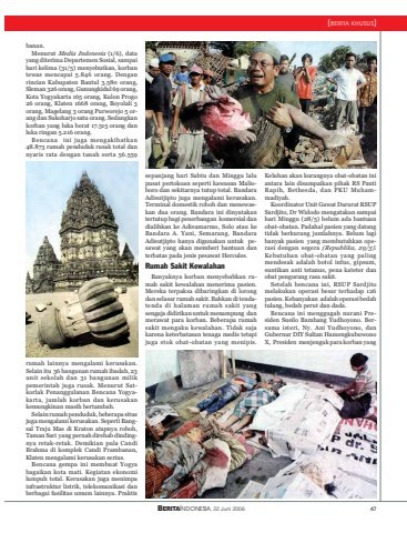 (BERITA KHUSUS)BERITAINDONESIA, 22 Juni 2006 47banan.Menurut Media Indonesia (1/6), datayang diterima Departemen Sosial, sampaihari kelima (31/5) menyebutkan, korbantewas mencapai 5.846 orang. Denganrincian Kabupaten Bantul 3.580 orang,Sleman 326 orang, Gunungkidul 69 orang,Kota Yogyakarta 165 orang, Kulon Progo26 orang, Klaten 1668 orang, Boyolali 3orang, Magelang 3 orang Purworejo 5 orang dan Sukoharjo satu orang. Sedangkankorban yang luka berat 17.515 orang danluka ringan 5.216 orang.Bencana ini juga mengakibatkan48.873 rumah penduduk rusak total dannyaris rata dengan tanah serta 56.559sepanjang hari Sabtu dan Minggu lalupusat pertokoan seperti kawasan Malioboro dan sekitarnya tutup total. BandaraAdisutjipto juga mengalami kerusakan.Terminal domestik roboh dan menewaskan dua orang. Bandara ini dinyatakantertutup bagi penerbangan komersial dandialihkan ke Adisumarmo, Solo atau keBandara A. Yani, Semarang. BandaraAdisutjipto hanya digunakan untuk pesawat yang akan memberi bantuan danterbatas pada jenis pesawat Hercules.Rumah Sakit KewalahanBanyaknya korban menyebabkan rumah sakit kewalahan menerima pasien.Mereka terpaksa dibaringkan di lorongdan selasar rumah sakit. Bahkan di tendatenda di halaman rumah sakit yangsengaja didirikan untuk menampung danmerawat para korban. Beberapa rumahsakit mengaku kewalahan. Tidak sajakarena keterbatasan tenaga medis tetapijuga stok obat-obatan yang menipis.Keluhan akan kurangnya obat-obatan iniantara lain disampaikan pihak RS PantiRapih, Bethesda, dan PKU Muhammadiyah.Koordinator Unit Gawat Darurat RSUPSardjito, Dr Widodo mengatakan sampaihari Minggu (28/5) belum ada bantuanobat-obatan. Padahal pasien yang datangtidak berkurang jumlahnya. Belum lagibanyak pasien yang membutuhkan operasi dengan segera (Republika, 29/5).Kebutuhan obat-obatan yang palingmendesak adalah botol infus, gipsum,suntikan anti tetanus, pena kateter danobat pengurang rasa sakit.Setelah bencana ini, RSUP Sardjitomelakukan operasi besar terhadap 126pasien. Kebanyakan adalah operasi bedahtulang, bedah perut dan dada.Bencana ini menggugah nurani Presiden Susilo Bambang Yudhoyono. Bersama isteri, Ny. Ani Yudhoyono, danGubernur DIY Sultan HamengkubuwonoX, Presiden menjenguk para korban yang(BERITA KHUSUS)rumah lainnya mengalami kerusakan.Selain itu 36 bangunan rumah ibadah, 23unit sekolah dan 31 bangunan milikpemerintah juga rusak. Menurut Satkorlak Penanggulanan Bencana Yogyakarta, jumlah korban dan kerusakankemungkinan masih bertambah.Selain rumah penduduk, beberapa situsjuga mengalami kerusakan. Seperti Bangsal Traju Mas di Kraton atapnya roboh,Taman Sari yang pernah direhab dindingnya retak-retak. Demikian pula CandiBrahma di komplek Candi Prambanan,Klaten mengalami kerusakan serius.Bencana gempa ini membuat Yogyabagaikan kota mati. Kegiatan ekonomilumpuh total. Kerusakan juga menimpainfrastruktur listrik, telekomunikasi danberbagai fasilitas umum lainnya. Praktis