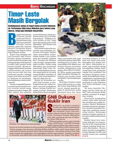 58 BERITAINDONESIA, 22 Juni 2006Bangkit dari kebisuandi puncak gejolakperlawanan bersenjata para tentara yangdipecat pemerintah,Presiden XananaGusmao, pekan lalu, memecatMenteri Pertahanan RoqueRodriguez dan Menteri DalamNegeri Rogerio Lobato.Seperti yang diungkap olehjuru bicaranya Agio Pereira,Presiden Xanana membebankan kerusuhan bersenjata yangberkepanjangan beberapa hariterakhir pada pundak keduamenteri tersebut. Mereka dianggap tidak berhasil meredampemberontakan eks tentarayang merasa sakit hati ataspemecatan mereka, sehingganegara kecil bekas provinsi ke27 Indonesia itu mendatangkan balabantuan tentara internasional.Xanana mengambil keputusan untuk memecat kedua menteri tersebut setelah mengadakan konsultasi dengan PMMari Alkatiri dan sejumlahmenteri kabinetnya dalam pertemuan Senin (29/5) di IstanaKepresidenan. “Kebijakan darurat berlaku 30 hari, tetapidapat diperpanjang jika masihdiperlukan,” kata Xanana usaisidang kabinet.Para mantan tentara dan masyarakat yang melakukan perlawanan bersenjata dimintasegera menyerahkan senjatasenjata kepada 2.000 tentaraasing dari Australia, SelandiaBaru, Portugal dan Malaysiayang bertugas mengamankannegeri tersebut. Tentara asingdikerahkan atas permintaanpemerintah Timor Leste. Xanana memberlakukan jam malam sampai pukul 20.00 untukmengembalikan ketertiban dinegeri yang berpenduduk kurang dari sejuta jiwa itu.Sejauh ini kerusuhan tersebut telah menelan 27 jiwa.Pengumuman jam malam tersebut menyusul pembahasankhusus tentang konflik bersenjata tersebut. SebelumnyaMenlu Ramos Horta mengakuibahwa pemerintah telah gagaluntuk mencegah pecahnya aksiketidakpuasan tersebut. Diamenyalahkan PM Alkatiri atasberlarut-larutnya kerusuhantersebut. Sebagaimana yangdikutip Nine Network, Australia, Horta menilai pemerintahgagal mendekati berbagai kelompok yang bertikai untukmengakhiri pembangkanganmereka.Bentrokan kembali terjadihanya lebih kurang 100 meterdari Istana Kepresidenan Dili(30/5). Letusan sporadis bergema di seluruh kota, keduakelompok barat dan timurberhadap-hadapan di dekatjalan raya utama yang menghubungkan kota dengan bandar udara. Sekelompok pemuda yang memakai topengbersenjatakan pedang tradisional Timor Leste, parang dantongkat besi membakar danmerampas bangunan pemerintah, termasuk kantor menteri kehakiman. Asap hitam tebalterlihat di seluruh kota akibatpembakaran yang dilakukanoleh kedua kelompok yangbertikai.“Ke mana Australia? Mengapa mereka tidak ada disini?” kata seorang pria ketikamelihat rumahnya di pinggirkota, terbakar.Pemerintah mengizinkantentara asing untuk melucutidan menahan para pelaku kerusuhan. Menteri KehakimanDomingos Sarmento mengatakan 120 polisi paramiliter Portugal akan membantu tentaraasing tersebut. Kedatanganpasukan Portugal tersebut dipercepat setelah melihat situasiterakhir.Kendati situasi terus memburuk, lebih dari 100 warga Indonesia di Dili yang berprofesisebagai pedagang belum bersedia dipulangkan. Merekabelum bersedia meninggalkanbarang dagangan mereka yangbernilai ratusan juta rupiah.■AFP-MI-SHTimor LesteMasih BergolakKetidakpuasan meluas di negeri bekas provinsi Indonesiaini. Perlawanan tidak hanya dilakukan para tentara yangdipecat, tetapi juga kelompok masyarakat.Sebanyak 114 negara anggotaGerakan Non Blok mendukung hakIran untuk memiliki teknologi nuklir,dan mengutuk Israel yang menduduki wilayah-wilayah Palestina secarabrutal. Pernyataan tersebut dikeluarkanpada akhir pertemuan dua hari di Malaysia, Ketua GNB saat ini.GNB menegaskan semua negara berhak“tanpa diskriminasi” memiliki teknologinuklir untuk penelitian dan sumber energi.Karena itu mereka mengecam setiap serangan terhadap fasilitas-fasilitas nuklir tujuan damai.“Setiap serangan atau ancaman terhadap fasilitas-fasilitas nuklir untuk tujuan damai—baikyang sudah beroperasi maupun dalam tahap pembangunan—merupakan ancaman besar bagiumat manusia dan lingkungan serta pelanggaran hukum internasional,” demikian sebagianisi komunike yang dikeluarkan pada akhir pertemuan para Menteri Luar Negeri GNB. ■ MI-SHBERITA MANCANEGARAPresiden Iran Mahmoud AhmadinejadGNB DukungNuklir Iran