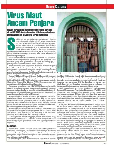 BERITAINDONESIA, 22 Juni 2006 63(BERITA KESEHATAN)Sedikitnya 50 narapidana (Napi) Rumah Tahanan(Rutan) Pondok Bambu Jakarta Timur terinveksi virus HIV/AIDS. Demikian dilaporkan harian Kompas,20 Mei 2006. Menurut harian tersebut, jumlah Napipenderita AIDS diperkirakan bertambah, karenatidak semua Napi diperiksa darahnya untuk mengetahui mereka teridentifikasi virus HIV/AIDS. Sebagian besar,penderita virus mematikan itu adalah Napi kasus Narkoba danberkelamin perempuan.Rutan yang berdiri tahun 1974 itu memiliki 1.421 penghuni.Terdiri 1.091 orang tahanan, 328 Napi dan dua penghuni anakbawahan (AB). Dari jumlah itu, sebanyak 712 orang (50,14persen) masuk ke Rutan karena kasus Narkoba.Jumlah tahanan dan Napi kasus Narkoba, menurut KepalaRutan Slamet Prihantara, dari tahun ke tahun terus mengalamipeningkatan. Sejak dirinya menjabat sebagai Karutan pada Mei2004, jumlah tahanan dan Napi kasus Narkoba mencapai 36persen dari jumlah keseluruhan penghuni.Kepala Poliklinik LP Pondok Bambu, Jusi Rusjanti Krisnawan,mengatakan dalam pendeteksian apakah tahanan atau Napiteridentifikasi virus HIV/AIDS, pihaknya menggunakan metodeVoluentary Councelling Testing (VCT). Dengan metode ini,pemeriksaan dilakukan atas inisiatif mereka.Kecemasan penyebaran virus HIV/AIDS di dalam penjara telahmuncul sejak lama. Ribuan narapidana di sejumlah lembagapemasyarakatan di Jakarta memiliki potensi tinggi tertular virus HIV/AIDS karena sebagian besar dari mereka menggunakannarkotika dan obat berbahaya (Narkoba).Menurut laporan Media Indonesia, pertengahan Novembertahun lalu, sekitar 60 persen atau 6.180 dari 10.300 orangnarapidana di empat penjara di Jakarta dan sekitarnya terkaitlangsung maupun tak langsung dengan kasus Narkoba, dan 50persen dari sekitar 6.180 orang Napi itu berisiko terinfeksi HIV,kata seorang pendamping penderita HIV/AIDS.Menurut Ketua Partisan (Lembaga Swadaya Masyarakat yangbergerak di bidang pendampingan penderita HIV/AIDS) BabyJim Aditya, para narapidana itu tersebar di LP Salemba,Cipinang, Pondok Bambu, dan Cipinang Narkoba.Ia mengatakan, relatif tingginya jumlah narapidana yangberpotensi terjangkit HIV/AIDS ini sangat mengkhawatirkanterlebih lagi penjara-penjara itu sudah over capacity (kelebihankapasitas).KematianKeberadaan Jakarta sebagai salah satu sentra peredarannarkotika, psikotropika, dan bahan adiktif lainnya (Narkoba)menimbulkan banyak konsekuensi. Salah satunya adalahpeningkatan angka kematian narapidana serta tahanan di Jakartadan sekitarnya akibat AIDS.Menurut Kepala Divisi Pemasyarakatan Departemen Hukumdan HAM DKI Jakarta, Gunadi, fakta itu merupakan konsekuensidari beberapa fenomena. Salah satu yang penting adalahkecenderungan meningkatnya prevalensi jumlah Napi dantahanan yang mengidap HIV berdasarkan tes darah yangdilakukan. Ini berdasarkan pengamatannya terhadap tesdarah yang dilakukan antara tahun 1997 hingga 2001.Hasil surveillance HIV/AIDS Direktorat PemberantasanPenyakit Menular dan Penyehatan Lingkungan (P2MPL) padatahun 2002 juga menyimpulkan, ditemukan 24,5 persen Napidan tahanan pengidap HIV dari total yang diperiksa. Atau, satudari 10 Napi/tahanan yang diperiksa terinfeksi HIV. Dalam surveillance ini, diperiksa para Napi/tahanan asal Rumah Tahanan(Rutan) Salemba, Rutan Pondok Bambu, dan LP Kelas ICipinang.“Celakanya, ketika masalah terkait penyebaran HIV ini makinserius, kami masih menghadapi berbagai masalah dalampengelolaan LP. Salah satunya adalah problem kelebihankapasitas Napi, yang sudah mencapai sekitar 200 persen untukse-wilayah DKI Jakarta,” ujar Gunadi seperti dikutip Kompas.Napi dan tahanan yang terinfeksi HIV dan masih menjalanimasa hukumannya tentu akan menjadi pemicu penularan HIVdi dalam LP dan Rutan. Hal ini karena diakui atau tidak, hinggakini masih terjadi peredaran gelap dan penggunaan Narkoba didalam LP dan Rutan, termasuk penggunaan Narkoba dengancara menyuntik, yang sering dilakukan tanpa memakai jarumsuntik steril, sehingga berpotensi menularkan HIV.Dalam menangani HIV/AIDS di dalam LP dan Rutan ini, salahsatu kendala utama adalah soal dana. Dari informasi yangdihimpun Kompas, uang pengobatan seorang Napi dan tahananper tahunnya tak lebih dari Rp 2.500. Dana sekecil itu tentu takmampu mengatasi permasalahan kesehatan yang muncul.Apalagi, jika yang bersangkutan telah mengidap HIV. ■ RHBERITA KESEHATANVirus MautAncam PenjaraRibuan narapidana memiliki potensi tinggi tertularvirus HIV/AIDS. Angka kematian di beberapa lembagapemasyarakatan di Jakarta terus meningkat.Penjara rawan penularan HIV/AIDSTEMPOINTERAKTIF