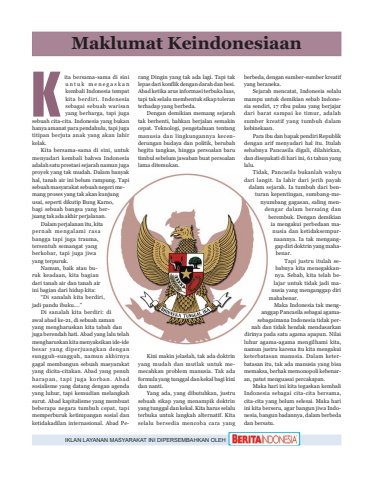 Kita bersama-sama di siniuntuk menegaskankembali Indonesia tempatkita berdiri. Indonesiasebagai sebuah warisanyang berharga, tapi jugasebuah cita-cita. Indonesia yang bukanhanya amanat para pendahulu, tapi jugatitipan berjuta anak yang akan lahirkelak.Kita bersama-sama di sini, untukmenyadari kembali bahwa Indonesiaadalah satu prestasi sejarah namun jugaproyek yang tak mudah. Dalam banyakhal, tanah air ini belum rampung. Tapisebuah masyarakat sebuah negeri memang proses yang tak akan kunjungusai, seperti dikutip Bung Karno,bagi sebuah bangsa yang berjuang tak ada akhir perjalanan.Dalam perjalanan itu, kitapernah mengalami rasabangga tapi juga trauma,tersentuh semangat yangberkobar, tapi juga jiwayang terpuruk.Namun, baik atau buruk keadaan, kita bagiandari tanah air dan tanah airini bagian dari hidup kita:“Di sanalah kita berdiri,jadi pandu ibuku….”Di sanalah kita berdiri: diawal abad ke-21, di sebuah zamanyang mengharuskan kita tabah danjuga berendah hati. Abad yang lalu telahmengharuskan kita menyaksikan ide-idebesar yang diperjuangkan dengansungguh-sungguh, namun akhirnyagagal membangun sebuah masyarakatyang dicita-citakan. Abad yang penuhharapan, tapi juga korban. Abadsosialisme yang datang dengan agendayang luhur, tapi kemudian melangkahsurut. Abad kapitalisme yang membuatbeberapa negara tumbuh cepat, tapimemperburuk ketimpangan sosial danketidakadilan internasional. Abad Perang Dingin yang tak ada lagi. Tapi taklepas dari konflik dengan darah dan besi.Abad ketika arus informasi terbuka luas,tapi tak selalu membentuk sikap toleranterhadap yang berbeda.Dengan demikian memang sejarahtak berhenti, bahkan berjalan semakincepat. Teknologi, pengetahuan tentangmanusia dan lingkungannya kecenderungan budaya dan politik, berubahbegitu tangkas, hingga persoalan barutimbul sebelum jawaban buat persoalanlama ditemukan.Kini makin jelaslah, tak ada doktrinyang mudah dan mutlak untuk memecahkan problem manusia. Tak adaformula yang tunggal dan kekal bagi kinidan nanti.Yang ada, yang dibutuhkan, justrusebuah sikap yang menampik doktrinyang tunggal dan kekal. Kita harus selaluterbuka untuk langkah alternatif. Kitaselalu bersedia mencoba cara yangberbeda, dengan sumber-sumber kreatifyang beraneka.Sejarah mencatat, Indonesia selalumampu untuk demikian sebab Indonesia sendiri, 17 ribu pulau yang berjajardari barat sampai ke timur, adalahsumber kreatif yang tumbuh dalamkebinekaan.Para ibu dan bapak pendiri Republikdengan arif menyadari hal itu. Itulahsebabnya Pancasila digali, dilahirkan,dan disepakati di hari ini, 61 tahun yanglalu.Tidak, Pancasila bukanlah wahyudari langit. Ia lahir dari jerih payahdalam sejarah. Ia tumbuh dari benturan kepentingan, sumbang-menyumbang gagasan, saling mendengar dalam bersaing danberembuk. Dengan demikiania mengakui perbedaan manusia dan ketidaksempurnaannya. Ia tak menganggap diri doktrin yang mahabenar.Tapi justru itulah sebabnya kita menegakkannya. Sebab, kita telah belajar untuk tidak jadi manusia yang menganggap dirimahabenar.Maka Indonesia tak menganggap Pancasila sebagai agamasebagaimana Indonesia tidak pernah dan tidak hendak mendasarkandirinya pada satu agama apapun. Nilailuhur agama-agama mengilhami kita,namun justru karena itu kita mengakuiketerbatasan manusia. Dalam keterbatasan itu, tak ada manusia yang bisamemaksa, berhak memonopoli kebenaran, patut menguasai percakapan.Maka hari ini kita tegaskan kembaliIndonesia sebagai cita-cita bersama,cita-cita yang belum selesai. Maka hariini kita berseru, agar bangun jiwa Indonesia, bangun badannya, dalam berbedadan bersatu.Maklumat KeindonesiaanIKLAN LAYANAN MASYARAKAT INI DIPERSEMBAHKAN OLEH