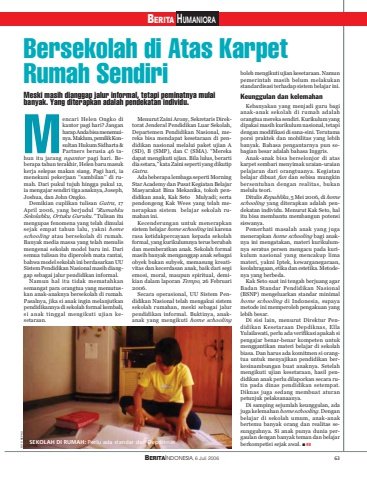 BERITAINDONESIA, 6 Juli 2006 63(BERITA HUMANIORA)Mencari Helen Ongko dikantor pagi hari? Janganharap Anda bisa menemuinya. Maklum, pemilik Konsultan Hukum Sidharta &Partners berusia 46 tahun itu jarang ngantor pagi hari. Beberapa tahun terakhir, Helen baru masukkerja selepas makan siang. Pagi hari, iamenekuni pekerjaan ‘’sambilan’’ di rumah. Dari pukul tujuh hingga pukul 12,ia mengajar sendiri tiga anaknya, Joseph,Joshua, dan John Ongko.Demikian cuplikan tulisan Gatra, 17April 2006, yang berjudul “RumahkuSekolahku, Ortuku Guruku.” Tulisan itumengupas fenomena yang telah dimulaisejak empat tahun lalu, yakni homeschooling atau bersekolah di rumah.Banyak media massa yang telah menulismengenai sekolah model baru ini. Darisemua tulisan itu diperoleh mata rantai,bahwa model sekolah ini berdasarkan UUSistem Pendidikan Nasional masih dianggap sebagai jalur pendidikan informal.Namun hal itu tidak mematahkansemangat para orangtua yang memutuskan anak-anaknya bersekolah di rumah.Pasalnya, jika si anak ingin melanjutkanpendidikannya di sekolah formal kembali,si anak tinggal mengikuti ujian kesetaraan.Menurut Zaini Arony, Sekretaris Direktorat Jenderal Pendidikan Luar Sekolah,Departemen Pendidikan Nasional, mereka bisa mendapat kesetaraan di pendidikan nasional melalui paket ujian A(SD), B (SMP), dan C (SMA). “Merekadapat mengikuti ujian. Bila lulus, berartidia setara,” kata Zaini seperti yang dikutipGatra.Ada beberapa lembaga seperti MorningStar Academy dan Pusat Kegiatan BelajarMasyarakat Bina Mekanika, tokoh pendidikan anak, Kak Seto Mulyadi; sertapendongeng Kak Wees yang telah menerapkan sistem belajar sekolah rumahan ini.Kecenderungan untuk menerapkansistem belajar home schooling ini karenarasa ketidakpercayaan kepada sekolahformal, yang kurikulumnya terus berubahdan memberatkan anak. Sekolah formalmasih banyak menganggap anak sebagaiobyek bukan subyek, memasung kreativitas dan kecerdasan anak, baik dari segiemosi, moral, maupun spiritual, demikian dalam laporan Tempo, 26 Februari2006.Secara operasional, UU Sistem Pendidikan Nasional telah mengakui sistemsekolah rumahan, meski sebagai jalurpendidikan informal. Buktinya, anakanak yang mengikuti home schoolingboleh mengikuti ujian kesetaraan. Namunpemerintah masih belum melakukanstandardisasi terhadap sistem belajar ini.Keunggulan dan kelemahanKebanyakan yang menjadi guru bagianak-anak sekolah di rumah adalahorangtua mereka sendiri. Kurikulum yangdipakai masih kurikulum nasional, tetapidengan modifikasi di sana-sini. Terutamaporsi praktek dan mobilitas yang lebihbanyak. Bahasa pengantarnya pun sebagian besar adalah bahasa Inggris.Anak-anak bisa berselonjor di ataskarpet sembari menyimak uraian-uraianpelajaran dari orangtuanya. Kegiatanbelajar dibuat fun dan sebisa mungkinbersentuhan dengan realitas, bukanmelulu teori.Ditulis Republika, 5 Mei 2006, di homeschooling yang diterapkan adalah pendekatan individu. Menurut Kak Seto, halitu bisa membantu membangun potensisiswanya.Pemerhati masalah anak yang jugamenerapkan home schooling bagi anaknya ini mengatakan, materi kurikulumnya seratus persen mengacu pada kurikulum nasional yang mencakup limamateri, yakni Iptek, kewarganegaraan,keolahragaan, etika dan estetika. Metodenya yang berbeda.Kak Seto saat ini tengah berjuang agarBadan Standar Pendidikan Nasional(BSNP) mengeluarkan standar minimalhome schooling di Indonesia, supayametode ini memperoleh pengakuan yanglebih besar.Di sisi lain, menurut Direktur Pendidikan Kesetaraan Depdiknas, EllaYulailawati, perlu ada verifikasi apakah sipengajar benar-benar kompeten untukmenggantikan materi belajar di sekolahbiasa. Dan harus ada komitmen si orangtua untuk menyajikan pendidikan berkesinambungan buat anaknya. Setelahmengikuti ujian kesetaraan, hasil pendidikan anak perlu dilaporkan secara rutin pada dinas pendidikan setempat.Diknas juga sedang membuat aturanpetunjuk pelaksanaanya.Di samping sejumlah keunggulan, adajuga kelemahan home schooling. Denganbelajar di sekolah umum, anak-anakbertemu banyak orang dan realitas sesungguhnya. Si anak punya dunia pergaulan dengan banyak teman dan belajarberkompetisi sejak awal. ■ RHBersekolah di Atas KarpetRumah SendiriMeski masih dianggap jalur informal, tetapi peminatnya mulaibanyak. Yang diterapkan adalah pendekatan individu.SEKOLAH DI RUMAH: Perlu ada standar dari DepdiknasBERITA HUMANIORAFOTO REPRO