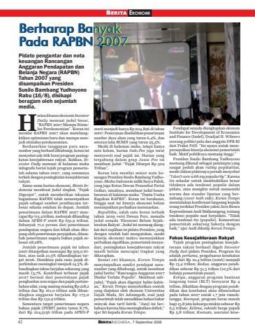 42 BERITAINDONESIA, 7 September 2006BERITA EKONOMIarian khusus ekonomi InvestorDaily memuat judul besar,“RAPBN 2007 Mampu Stimulus Perekonomian”. Koran inimenilai RAPBN 2007 akan membangkitkan optimisme baru dan mampu menjadi stimulus perekonomian.Berdasarkan tanggapan para narasumber yang berhasil dihubungi, koran inimenyebut ada titik berat program peningkatan kesejahteraan rakyat. Bahkan, Investor Daily memuat di halaman mukainfografis berisi tujuh program pemerintah selama tahun 2007, yang semuanyaterkait dengan peningkatan kesejahteraanrakyat.Sama-sama harian ekonomi, Bisnis Indonesia membuat judul singkat, “PajakDigenjot”, untuk memberikan tekananbagaimana RAPBN telah menempatkanpajak sebagai sumber pembiayaan terbesar selama setahun ke depan. Jumlahpenerimaan dalam RAPBN 2007 mencapai Rp 713,4 triliun, melonjak dibandingdalam APBN-P 2006 Rp 651,9 triliun.Sebanyak 71,2 persen dari penerimaanpendapatan negara dan hibah akan ditopang oleh penerimaan perpajakan, ditambah penerimaan negara bukan pajak sebesar 28,28%.Jumlah penerimaan pajak ini tahun2007 ditargetkan mencapai Rp 505,9 triliun, atau naik 21,5% dibandingkan target 2006. Demikian pula rasio pajak diperkirakan meningkat menjadi 14,3%, dibandingkan tahun berjalan sekarang yangmasih 13,7%. Kontribusi terbesar pajak2007 berasal dari penerimaan pajakpenghasilan non migas dan pajak pertambahan nilai, yang masing-masing Rp 218,2triliun dan Rp 161,0 triliun naik dibandingkan anggaran berjalan Rp 175,0triliun dan Rp 132,9 triliun.Sementara target penerimaan negarabukan pajak (PNBP) justru turun 8,7%,dari Rp 224,5156 triliun pada APBN-P2006 menjadi hanya Rp 204,896 di tahun2007. Penurunan disebabkan penerimaansumber daya alam yang turun 6,4%, dansetoran laba BUMN yang turun 25,5%.Meski di halaman muka, tetapi hanyasatu kolom, harian Indo.Pos juga turutmenyoroti soal pajak ini. Harian yangtergabung dalam grup Jawa Pos inimembuat judul: “Pajak Ditarget Rp 509Triliun”.Koran lain menilai minor nota keuangan Presiden Susilo Bambang Yudhoyono. Media Indonesia milik Surya Paloh,yang juga Ketua Dewan Penasehat PartaiGolkar, misalnya, membuat judul besarbesaran di halaman muka: “Dunia UsahaRagukan RAPBN”. Koran ini beralasan,hingga saat ini kinerja ekonomi belummenunjukkan perbaikan memuaskan.Republika, salah satu koran terbaiktahun 2005 versi Dewan Pers, menulisjudul senada ‘Ekonomi Belum Sejahterakan Rakyat’. Judul ini memang diangkat dari cuplikan isi pidato Presiden, yangdengan rendah hati mengatakan, meskikinerja ekonomi makro menunjukkanperbaikan signifikan, pemerintah menyadari, peningkatan kesejahteraan rakyatmasih belum mencapai tingkat yangdiharapkan.Sesuai ciri khasnya, Koran Tempomenyimpulkan sendiri pendapat narasumber yang dihubungi, untuk membuatjudul berita: “Rancangan Anggaran 2007Dinilai Terlalu Populis”. Membuat subjudul, “Pajak akan digenjot habis-habisan,” Koran Tempo menyebutkan contohyang diajukan oleh ekonom UniversitasGajah Mada, Sri Adiningsih, soal janjipemerintah tidak menaikkan bahan bakarminyak dan tarif listrik. “Janji ini berbahaya karena bisa meningkatkan defisit,”ujar Sri kepada Koran Tempo.Pendapat senada diungkapkan ekonomInstitute for Development of Economicsand Finance (Indef), Dradjad H. Wibowoseorang politisi pula dan anggota DPR RIdari Fraksi PAN. “Ini upaya untuk mempersepsikan kinerja ekonomi pemerintahbaik. Motif politiknya memang tinggi.”Presiden Susilo Bambang Yudhoyonomemang dikenal sebagai pemimpin yangsangat peduli akan rating popularitas,meski dalam pidatonya pernah menyebut“I don’t care with my popularity”. Karenaitu sekadar untuk membuktikan benartidaknya ada tendensi populis dalampidato, atau mungkin untuk memenuhinorma dan standar liputan yang berimbang (cover both side), Koran Tempomemintakan konfirmasi langsung kepadaorang terdekat Presiden yakni Juru BicaraKepresidenan Andi Mallarangeng, tentangtendensi populis saat berpidato. “Tidakada tendensi itu (populis). Konsentrasipemerintah sekarang bekerja denganbaik,” ujar Andi dikutip Koran Tempo.Fokus Kesejahteraan RakyatTujuh program peningkatan kesejahteraan rakyat berhasil digali InvestorDaily dari pidato Presiden. Program ituadalah pertama, pengeluaran kesehatannaik dari Rp 10,4 triliun (2006) menjadiRp 13,4 triliun; Kedua, anggaran pendidikan sebesar Rp 51,3 triliun (10,3% daribelanja pemerintah pusat).Ketiga, anggaran program bantuanlangsung tunai (BLT) bersyarat Rp 4triliun, dikaitkan dengan program pendidikan dan kesehatan akan diluncurkanpada tahun 2007 untuk 1,7 juta rumahtangga; Keempat, program beras murahbagi 15,8 juta keluarga miskin sebesar Rp6,5 triliun; Kelima, subsidi harga pupukRp 5,8 triliun; Keenam, asuransi kesePidato pengantar dan notakeuangan RancanganAnggaran Pendapatan danBelanja Negara (RAPBN)Tahun 2007 yangdisampaikan PresidenSusilo Bambang YudhoyonoRabu (16/8), disikapiberagam oleh sejumlahmedia.HBerharap BanyakPada RAPBN 2007Berharap BanyakPada RAPBN 2007