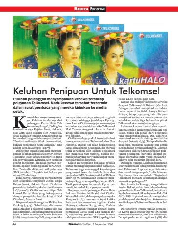 44 BERITAINDONESIA, 7 September 2006BERITA EKONOMIKeluhan Penipuan Untuk TelkomselPuluhan pelanggan menyampaikan kecewa terhadappelayanan Telkomsel. Nada kecewa tersebut tercermindalam surat pembaca yang mereka kirimkan ke mediacetak.onyol dan sangat mengganggu. Keluhan ini datang daripelanggan Kartu Halo Telkomsel sejak 1996, Diding Sukowiradi, warga Pejaten Barat, Jakarta,atas SMS yang dikirim oleh Newslink,sejak dua bulan terakhir. SMS tersebut diaterima dari bangun tidur sampai dinihari.“Berita-beritanya tidak bermanfaat,bahkan cenderung berita sampah,” tulisDiding kepada Kompas (22/7).Diding pun sudah enam kali menyampaikan keluhan kepada customer serviceTelkomsel lewat layanan nomor 111, tidakada penyelesaian. Kiriman SMS semakingencar meskipun dia tidak pernah meminta, apalagi berlangganan dari Newslink. Tentu dia dibebani tarif pulsa atasSMS tersebut. “Apakah ini bukan penipuan?” keluhnya.Tidak hanya Diding yang merasa tertipuoleh Telkomsel, tetapi juga Cicilia, wargaKebon Jeruk, Jakarta Barat. Di dalampengaduan tertulisnya ke harian Kompas(26/7-2006), Cicilia merasa ditipu Telkomsel Kartu Halo yang bekerjasamadengan pengelola Sun Parking di MalCitraland, Jakarta Barat.Dia pernah sekali mengirim SMS ke SunParking (7475). Sebaliknya, dia menerima SMS dari Telkomsel Kartu Halo duakali setiap hari. Ini berlangsung tiga bulanlebih. Ketika membayar iuran bulanan(Juli), ternyata setiap SMS yang masuk keHP-nya dibebani biaya sebanyak 103 kaliRp 1.000, sehingga jumlahnya Rp 103.000. Lantas Cicilia mengajukan mengajukan keberatan melalui surat ke TelkomselMal Taman Anggrek, Jakarta Barat.Tetapi tidak ditanggapi, malah nomor HPnya diblokir.Cicilia menduga praktik tersebut kolusiterorganisir antara Telkomsel dan SunParking. Modus ini telah berlangsunglama, dan sebagai pelanggan, dia merasatelah dirugikan oleh oknum Telkomseldan pengelola Sun Parking. Cicilia meminta pihak yang berwenang dapat membongkar modus tersebut.Selain menciptakan berbagai produkuntuk menangguk pemasukan dari SMS,Telkomsel juga menangguk keuntunganyang sangat besar dari selisih biaya danpenjualan SMS. Ongkos produksi SMS sekitar Rp 76, kebanyakan operator menjualnya Rp 300 sampai Rp 500 per SMS.Tarif percakapan termurah Rp 14 permenit, termahal Rp 1.500 per menit.Rupanya, nasib pelanggan Kartu HaloLukman Hakim, lebih sial dari Cicilia.Warga Bekasi ini, dalam pengaduannya keKompas (21/7), merasa terkejut ketikaFebruari lalu menerima tagihan KartuHalonya, sebesar Rp 571.629. Dalamkuitansi tagihan terdapat rincian; biayapemakaian GPRS (dari 24/1 sampai 18/2) sebesar Rp 410.790. Lukman merasatidak pernah memakai GPRS, apalagi daripukul 24.00 sampai pagi hari.Lantas dia melapor langsung (4/3) keGrapari Telkomsel di Bekasi (a/n Ica).Petugas tersebut menjelaskan bahwakasus seperti itu tidak hanya dialamidirinya, tetapi juga yang lain. Dia punmenjelaskan bahwa untuk proses dibutuhkan waktu tiga bulan dan pihakTelkomsel akan menghubunginya.Lukman kecewa berat dan marah,karena setelah menunggu lebih dari tigabulan, tidak ada pihak dari Telkomselyang menghubunginya. Dia, akhirnyamemutuskan untuk datang kembali keGrapari Bekasi (26/5). Tetapi di situ diatidak bisa menemui seorang pun untukmengadukan permasalahannya. Lukmanpenasaran dan mendatangi bagian pelayanan pelanggan, bertemu dengan petugas bernama Putri yang menyarankannya agar membuat laporan baru.Ditunggu-tunggu, Lukman bertambahkecewa karena dia tidak pernah dihubungioleh Telkomsel. “Laporan saya didiamkandan masuk tong sampah,” tulis Lukman.Dia hanya bisa mengeluh, “BeginikahTelkomsel mencari keuntungan denganmerugikan pelanggan?”Dra. Annita Ap Sumogo, warga Jatiwaringin, Bekasi, sudah lima tahun berlangganan Kartu Halo Telkomsel, tetapi barutiga bulan mengaktifkan layanan Halo Cek(HC) 888 di ponsel untuk mengetahuijumlah pemakaian berjalan. KekecewaanAnnita kepada Telkomsel bermula 21 Julilalu.Di Ponselnya tertera jumlah pemakaian Kartu Halo sebesar Rp 78.157, belumtermasuk abonemen, PPn dan sebagainya.Tetapi pada surat tagihan (4/8) diaK