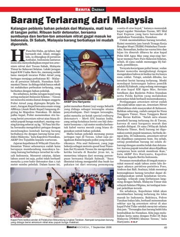 BERITAINDONESIA, 7 September 2006 49Barang Terlarang dari MalaysiaKalangan pebisnis bahan peledak dari Malaysia, mati kutudi tangan polisi. Ribuan butir detonator, bersamasumbunya dan berton-ton amonium nitrat gagal masuk keIndonesia. Di Sabah, Malaysia barang berbahaya ini mudahdiperoleh. Pasa bin Haba, 49 tahun, lagibernasib sial. Ahad, minggulalu, ia ditangkap di perairanAmbalat, Indonesia lantaranmencoba menyeludupkan empat ton amonium nitrat dari Tawau Sabah, MalaysiaTimur ke Sulawesi Selatan. Lelaki juragankapal KM Usaha Baru itu, memang sudahlama menjadi incaran Polisi Airud yangbertugas menjaga perbatasan RI - Malaysia di perairan Sebatik, Nunukan Kalimantan Timur. Ia diduga tidak hanya sekaliini melakukan perbuatan terlarang, yangberkaitan dengan bahan peledak.Itu sebabnya, ketika juragan kapal yangsering melayari Sulawesi Selatan – Tawauini mencoba minta damai dengan anggotaPolisi Airud yang dipimpin Bripda Sumari, Juragan Kapal bersama enam orangABKnya (Anak Buah Kapal) langsung digiring ke Mapolres Nunukan. Di dalampalka kapal, Polisi menemukan 162 karung berisi amonium nitrat atau biasa disebut pupuk bunga matahari, masing-masing karung seberat 25 kg. “H Pasa bin Haba berusaha mengelabui petugas denganmembungkus kembali karung barangberbahaya itu dengan karung beras produksi Malaysia,” kata Kapolres Nunukan,AKBP Drs Tajuddin kepada wartawan.Jajaran kepolisian di Wilayah Utara Kalimantan Timur sebenarnya sudah lamaberupaya membendung masuknya barang-barang berbahaya tersebut ke wilayah Indonesia. Menurut catatan, dalamtahun 2006 ini saja, polisi telah berhasilmenyita 3.000 butir detonator dan 1.736meter sumbu peledak. Dalam kasus ini,polisi menahan Raimi (29) warga Sebatikyang diduga sebagai tersangka utamapenyeludupan. Dari tangan tersangka,polisi menyita 30 kotak special ordinarydetonators – Merk IDL buatan India,yang setiap kotaknya berisi 100 biji detonator bersama 1.736 meter sumbu berbentuk kabel warna merah yang biasa digunakan untuk bahan peledak.Mafia bahan peledak memang punyajaringan rapi di Tawau. Lihat saja pengakuan Raimi kepada polisi yang memeriksanya. Pria asal Sulawesi, yang jugabekerja sebagai motoris speed boat Nunukan-Sei Nyamuk-Tawau itu mengatakan,ketika berada di Bandar jiran ini, iamenerima telepon dari seorang perempuan bernama Haijah Salmah. “Sayadimintai tolong mengambil dua buah taspakaian ini dari seorang penumpangwanita di atas kapal,” katanya menunjukkapal reguler Nunukan-Tawau, MV MidEast Express yang baru bersandar dipelabuhan Tunontaka, Nunukan.Untuk memindahkan barang tersebut,Raimi meminta jasa buruh Tenaga KerjaBongkar Muat (TKBM) Pelabuhan Tunontaka. Kemudian, kedua tas warna biru danhijau itu disuruh dibawa ke atas kapalPelni KM Agoa Mas yang siap-siap berlayar menuju Pare-Pare Sulawesi Selatan,sebab, di sana sudah menunggu Hj Salmah, pemiliknya.Ternyata kecurigaan polisi benar, walauRaimi mencoba menghalangi denganmengatakan bahwa isi kedua tas itu hanyasusu coklat. Tetapi, setelah dibuka, tastersebut berisi barang terlarang. Meskimendapat keterangan bahwa pemilikadalah Hj Salmah, yang sedang menunggudi atas kapal KM Agoa Mas, SatuanIntelkam dan Reskrim Polres Nunukanserta Polda Kaltim yang melakukanpencarian tidak berhasil menemukannya.Perdagangan amonium nitrat sudahada sejak tahun 1990-an. Amonium Nitratdibutuhkan oleh masyarakat di Sulawesi.Bahkan sekarang, sudah sampai ke NusaTenggara Timur, Nusa Tenggara Baratdan Berau Kaltim. “Salah satu alasanmembeli barang terlarang itu di Tawau,karena di sana harganya murah danmudah didapat. Di sana (Wilayah SabahMalaysia Timur, Red) barang ini digunakan untuk pupuk tanaman, berbeda dengan kita. Di Indonesia, amonium nitratitu dijadikan campuran bom. Itu sebab,setiap pembelian barang ini selalu dibarengi dengan sumbu ledak dan detonator, karena pupuk tersebut akan dijadikancampuran bom untuk membom ikan,”kata AKBP Drs Hariyanto, KapolresTarakan kepada Berita Indonesia.Perasaan menakutkan di tengah masyarakat muncul sejak tahun 2000 lalu dengan adanya peristiwa-peristiwa Poso,Ambon dan Bali. Soalnya, tidak menutupkemungkinan barang tersebut dapat disalahgunakan untuk kejahatan teroris.Apalagi, wilayah yang berbatasan langsung dengan Sabah, Malaysia Timur danwilayah Selatan Filipina, ini terdapat tempat pelatihan teroris.Itu sebabnya, Kepolisian tidak akanmembiarkan barang terlarang itu lolosmasuk ke Indonesia. Buktinya, PolresTarakan bulan lalu, berhasil menemukansekitar 150 kg amonium nitrat di ataskapal Pelni Tidar setelah menyisir selamadua jam. “Tersangka dan barang bukti kitakembalikan ke Nunukan. Kita juga melakukan kerja sama dengan Polisi Di RajaMalaysia (PDRM) khusus Tawau,” kataHariyanto. SLPKapal Pelni ketika sandar di Pelabuhan Melundung Lingkas Tarakan. Nampak tumpukan karungyang diduga berisi amonium nitrat atau pupuk bunga matahari.AKBP Drs HariyantoHBERITA DAERAH