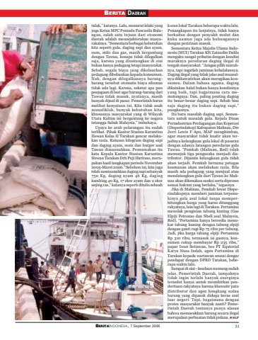 BERITAINDONESIA, 7 September 2006 51BERITA DAERAHtidak,” katanya. Lalu, menurut lelaki yangjuga Ketua MPC Pemuda Pancasila Bulungan, salah satu tujuan dari otonomidaerah adalah mensejahterakan masyarakatnya. “Sementara berbagai kebutuhankita seperti gula, daging sapi dan ayam,susu, milo dan gas, masih bergantungdengan Tawau, kenapa tidak dilegalkansaja, karena yang diuntungkan di sinibukan hanya pedagang tetapi masyarakat.Sebab, segala biaya yang dikeluarkanpedagang dibebankan kepada konsumen.Nah, dengan dilegalkannya barangbarang tersebut otomatis biaya silumantidak ada lagi. Karena, seketat apa punpenjagaan di laut agar barang-barang dariTawau tidak masuk, nyatanya, masihbanyak dijual di pasar. Pemerintah harusmelihat kenyataan ini. Kita tidak usahmunafiklah, banyak kebutuhan kita,khususnya masyarakat yang di WilayahUtara Kaltim ini bergantung ke negaratetangga Sabah Malaysia,” imbuhnya.Upaya ke arah pelarangan itu sudahterlihat. Pihak Kantor Stasiun KarantinaHewan Kelas II Tarakan gencar melakukan razia. Ratusan kilogram daging sapidan daging ayam, sosis dan burger asalTawau dimusnahkan. Pemusnahan itukata Kepala Kantor Stasiun KarantinaHewan Tarakan Drh Puji Hartono, merupakan hasil tangkapan periode November2005-Maret 2006. “Sebelum ini, kita jugatelah memusnahkan daging sapi sebanyak750 Kg, daging ayam 46 Kg, dagingkambing 40 Kg, 17 ekor ayam dan 2 ekoranjing ras,” katanya seperti ditulis sebuahkoran lokal Tarakan beberapa waktu lalu.Penangkapan itu lanjutnya, tidak hanyaberkaitan dengan penyakit mulut dankuku namun juga ada hubungannyadengan perizinan masuk.Sementara Ketua Majelis Ulama Indonesia (MUI) Tarakan KH Zainudin Dalilamengaku sangat prihatin dengan kondisimaraknya peredaran daging ilegal ditengah masyarakat. “Jangan pilih murahnya, tapi ingatlah jaminan kehalalannya.Daging ilegal yang tidak jelas asal muasalnya dikhawatirkan akan merugikan konsumen. Dalam bahasa agama, dagingdikatakan halal bukan hanya kondisinyayang baik, tapi bagaimana cara memotongnya. Dan, paling penting dagingitu benar-benar daging sapi. Sebab bisasaja daging itu bukan daging sapi,”pungkasnya.Itu baru masalah daging sapi. Sementara untuk masalah gula. Kepala DinasPerindustrian Perdagangan dan Koperasi(Disperindakop) Kabupaten Malinau, DrsJerri Lewis F Apu, MAP menghimbau,agar masyarakat tidak kuatir akan terjadinya kelangkaan gula lokal di pasarandengan adanya larangan peredaran gulaTawau. “Pemkab (Malinau, Red) telahmenunjuk tiga pengusaha menjadi distributor. Dijamin kelangkaan gula tidakakan terjadi. Pemkab bersama petugaskeamanan akan melakukan razia. Bilamasih ada pedagang yang menjual ataumendatangkan gula dari Tawau ke Malinau akan dikenakan sanksi serta diprosessesuai hukum yang berlaku,” tegasnya.Jika di Malinau, Pemkab lewat Disperindakopnya memberi jaminan terpenuhinya gula asal lokal tanpa memperhitungkan harga yang harus ditanggungrakyatnya, lain lagi di Tarakan. Pertaminamenolak pengisian tabung kuning (GasElpiji Petronas dan Shell asal Malaysia,Red). “Pertamina hanya bersedia menukar tabung kuning dengan tabung elpijidengan ganti rugi Rp 75 ribu per tabung.Jadi, jika harga tabung elpiji PertaminaRp 310 ribu, termasuk isi gasnya, konsumen cukup membayar Rp 235 ribu,”papar Iwan Setiawan, bos PT EqutorialKarya Nusa Indah, agen Pertamina diTarakan kepada wartawan seusai dengarpendapat dengan DPRD Tarakan, beberapa waktu lalu.Sampai di sini - keadaan memang sudahjelas. Pemerintah Daerah, tampaknyatidak ingin terlalu banyak energinyatersedot hanya untuk memikirkan penderitaan rakyatnya karena khawatir paradistributor dan agen hengkang walaubarang yang dipasok diduga keras asalluar negeri. Tapi, bagaimana denganprotes masyarakat banyak nanti? Pemerintah Daerah tentunya punya alasanbahwa memasukkan barang secara ilegalmerupakan perbuatan tidak pidana. SLP