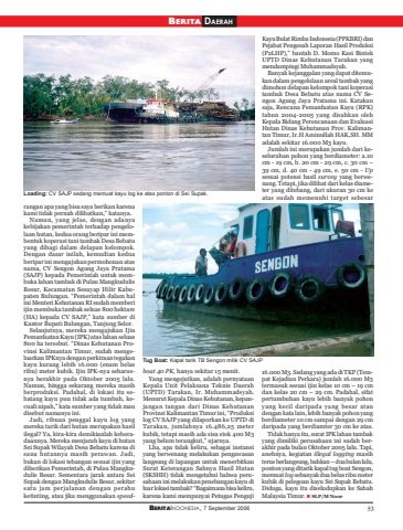BERITAINDONESIA, 7 September 2006 53BERITA DAERAHrangan apa yang bisa saya berikan karenakami tidak pernah dilibatkan,” katanya.Namun, yang jelas, dengan adanyakebijakan pemerintah terhadap pengelolaan hutan, kedua orang beripar ini membentuk koperasi tani tambak Desa Bebatuyang dibagi dalam delapan kelompok.Dengan dasar inilah, kemudian keduaberipar ini mengajukan permohonan atasnama, CV Sengon Agung Jaya Pratama(SAJP) kepada Pemerintah untuk membuka lahan tambak di Pulau MangkudulisBesar, Kecamatan Sesayap Hilir Kabupaten Bulungan. “Pemerintah dalam halini Menteri Kehutanan RI sudah memberiijin membuka tambak seluas 800 hektare(HA) kepada CV SAJP,” kata sumber diKantor Bupati Bulungan, Tanjung Selor.Selanjutnya, mereka mengajukan IjinPemanfaatan Kayu (IPK) atas lahan seluas800 ha tersebut. “Dinas Kehutanan Provinsi Kalimantan Timur, sudah mengeluarkan IPKnya dengan perkiraan tegakankayu kurang lebih 16.000 (enam belasribu) meter kubik. Ijin IPK-nya seharusnya berakhir pada Oktober 2005 lalu.Namun, hingga sekarang mereka masihberproduksi. Padahal, di lokasi itu sebatang kayu pun tidak ada tumbuh, kecuali nipah,” kata sumber yang tidak maudisebut namanya ini.Jadi, ribuan penggal kayu log yangmereka tarik dari hutan merupakan hasililegal? Ya, kira-kira demikianlah keberadaannya. Mereka menjarah kayu di hutanSei Supak Wilayah Desa Bebatu karena disana hutannya masih perawan. Jadi,bukan di lokasi tebangan sesuai ijin yangdiberikan Pemerintah, di Pulau Mangkudulis Besar. Sementara jarak antara SeiSupak dengan Mangkudulis Besar, sekitarsatu jam perjalanan dengan perahuketinting, atau jika menggunakan speedboat 40 PK, hanya sekitar 15 menit.Yang mengejutkan, adalah pernyataanKepala Unit Pelaksana Teknis Daerah(UPTD) Tarakan, Ir. Muhammadsyah.Menurut Kepala Dinas Kehutanan, kepanjangan tangan dari Dinas KehutananProvinsi Kalimantan Timur ini, “Produksilog CV SAJP yang dilaporkan ke UPTD diTarakan, jumlahnya 16.486,25 meterkubik, tetapi masih ada sisa stok 400 M3yang belum terangkut,” ujarnya.Lha, apa tidak keliru, sebagai instansiyang berwenang melakukan pengawasanlangsung di lapangan untuk menerbitkanSurat Keterangan Sahnya Hasil Hutan(SKSHH) tidak mengetahui bahwa perusahaan ini melakukan penebangan kayu diluar lokasi tambak? “Bagaimana bisa keliru,karena kami mempunyai Petugas Penguji16.000 M3. Sedang yang ada di TKP (Tempat Kejadian Perkara) jumlah 16.000 M3termasuk sesuai ijin kelas 10 cm – 19 cmdan kelas 20 cm – 29 cm. Padahal, sifatpertumbuhan kayu lebih banyak pohonyang kecil daripada yang besar ataudengan kata lain, lebih banyak pohon yangberdiameter 10 cm sampai dengan 29 cmdaripada yang berdiamter 30 cm ke atas.Tidak hanya itu, surat IPK lahan tambakyang dimiliki perusahaan ini sudah berakhir pada bulan Oktober 2005 lalu. Tapi,anehnya, kegiatan illegal logging masihterus berlangsung, bahkan – dua bulan lalu,ponton yang ditarik kapal tug boat Sengon,memuat log sebanyak dua belas ribu meterkubik di pelegoan kayu Sei Supak Bebatu.Diduga, kayu itu diseludupkan ke SabahMalaysia Timur. SLP/M NoorKayu Bulat Rimba Indonesia (PPKBRI) danPejabat Pengesah Laporan Hasil Produksi(P2LHP),” bantah D. Momo Kasi BintekUPTD Dinas Kehutanan Tarakan yangmendampingi Muhammadsyah.Banyak kejanggalan yang dapat ditemukan dalam pengelolaan areal tambak yangdimohon delapan kelompok tani koperasitambak Desa Bebatu atas nama CV Sengon Agung Jaya Pratama ini. Katakansaja, Rencana Pemanfaatan Kayu (RPK)tahun 2004-2005 yang disahkan olehKepala Bidang Perencanaan dan EvaluasiHutan Dinas Kehutanan Prov. Kalimantan Timur, Ir.H Aminullah HAK,SH. MMadalah sekitar 16.000 M3 kayu.Jumlah ini merupakan jumlah dari keseluruhan pohon yang berdiameter: a.10cm - 19 cm, b. 20 cm - 29 cm, c. 30 cm –39 cm, d. 40 cm - 49 cm, e. 50 cm - Upsesuai potensi hasil survey yang berwenang. Tetapi, jika dilihat dari kelas diameter yang ditebang, dari ukuran 30 cm keatas sudah memenuhi target sebesar Loading: CV SAJP sedang memuat kayu log ke atas ponton di Sei Supak.Tug Boat: Kapal tarik TB Sengon milik CV SAJP