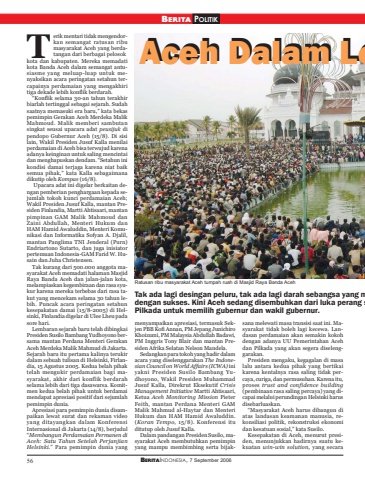 56 BERITAINDONESIA, 7 September 2006BERITA POLITIKerik mentari tidak mengendorkan semangat ratusan ribumasyarakat Aceh yang berdatangan dari berbagai pelosokkota dan kabupaten. Mereka memadatikota Banda Aceh dalam semangat antusiasme yang meluap-luap untuk menyaksikan acara peringatan setahun tercapainya perdamaian yang mengakhiritiga dekade lebih konflik berdarah.“Konflik selama 30-an tahun terakhirbiarlah tertinggal sebagai sejarah. Sudahsaatnya memasuki era baru,” kata bekaspemimpin Gerakan Aceh Merdeka MalikMahmoud. Malik memberi sambutansingkat seusai upacara adat peusijuk dipendopo Gubernur Aceh (15/8). Di sisilain, Wakil Presiden Jusuf Kalla menilaiperdamaian di Aceh bisa terwujud karenaadanya keinginan untuk saling mencintaidan menghapuskan dendam. “Setahun inikondisi damai terjaga karena niat baiksemua pihak,” kata Kalla sebagaimanadikutip oleh Kompas (16/8). Upacara adat ini digelar berkaitan dengan pemberian penghargaan kepada sejumlah tokoh kunci perdamaian Aceh;Wakil Presiden Jusuf Kalla, mantan Presiden Finlandia, Martti Ahtisaari, mantanpimpinan GAM Malik Mahmoud danZaini Abdullah, Menteri Hukum danHAM Hamid Awaluddin, Menteri Komunikasi dan Informatika Sofyan A. Djalil,mantan Panglima TNI Jenderal (Purn)Endriartono Sutarto, dan juga inisiatorpertemuan Indonesia-GAM Farid W. Husain dan Juha Christensen.Tak kurang dari 500.000 anggota masyarakat Aceh memadati halaman MasjidRaya Banda Aceh dan jalan-jalan kota,melampiaskan kegembiraan dan rasa syukur karena mereka terbebas dari rasa takut yang mencekam selama 30 tahun lebih. Puncak acara peringatan setahunkesepakatan damai (15/8-2005) di Helsinki, Finlandia digelar di Ulee Lheu padasore hari.Lembaran sejarah baru telah dibingkaiPresiden Susilo Bambang Yudhoyono bersama mantan Perdana Menteri GerakanAceh Merdeka Malik Mahmud di Jakarta.Sejarah baru itu pertama kalinya terukirdalam sebuah tulisan di Helsinki, Firlandia, 15 Agustus 2005. Kedua belah pihaktelah mengukir perdamaian bagi masyarakat, akhir dari konflik berdarahselama lebih dari tiga dasawarsa. Komitmen kedua belah pihak untuk berdamaimendapat apresiasi positif dari sejumlahpemimpin dunia.Apresiasi para pemimpin dunia disampaikan lewat surat dan rekaman videoyang ditayangkan dalam KonferensiInternasional di Jakarta (14/8), berjudul“Membangun Perdamaian Permanen diAceh: Satu Tahun Setelah PerjanjianHelsinki.” Para pemimpin dunia yangT Aceh Dalam L Aceh Dalam LeTak ada lagi desingan peluru, tak ada lagi darah sebangsa yang mdengan sukses. Kini Aceh sedang disembuhkan dari luka perang sPilkada untuk memilih gubernur dan wakil gubernur.menyampaikan apresiasi, termasuk Sekjen PBB Kofi Annan, PM Jepang JunichiroKhoizumi, PM Malaysia Abdullah Badawi,PM Inggris Tony Blair dan mantan Presiden Afrika Selatan Nelson Mandela.Sedangkan para tokoh yang hadir dalamacara yang diselenggarakan The Indonesian Council on World Affairs (ICWA) iniyakni Presiden Susilo Bambang Yudhoyono, Wakil Presiden MuhammadJusuf Kalla, Direkrut Eksekutif CrisisManagement Initiative Martti Ahtisaari,Ketua Aceh Monitoring Mission PieterFeith, mantan Perdana Menteri GAMMalik Mahmud al-Haytar dan MenteriHukum dan HAM Hamid Awaluddin.(Koran Tempo, 15/8). Konferensi ituditutup oleh Jusuf Kalla.Dalam pandangan Presiden Susilo, masyarakat Aceh membutuhkan pemimpinyang mampu membimbing serta bijaksana melewati masa transisi saat ini. Masyarakat tidak boleh lagi kecewa. Landasan perdamaian akan semakin kokohdengan adanya UU Pemerintahan Acehdan Pilkada yang akan segera diselenggarakan.Presiden mengaku, kegagalan di masalalu antara kedua pihak yang bertikaikarena kentalnya rasa saling tidak percaya, curiga, dan permusuhan. Karena itu,proses trust and confidence building(pembinaan rasa saling percaya) yang dicapai melalui perundingan Helsinki harusdisebarluaskan.“Masyarakat Aceh harus dibangun diatas landasan keamanan manusia, rekonsiliasi politik, rekonstruksi ekonomidan kesatuan sosial,” kata Susilo.Kesepakatan di Aceh, menurut presiden, menunjukkan hadirnya suatu kekuatan win-win solution, yang secaraRatusan ribu masyarakat Aceh tumpah ruah di Masjid Raya Banda Aceh