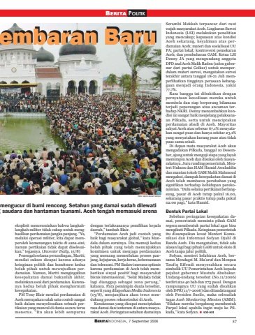 BERITAINDONESIA, 7 September 2006 57BERITA POLITIKembaran Baru embaran BaruSerambi Mekkah terpancar dari rautwajah masyarakat Aceh. Lingkaran SurveiIndonesia (LSI) melakukan penelitianyang mencakup; kepuasan atas kondisiAceh sekarang, keyakinan atas perdamaian Aceh; materi dan sosialisasi UUPA; partai lokal; kontroversi pemekaranAceh; dan pembubaran GAM. Ketua LSIDenny JA yang mengundang anggotaDPD asal Aceh Malik Raden (calon gubernur dari partai Golkar) untuk memperdalam materi survei, mengatakan surveiterakhir antara tanggal 18-21 Juli memperlihatkan tingginya perasaan kebanggaan menjadi orang Indonesia, yakni77,7%.Rasa bangga ini dibuktikan denganpernyataan kesediaan mereka untukmembela dan siap berperang bilamanaterjadi peperangan atau ancaman terhadap NKRI. Denny menambahkan kondisi ini sangat baik menjelang pelaksanaan Pilkada, serta untuk menciptakanperdamaian abadi di Aceh. Mayoritasrakyat Aceh atau sebesar 67,1% menyatakan sangat puas dan hanya sekitar 23,1%yang menyatakan kurang puas atau tidakpuas sama sekali.Di depan mata masyarakat Aceh akanmengadakan Pilkada, tanggal 10 Desember, ajang untuk menguji siapa yang layakmemimpin Aceh dan disukai oleh masyarakatnya. Juru runding pemerintah, Menteri Hukum dan HAM Hamid Awaluddindan mantan tokoh GAM Malik Mahmoudmengakui, dampak kesepakatan damai diAceh telah membawa perubahan yangsignifikan terhadap kehidupan perekonomian. “Dulu selama pertikaian berlangsung, pasar di Aceh tutup pukul 16.00,sekarang pasar praktis tutup pada pukul02.00 pagi,” kata Hamid.Bentuk Partai LokalSebelum peringatan kesepakatan damai, pemerintah meminta pihak GAMsegera membentuk partai lokal agar bisamengikuti Pilkada. Keinginan pemerintahitu disampaikan lewat Menteri Komunikasi dan Informasi Sofyan Djalil diBanda Aceh. Dia mengatakan, tidak adaalasan lagi bagi pihak GAM untuk eksis diAceh tanpa jalur politik.Sofyan, menteri kelahiran Aceh, bersama Mendagri M. Ma’aruf dan MenpanTaufiq Effendi menyerahkan secarasimbolik UU Pemerintahan Aceh kepadapejabat gubernur Mustafa Abubakar.Undang-undang tersebut (No.11/2006)terdiri atas 40 bab dan 273 pasal. Denganrampungnya UU yang sudah disahkanoleh DPR (11/7-2006) dan ditandatanganioleh Presiden Susilo, maka selesailahtugas Aceh Monitoring Mission (AMM).“Silakan mereka bergabung membentukParpol lokal apabila ingin maju ke Pilkada,” kata Sofyan. AM-SHfoto: repro koran tempo mengucur di bumi rencong. Setahun yang damai sudah dilewatig saudara dan hantaman tsunami. Aceh tengah memasuki arenaeksplisit mencerminkan bahwa langkahlangkah militer tidak cukup untuk menghasilkan perdamaian jangka panjang. “Ya,melalui operasi militer, kita dapat memperoleh kemenangan taktis di sana-sini,namun pertikaian tidak dapat diselesaikan,” tegasnya. (Investor Daily, 15/8)Penengah selama perundingan, Martti,menilai sukses dicapai karena adanyakeinginan politik dan komitmen keduabelah pihak untuk mewujudkan perdamaian. Namun, Martti mengingatkankesepakatan damai bukanlah akhir,melainkan awal dari perdamaian. Karenanya kedua belah pihak menghormatikesepakatan.PM Tony Blair menilai perdamaian diAceh merupakan salah satu contoh sangatbaik dalam menyelesaikan sebuah pertikaian yang muncul di dunia secara terusmenerus. “Itu akan lebih sempurnadengan terlaksananya pemilihan kepaladaerah,” tambah Blair.“Perdamaian Aceh jadi contoh yangbaik bagi masyarakat global,” kata Mandela dalam suratnya. Dia memuji keduabelah pihak yang telah menunjukkankomitmen untuk menjaga perdamaianyang memang memerlukan proses panjang, kejujuran, kerja keras, kebersamaandan toleransi. PM Badawi merasa optimiskarena perdamaian di Aceh telah memberikan sinyal positif bagi masyarakatbisnis internasional. “Selat Malaka tidaklagi dianggap sebagai zona perang,”katanya. Para pemimpin dunia tersebut,seperti yang dilaporkan Media Indonesia(15/8), menjanjikan akan terus mendukung proses rekonstruksi di Aceh.Kesuksesan yang dicapai menciptakanrasa damai dan tenteram di antara masyarakat Aceh. Peringatan setahun damainya