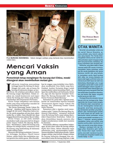 BERITAINDONESIA, 7 September 2006 63BERITA KESEHATANMencari Vaksinyang AmanPemerintah tetap mengimpor flu burung dari China, meskiditengarai akan menimbulkan mutasi gen.OTAK WANITABenarkah ada perbedaan antara priadan wanita? Menurut Brizendine, seorang psikiater yang menulis sebuahbuku yang berjudul The Female Brain,mengatakan bahwa pria dan wanita memiliki perbedaan seperti mengapa wanitalebih menyukai boneka, berbelanja, dankurang memikirkan seks daripada pria?Brizendine, yang dalam setahun dapatmerawat sekitar 600 wanita di kliniknya,mengatakan bahwa perbedaan antarapria dan wanita disebabkan oleh karenakeduanya memiliki otak yang berbeda.Ia mengatakan wanita dapat bersikaplebih sabar dan tenang daripada priakarena otak bagian prefrontal cortex wanita berukuran lebih besar dan lebih duluberkembang dibandingkan pria. Ia jugamengatakan wanita lebih mudah cemaskarena otak bagian anterior cingulate cortex wanita lebih besar dibandingkan pria.Wanita juga kurang mengambil risiko fisikdan terlibat dalam perkelahian dibandingkan pria karena otak bagian amygdalawanita berukuran lebih kecil.Pendapat Brizendine tersebut menuaibanyak kritik dari berbagai pihak. Beberapa dokter dan ilmuwan sosial mengatakan Brizendine telah merendahkan wanita dan membangkitkan kembali sterotipe gender. Janet Hyde, seorang psikolog, berdasarkan penelitian yang telah ialakukan yaitu membandingkan perilakudan emosi antara pria dan wanita, berkesimpulan bahwa perbedaan antaragender secara statistik mendekati nol. Dr.Nancy C. Andersen, seorang psikiater,mengatakan bahwa pola asuhlah yangberperan penting dalam membentuk perilaku manusia dan bukan faktor biologis.Meskipun mendapat kritik dari berbagai pihak, Brizendine yakin bahwabuku Female Brain dapat membantuwanita untuk lebih memahami keunikandiri mereka dan mengatasi masalah yangmereka hadapi. DAPIFLU BURUNG INDONESIA: Vaksin dengan subtipe yang berbeda bisa menimbulkanvarian baru.ndonesia tergolong penyandangtertinggi kasus flu burung di dunia.Hingga Juli 2006, ada 52 kasus fluburung di Indonesia dengan 42 korban tewas. Itu sebabnya persediaan vaksinflu burung sangat diperlukan. Dalam sepekan ini, terjadi kontroversi soal imporvaksin flu burung dari China yang direkomendasikan oleh Departemen Pertanian.Koran Tempo tampaknya satu-satunyamedia yang tetap melaporkan masalah inisecara konsisten dan intensif.“Bio Farma Pemenang Tender Vaksin FluBurung”, demikian judul laporan harian initanggal 28 Juli 2008. Dilaporkan bahwa tender itu untuk pengadaan 48 juta dosis vaksinsenilai Rp 12 miliar. Dana diambil dari danatanggap darurat bencana sebesar Rp 107 miliar.Koran Tempo, 31 Juli 2006, kembalimembahas topik yang sama kali ini denganjudul “Impor Vaksin Flu Burung Berbahaya.” Masalahnya, vaksin flu burung yangdiimpor itu subtipe H5N2, sementara virusflu burung yang berkembang di Indonesiaadalah subtipe H5N1.Menurut ahli biologi molekuler Universitas Airlangga, Surabaya, Chairil AnwarNidom, vaksin H5N2 bisa melakukan mutasi genetis dan makin ganas. Bila disuntikkan ke unggas yang terinfeksi virus H5N1,akan membentuk virus H5N2 yang baru.Padahal, Institut Pertanian Bogor sudahmemproduksi vaksin bersubtipe H5N1. Antigen dan antibodinya asli Indonesia. Selainitu, juga ada dua laporan berjudul “Sertifikasi Flu Burung Bermasalah” dan “BioFarma Terancam Batal Menang.”Sementara itu, pada edisi 1 Agustus 2006,harian ini menurunkan laporan berjudul“Pemerintah Ngotot Impor Vaksin FluBurung” dan “Pemenang Tender VaksinH5N2 Ditunda.”Sementara edisi 2 Agustus 2006 menurunkan judul “Vaksin Flu Burung Khas Indonesia Diproduksi,” mengenai antibodivirus flu burung H5N1 yang sedang diproduksi Departemen Kesehatan. Vaksin iniakan disuntikkan kepada manusia jikatingkat penularannya sudah dari manusiake manusia.Pemerintah akhirnya memastikan kedatangan 48 juta dosis vaksin flu burung subtipeH5N2 dari China. Belum diketahui siapasebenarnya yang memenangkan tender.Namun demikian, kritik belum mereda. Vaksindengan subtipe yang berbeda dengan subtipeflu burung Indonesia dianggap bisa memunculkan varian flu burung yang baru. RH
