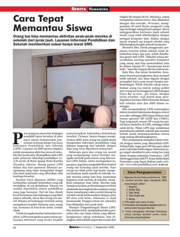 66 BERITAINDONESIA, 7 September 2006ara orang tua siswa dan kalanganpendidik harus bersabar di jalurantri untuk memperoleh penjelasan tentang fungsi LayananInformasi Pendidikan dan Sekolah(LIPS). Layanan via SMS (pesan singkat)untuk memantau aktivitas siswa di sekolah dari jarak jauh, ditampilkan oleh LIPSpada pameran teknologi pendidikan (2-4/8-2006) di Balai Agung Hotel KartikaChandra, Jakarta. Ruang pamer LIPSdalam dua hari pameran dibanjiri pengunjung yang ingin mengetahui fungsidan jenis pelayanan yang diberikan olehlembaga tersebut.Sumber Daya Manusia (SDM) yangberkualitas menjadi kebutuhan yang takterelakkan di era globalisasi. Karena itumutlak diperlukan sistem pendidikanyang juga bermutu. Hal ini bisa diraihlewat kerjasama dan hubungan yang idealantara sekolah, siswa dan orang tua murid. Selama ini hubungan tersebut seringmengalami kendala lantaran para orangtua, terutama di kota-kota besar, terlalusibuk.Untuk mengakomodasi kebutuhan tersebut, LIPS menciptakan suatu sistem pelayanan informasi yang secara terpadumenyinergikan kebutuhan-kebutuhantersebut. Caranya, hanya dengan mengirimkan SMS, para orang tua sudah dapatmengetahui informasi pendidikan yangdidapat langsung dari sekolah, dengandata yang terus diperbarui setiap hari.Beberapa guru dan orang tua muridyang mengunjungi stand tersebut mengaku tertarik pada sistem yang ditawarkan LIPS. Sebab, selain meringankan tugas guru, juga bisa mengefektifkan kontrolorang tua terhadap anak mereka. Paraorang tua tidak perlu lagi kuatir mengenai keadaan anak mereka di sekolah, sebab mereka setiap saat bisa memantaukegiatan anak mereka di sekolah, mengikuti pelajaran atau tidak. Mereka jugamempercayakan perkembangan prestasiakademik dan tingkah laku anaknya tanpaharus membuang waktu untuk datang kesekolah untuk berkonsultasi dengan guruBP atau wali kelas, bilamana si anakbermasalah. Dengan sistem ini, interaksibisa dilakukan dari jarak jauh.Manajer Pengembangan Bisnis LIPS,Eko Arinato S.Pd, menjelaskan bahwa prosedur dan cara kerja sistem yang dikembangkannya cukup sederhana, bisa dijangkau oleh sekolah negeri dan swasta daritingkat SD sampai SLTA. Misalnya, untukmengetahui absensi siswa, bisa dilakukandengan dua metode. Pertama, menggunakan ID card (kartu pengenal) yangjuga berfungsi sebagai kartu pelajar. Siswamenggosokkan kartunya pada sebuahmesin yang telah dihubungkan denganjaringan komputer data. Kedua, denganmesin stempel cap jempol sekolah yangdihubungkan dengan sebuah komputer.Menurut Eko, untuk penggunaan peralatan tersebut pihak sekolah tidak dibebankan biaya apa pun, sebab disediakan gratis oleh LIPS. “Sekolah cukup menyediakan seorang operator komputeryang setiap saat bisa memasukkan datake dalam sebuah PC. Operatornya kamilatih,” kata Eko kepada Berita Indonesia.Kata Eko, dua tahun kemudian, komputer beserta perangkatnya akan menjadimilik sekolah, dan akan diganti denganperangkat baru yang sesuai dengan perkembangan. Pihak sekolah cukup meyakinkan orang tua murid, paling sedikit500 orang tua berlangganan SMS denganbiaya Rp 12.000,- per bulan. Denganiuran tersebut, wali murid akan mendapatkan layanan SMS sebanyak delapankali sebulan atau dua SMS dalam seminggu.Eko menambahkan LIPS menerapkansistem tersebut bekerjsama dengan contentprovider sehingga SMS dapat diakses darisemua operator HP (GSM dan CDMA).Tapi yang pasti, nomor HP orang tua murid harus terdaftar di LIPS, sehingga tidaksalah kirim. Pihak LIPS siap melakukanpresentasi ke sekolah-sekolah atau instansiterkait untuk memasyarakatkan sistemyang sedang dikembangkannya.Para pengunjung mengaku cukup tertarik dengan sistem yang ditawarkan LIPS.Paling tidak, tugas guru BP dan guru piketserta wali kelas lebih ringan. Sistemnya juga sangat membantu para orang tua yangsibuk dengan pekerjaan kantornya. LIPSdiselenggarakan oleh PT Arum Mulia BaktiNusantara yang dapat diakses pada website : www.info.pendidikan.com. SB-SHCara TepatMemantau SiswaOrang tua bisa memantau aktivitas anak-anak mereka disekolah dari jarak jauh. Layanan Informasi Pendidikan danSekolah memberikan solusi hanya lewat SMS.PCara Pengoperasian1. Masukan Nomor Kode murid kirim ke : 39852. Content provider akan menjawab SMSanda dengan pilihan :1. Absensi,2. Daftar Nilai,3. Tata Tertib,4. Tata Usaha dan5. Berita.3. Pilih salah satu menu di atas.4. Anda akan mendapatkan jawaban dari content provider berupa nilai-nilai.5. Untuk mengakses informasi berikutnyacukup mereply kembali nomor untukinformasi yang diinginkan.BERITA HUMANIORAfoto: berindo subhan