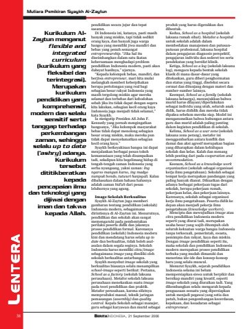38 BERITAINDONESIA, 21 September 2006pendidikan secara jujur dan tepatsasaran.Di Indonesia ini, katanya, pasti masihbanyak yang miskin, tapi tidak sedikitorang kaya, dan banyak juga wargabangsa yang memiliki jiwa mandiri danbebas yang penuh semangatentrepreneurship. “Jika hal itudiseimbangkan dalam satu ikatankebersamaan menghadapi problempendidikan Indonesia modern, pasti akandahsyat hasilnya,” ujarnya.“Kepada kelompok bebas, mandiri, danberjiwa entrepreneur, mari kita mulaimelangkah memberi keberpihakanberupa pertolongan yang real bagisebagian besar rakyat Indonesia yangmasih tergolong miskin agar merekaselamat dan terbebas dari kebodohansebab jika itu tidak dapat dengan segerakita lakukan, sebagian kecil orang kayaIndonesia juga menjadi tidak selamat,”kata Syaykh.Ia mengutip Presiden AS John F.Kennedy yang pernah mengingatkanbangsanya, “Jika kelompok masyarakatbebas tidak dapat menolong sebagianbesar orang miskin, maka mereka puntidak dapat menyelamatkan sebagiankecil orang kaya.”Syaykh berkeyakinan bangsa ini dapatmenjalankan berbagai pesan tokohkemanusiaan yang telah disampaikantadi, sekalipun kita begelimang hidup ditengah-tengah zaman Indonesia yangserba nyungsang, yakni zaman: Ingngarso mangun karso, ing madyonumpuk bondo, tutwuri hanjegali. Kalaudibahasakan dalam bahasa halusnyaadalah zaman bid’ah dari pesanleluhurnya yang agung.Image Sekolah BerkualitasSyaykh Al-Zaytun juga memberigambaran tentang pendidikan (sekolah)Indonesia modern, sebagaimanadirintisnya di Al-Zaytun ini. Menurutnya,pendidikan dan sekolah akan sangatmemengaruhi pada pembentukanperilaku peserta didik dan jalannyaproses pendidikan formal. Karenanyapendidikan (sekolah) Indonesia modernkini dan mendatang harus selalu up todate dan berkualitas, tidak boleh asalasalan dalam segala seginya. SekolahIndonesia harus memiliki citra/imagesebagaimana image yang dimiliki olehsekolah berkualitas antarbangsa.Syaykh menyebut image sekolah yangberkualitas biasanya selalu menampilkanschool-image seperti berikut: Pertama,School as a factory (sekolah laksanaperusahaan). Metafor sekolah laksanaperusahaan menekankan suatu imagepada teori pendidikan dan praktik.Metafor perusahaan, karena sifatnyamemproduksi massal, teknik jaringanpemasangan (assembly) dan qualitycontrol. Kepala Sekolah sebagai manajer,guru sebagai karyawan dan murid sebagaiproduk yang harus digerakkan dandibentuk.Kedua, School as a hospital (sekolahlaksana rumah sihat). Metafor a hospitaluntuk sekolah adalah dalammembedakan manajemen dan putusanputusan profesional, laksana hospitaldalam pengajaran diagnosis perspektif,pengajaran individu dan sederet tes sertapendekatan yang bersifat klinik.Ketiga, School as a log (sekolah laksanalog), mengacu kepada bentuk sekolahklasik di mana dasar-dasar yangditekankan, guru diberi penghormatandan status yang tinggi, diseleksi secaracermat dan ditunjang dengan materi dansumber-sumber lainnya.Keempat, School as a family (sekolahlaksana keluarga), menunjukkan bahwamurid harus dilayani/diperlakukansebagai individu yang utuh, seluruh anakdidik, harus dididik dan mereka tidakdipaksa sebelum mereka siap. Model inimengasumsikan bahwa hubungan antaraguru dan murid adalah paling pentingdalam kegiatan pendidikan di sekolah.Kelima, School as a war zone (sekolahlaksana zona perang), metafor inimenggambarkan antara konflik dandamai dan aksi agresif merupakan bagianyang diharapkan dalam kehidupansekolah dan kelas. Kalah dan menanglebih penting dari pada cooperation andaccommodation.Keenam, School as a knowledge workorganization (sekolah sebagai organisasikerja ilmu pengetahuan). Sekolah sebagaitempat kerja merupakan pandangan yangpaling banyak dianut. Dikuatkan denganadanya berbagai pekerjaan tugas darisekolah, berupa pekerjaan rumah,pekerjaan kelas, dan pekerjaan lainnya.Karenanya, sekolah sebagai organisasikerja ilmu pengetahuan. Peserta didik kedepan akan menjadi pekerja ilmupengetahuan (knowledge workers).Mencipta dan mewujudkan image ataucitra pendidikan Indonesia modernseperti yang diurai tadi, merupakanusaha besar yang wajib ditempuh olehseluruh kekuatan warga bangsa Indonesiatanpa terkecuali, pemerintah, swasta,pemimpin dan rakyat, kaya dan miskin.Dengan image pendidikan seperti itu,maka sekolah dan pendidikan Indonesiamodern merupakan proses pendidikanterbuka yang mudah dimasuki danmenerima ide-ide dan konsep-konsepbaru yang selalu muncul.Menurut Syaykh, sejarah pendidikanIndonesia selama ini belummempersiapkan siswa untuk berpikir danbersikap mandiri yang kreatif, sepertiimage sekolah yang diuraikan tadi. Yangdikembangkan selalu mengarah kepadapenguasaan sesuatu yang dipersiapkanuntuk menjadi pegawai yang setia danpatuh, bukan pengembangan kecerdasan,kepekaan, dan kesadaran sebagai Lentrepreneur.ENTERAMutiara Pemikiran Syaykh Al-Zaytun38Kurikulum AlZaytun menganutflexible andintegratedcurriculum(kurikulum yangfleksibel danterintegrasi).Merupakankurikulumpendidikan yangkomprehensif,modern dan selalusensitif sertatanggap terhadapperkembanganzaman, sehinggaselalu up to date(‘ashry) adanya.Kurikulumtersebutdititikberatkankepadapencapaian ilmudan teknologi yangdijiwai denganiman dan takwakepada Allah.