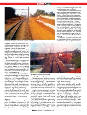 BERITAINDONESIA, 21 September 2006 43BERITA KHUSUSnumpang, mirip layanan busway. Soemino berharap dengan penerapan tiketelektronik ini, pembelian tiket dan penumpang lebih tertib dan nyaman.Dengan menggunakan layanan tiketelektronik diharapkan tidak ada lagi penumpang yang naik kereta tanpa membelitiket. Sistem ini akan menekan kebocoranpendapatan dari penjualan tiket manualyang selama ini diperkirakan mencapai30%.Sistem tiket elektronik, itu menggunakan peralatan canggih seperti KA di negara maju, seperti di Jepang. Dengan memanfaatkan media kartu elektronik ataulayar sentuh. Sistem ini sangat mengurangi intensitas pertemuan petugas KAatau kondektur dengan penumpang KA,merupakan solusi efektif mencegah kebocoran,” ungkap Soemino.Maka, jelas Soemino, kebijakan kita bagaimana meningkatkan peran KA sebagaiangkutan massal, kita mengejar tidakmenunggu. Peran kita harus meningkat,ada tiga strategis, yakni peningkatanpengembangan, aksestabilitas, pembangunan, aspek peningkatan keselamatandan pelayanan optimal, baik peningkatanutilitas dan peningkatan kapasitas lintas(pass block dan parsial double track).“Dalam jangka pendek, menengah danpanjang perhatian terhadap faktor keselamatan selalu diutamakan, ketepatanwaktu, kapasitas terangkut dan keterpaduan intra antar moda, sasaran KA menjadi semakin bagus,” tutur Soemino.BerpacuPerhatian pada aspek sarana KA yangmakin ditingkatkan kapasitasnya, di sisilain, parasana juga ikut bergerak maju,semisal pengembangan pembangunanjalur ganda yang tersebar di berbagaiwilayah di Jawa dan Sumatera.Dalam kesempatan berbeda, Setiawankuasa pengguna anggaran atau satuankerja pengembangan PerkeretaapianJabotabek (Tanah Abang-Serpong), sependapat dengan penilaian bahwa prasarana KA saat ini secara bertahap jauhlebih baik dibanding tahun-tahun sebelumnya.Pemerintah telah menempuh berbagaikebijakan serius guna membangun prasarana KA. Misalnya, prasarana sudah tuabanyak diganti baru dan berbagai pembangunan double track, diantaranyaTanah Abang-Serpong.Jika sebelumnya, bantalan rel dari kayudiganti bantalan beton, semula jenis rel(R-42 dan R-33) sekarang berubah menjadi R-54. Disadari, pembangunan danpengembangan prasarana KA butuhwaktu dan dana yang tidak sedikit.Namun, secara bertahap prasarana KAsemakin tampak jauh lebih baik.“Semua itu bukti konkret keseriusandan perhatian pemerintah terhadap pembangunan prasarana kereta api,” tukasmantan pimpro lintas timur yang memberi dukungan terhadap pembangunandan pengembangan prasarana KA komuter Surabaya-Sidoarjo yang diresmikanIbu Megawati saat menjabat Presiden.Menyinggung target waktu penyelesaian pembangunan double track TanahAbang-Serpong, ada kalangan yang ragubisa mencapai target yang ditetapkanpemerintah. “Saya optimis target yangdiberikan pemerintah dapat tercapai, inimerupakan kepercayaan dan amanahyang diberikan kepada saya, untuk melakukan pekerjaan sebaik-baiknya,” kataSetiawan.Secara fisik, ungkapnya, kondisi saatini, pembuatan jembatan, persiapan jalurdan bantalan beton sebagian sudah siap,sebagai kesiapan pemasangan rel KA. Disamping pembangunan stasiun Serpongyang representatif dan stasiun lain, antaraTanah Abang- Serpong.Bagaimanapun, lanjutnya, pembangunan prasarana KA yang sesuai standarstandar prasarana perkeretaapian internasional, khususnya pembangunan jalurganda Tanah Abang-Serpong, diharapkanturut mendukung kelancaran operasionalKA, di samping pelayanan kepada pengguna jasa KA makin baik,” ungkap dia.Dengan berbagai bukti, pemerintah memiliki obsesi dan kemauan politik yangkuat untuk mengembangkan pembangunan prasarana kereta api nasional. Dalammendukung percepatan pertumbuhan ekonomi dari jasa angkutan KA. Prasarana KAyang memadai, akan dapat memberikankontribusi yang optimal kepada lalulintasKA secara keseluruhan. RIPrasarana: Kesiapan pemasangan bantalan beton KA.Persiapan: Pembangunan jembatan. foto: berindo samsurifoto: berindo samsuri