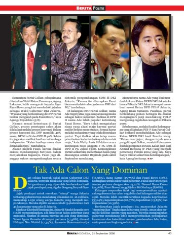 BERITAINDONESIA, 21 September 2006 45Tak Ada Calon Yang DominanSementara Partai Golkar, sebagaimanadituturkan Wakil Ketua Umumnya, AgungLaksono, lebih mengarah kepada figurFauzi Bowo yang kini menduduki jabatansebagai Wakil Gubernur DKI Jakarta.“Wacana yang berkembang di DPP PartaiGolkar mengarah pada Fauzi Bowo,” kataAgung (Republika 15/8).Namun sesuai ketentuan di PartaiGolkar, proses penetapan calon akandilakukan melalui proses konvensi. Dalamproses konvensi ini, DPP memiliki 40%suara, DPD I 20% dan DPD II 40%. Selainitu juga akan melihat hasil survei lembagaindependen. “Kalau hasilnya sama akanditindaklanjuti,” tambahnya.Alasan melirik Fauzi, karena dinilaisukses mendampingi Sutiyoso dalammenjalankan tugasnya. Fauzi juga dianggap sukses mengembangkan secarasistemik pengembangan SDM di DKIJakarta. “Karena itu diharapkan Fauzibisa menduduki calon gubernur DKI dariPG,” tambahnya.Di kalangan DPD Partai Golkar, namaAde Supriyatna juga sempat mengemukasebagai balon Gubernur. Bahkan di DPDII nama Ade lebih populer ketimbangFauzi Bowo. “Saya tidak mengatakansiapa yang akan maju karena partaisendiri belum menentukan. Semua harusmelalui mekanisme yang telah ditentukanpartai. Tapi Golkar akan tetap memprioritaskan kader terbaiknya dulu untukmaju,” kata Watty Amis SH dalam acarakunjungan reses anggota F-PG DPR diDPD II PG Jaksel (5/8). KemungkinanPartai Golkar bisa menentukan balon yangdiusungnya setelah Rapimda pada akhirSeptember mendatang.Mencuatnya nama Ade yang kini menduduki kursi Ketua DPRD DKI Jakarta kebursa Pilkada DKI Jakarta sempat membuat sewot Ketua DPD PDI-P Jakarta,Agung Iman Sumanto. Pasalnya, partaiberlambang pohon beringin itu dinilaimengingkari janji mendukung PDI-Pmengusung cagub dan cawagub di Pilkada2007.Sebelumnya, melalui koalisi kebangsaan yang dilakukan PDI-P dan Partai Golkar berhasil mendudukkan Ade sebagaiKetua DPRD DKI hasil Pemilu 2004.“Kalau mau jujur, dengan tujuh suarayang didapat Golkar, mustahil bisa menduduki pimpinan Dewan. Kalah jauh dariAhmad Heryana (F-PKS) yang menjadipemenang Pemilu 2004 yang lalu. Sayahanya minta Golkar bisa bersikap elegan,”kata Agung berharap. SPari sekian banyak bakal calon Gubernur DKIJakarta, ternyata tidak ada yang lebih dominan.Ini gambaran yang diperoleh berdasarkan hasiljajak pendapat yang digelar Soegeng Suryadi Syndicate.Jajak pendapat untuk merekam “mimpi” warga Jakartaterhadap gubernurnya mendatang dilakukan 12 -16 Juli lalu,mencakup 1.250 orang warga Jakarta yang menjadi respondennya. Mereka dipilih secara acak di 134 kelurahan dari43 kecamatan yang ada di Jakarta.Direktur Eksekutif lembaga ini, Sukardi Rinakit kepada pers(15/8) mengungkapkan, ada lima besar balon gubernur yangmenonjol. Namun di antara mereka tak ada yang dominan.Yakni Agum Gumelar di tempat pertama (17,56%), disusulHidayat Nur Wahid (17,39%), Sarwono Kusumaatmadja(16.98%), Rano Karno (15,75%) dan Fauzi Bowo (15%).Sedangkan untuk calon wakil gubernur, Faisal Basri menepatiurutan pertama dengan skor 24,40%. Disusul Rano Karno(21,76%), Fauzi Bowo (20,45%) dan Siti Nurbaya (8,66%).Kalangan responden tidak lagi mempersoalkan apakahcalon gubernur dan calon wagub itu dari kalangan militer atausipil. Mereka lebih menitikberatkan kepada kepribadian(33,14%), kepemimpinan (28,77%), kepedulian ( 13,85%) dankepandaian (10,39%).Berdasarkan jajak pendapat itu, masyarakat Jakarta“memimpikan” lingkungan kota yang bersih, aman dan memiliki fasilitas umum yang nyaman. Mereka menginginkangubernur mendatang lebih memprioritaskan peningkatankeamanan dan ketertiban umum, pembenahan lalu lintas,serta penataan lingkungan kota. SPDBERITA POLITIK