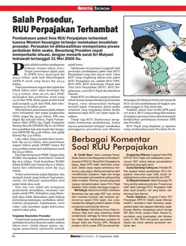 46 BERITAINDONESIA, 21 September 2006BERITA EKONOMISalah Prosedur,RUU Perpajakan TerhambatPembahasan paket lima RUU Perpajakan terhambatkarena Menteri Keuangan terlanjur melakukan kesalahanprosedur. Persoalan ini dikhawatirkan memperlama prosesperbaikan iklim usaha. Beruntung Presiden cepatmemperbaiki situasi, dengan menarik surat Sri MulyaniIndrawati tertanggal 31 Mei 2006 itu.ajak adalah sumber pendapatanterbesar selama tahun 2007.Target penerimaan pajak padaR-APBN 2007 mencapai Rp505,9 triliun, jauh naik dibandingkanAPBN-P 2006 yang hanya Rp 423,5triliun.Total penerimaan negara dari pajak danhibah tahun 2007 akan mencapai Rp713,4 triliun, atau 20,2% dari PDB,meningkat dari perkiraan 2006 yang14,1% dari PDB. Rasio pajak sendiri turutnaik menjadi 14,3% dari PDB, dari sebelumnya 13,7% tahun 2006.Bila diperinci, penerimaan pajak selama2007 bersumber dari pajak penghasilan(PPh) migas Rp 39,19 triliun, PPh nonmigas Rp 218,156 triliun, Pajak Pertambahan Nilai (PPN) dan Pajak PenjualanBarang Mewah (PPnBM) Rp 21,26 triliunbea pemilikan hak atas tanah dan bangunan (BPHTB) Rp 5,38 triliun, dan pajaklainnya Rp 3,15 triliun.Lalu cukai, hanya memberikan kontribusi Rp 42,03 triliun, dan penerimaannegara bukan pajak (PNBP) hanya Rp204,9 triliun, turun dari sebelumnya 2006Rp 224,5 triliun.Dari tiga komponen PNBP, bagian labaBUMN merupakan kontributor terkecilRp 16,2 triliun. Total kontribusi BUMNdalam RAPBN 2007 hanya Rp 21,7 triliun,turun dari sebelumnya 2006 Rp 23,3triliun.Walau penerimaan pajak digenjot, danmenjadi mesin uang terbesar bagi pemerintah, Sri Mulyani memastikan tarifpajak tidak akan naik.Dari sisi rate tidak ada keinginanpemerintah menaikkan, terutama ratepajak untuk PPN. Kebijakan yang ditempuh akan lebih ditekankan pada bidangperundang-undangan, perbaikan administrasi perpajakan, kepabeanan, sertacukai. Lalu menekan angka kebocoran,seperti cukai palsu.Terganjal Kesalahan ProsedurPemerintah memperkiraan akan terjadiperbaikan kondisi ekonomi makro selamatahun 2007. Inilah alasan utama, mengapa pemerintah optimistik meraihpajak besar.Optimisme ini nyatanya terganjal olehpersoalan pembahasan paket lima RUUPerpajakan yang kini macet total. LimaRUU yang tergabung dalam satu paketRUU Perpajakan itu, adalah RUU PPN,RUU PPh, RUU Ketentuan Umum danTata Cara Perpajakan (KUP), RUU Kepabeanan, serta RUU Pajak dan RetribusiDaerah.Paket RUU ini dikenal sangat probisnissebab berani mengorbankan penerimaanNegara, serta menawarkan berbagaiinsentif pajak. Umumnya dunia usahaterutama yang tergabung dalam KadinIndonesia ingin RUU ini cepat-cepat disahkan.Tetapi tiga RUU diantaranya mengalami kemacetan pembahasan, hanyakarena pemerintah terlanjur melakukanpelanggaran prosedural saat MenteriKeuangan Sri Mulyani Indrawati menarikRUU ini dari pembahasan di tingkat satupada tanggal 31 Mei 2006 lalu.Padahal, sesuai Tata Tertib DPR pasal127 ayat 2, RUU yang sedang dibicarakandi tingkat satu hanya bisa ditarik kembaliberdasarkan persetujuan bersama DPRdan Presiden.RUU Pajak yang diajukan 31 Agustus2005, berdasarkan surat Presiden No.RPBerbagai KomentarSoal RUU PerpajakanM. Chatib Basri, Ketua Lembaga Penyelidikan Ekonomi dan Masyarakat Universitas Indonesia (LPEM-UI): Revisi RUU Perpajakan itubagus, tetapi DPR malah meributkan prosedural. Setiap warga negara semestinya mendukung yang bagus. Mereka semestinya lebihmendahulukan substansi. Pajak dan tenagakerja merupakan permasalahan paling pentingdalam investasi. Buktinya, banyak pengusahaJepang mempertanyakan kapan RUU Pajakdisahkan. Calon investor menunggu-nunggu itu.MS Hidayat, Ketua Umum Kadin Indonesia:Sementara kita siap pada 2007 mau startingiklim investasi kondusif, tapi landasan peraturannya seperti RUU pajak, bea cukai,investasi dan sebagainya belum selesai. Ini bisamengancam pertumbuhan ekonomi.Chris Kanter, Wakil Ketua Umum Kadin Indonesia: Bagi kami yang terpenting adalahsubstansinya, sehingga itu harus diperjuangkan. Kadin akan membicarakan substansi itudengan fraksi dan Pansus DPR. Mengenaiprosedur, hal itu urusan DPR dan pemerintah.Dradjad Hari Wibowo, Anggota Fraksi PANDPR RI: RUU Pajak sulit diselesaikan pada 1Januari 2007 akibat adanya permasalahanprosedural yang agak serius.Susilo Bambang Yudhoyono, Presiden RI:Kita sepakat bahwa pembahasan RUU Perpajakan diteruskan agar tidak terjadi kesalahpahaman antara pemerintah dan DPR.Sri Mulyani Indrawati, Meteri Keuangan RI:Yang penting sekarang ada dua. Prosedurnyatidak salah sehingga RUU Perpajakan tidakakan cacat prosedur, dan yang kedua, substansinya bisa diterima.Panda Nababan, Anggota Fraksi PDIPerjuangan DPR RI: Dalam usulan Menkeuterakhir, reksadana tidak dikenakan pajak,padahal petani dan pegawai dikenakan pajak.Konsep Menkeu mengadopsi penuh konsepIMF, Bank Dunia, maupun Kadin. Karena itu,perubahan yang disampaikan oleh Menkeupada 31 Mei 2006 merupakan perubahandrastis dan bukan sekadar perubahan tambahan. ht
