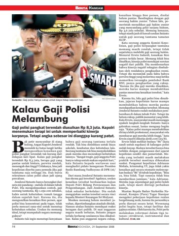 54 BERITAINDONESIA, 21 September 2006BERITA HANKAMKalau Gaji PolisiMelambungGaji polisi pangkat terendah diusulkan Rp 8,3 juta. Kapolrimenemukan terapi ini untuk memperbaiki kinerjakorpsnya. Tetapi angka sebesar ini dianggap kurang patut.ak petir menyambar di siangbolong. Angan Kapolri Jenderalmenukik ke batas langit ketikamengusulkan kenaikan gajipolisi pangkat terendah tak kurang daridelapan kali lipat. Kalau gaji pangkatterendah Rp 8,3 juta, berapa gaji yangpantas untuk bintara, perwira rendah,menengah dan tinggi? Celakanya, bisa jadikepolisian diserbu para pemuda jika gajitamtama saja setinggi itu. Dan bursarekrutmen calon polisi akan jadi ajangpercaloan.Jenderal Sutanto hanya berangkat darisatu sisi pandang—melulu di dalam tubuhPolri. Dia mengedepankan contoh, gajiseorang tamtama, Rp 1.232.100 sebulan,habis untuk kebutuhan rumah tanggadalam sepuluh hari. Karena itu, diamengusulkan kenaikan 800 persen, agarpolisi bisa konsentrasi pada tugas, tidakperlu mencari sana-sini untuk menutupkebutuhan sebulan. Usulan itu memangideal, tetapi mampukah negara memanggulnya?Sutanto tak ingin menutupi kenyataanbahwa gaji seorang tamtama terlalurendah. Tak bisa disisihkan untuk biayasekolah, kesehatan dan kebutuhan lain.Seorang tamtama tak bisa menyekolahkananak mereka dan mencukupi kebutuhanlainnya. “Sangat tragis, gaji anggota Polrihanya cukup untuk makan sepuluh hari,”kata Sutanto kepada wartawan usaimenghadiri pidato kenegaraan PresidenSusilo Bambang Yudhoyono di DPR (16/8).Dari mana Jenderal Sutanto menemukan skema gaji tersebut? Agaknya, usulankenaikan tersebut berdasarkan kajianDeputi Polri Bidang Perencanaan danPengembangan. Jadi Jenderal Sutantotidak sekadar berkelakar. Dia sudahmengajukan usulan tersebut secara rincikepada Menteri Keuangan Sri Mulyani.Menkeu memang belum memberi jawaban, dipertimbangkan ataukah ditolak.Namun usulan Sutanto mendapat reaksiberagam dari publik. Di saat anggarannegara masih terbatas, Sutanto janganterlalu berharap usulannya bisa dikabulkan. Kalau pun anggaran negara cukup,kenaikan hingga 800 persen, dinilaibelum pantas. Bandingkan dengan gajiseorang hakim yunior. Tahun lalu, pemerintah menaikkan gaji hakim yunioryang menyandang gelar sarjana hukum,Rp 4,6 juta sebulan. Memang lumayan,tetapi masih jauh di bawah usulan Sutantountuk gaji seorang tamtama tamatanSLTP.Kata seorang anggota Komisi Kepolisian, gaji polisi berpangkat tamtamamemang masih rendah, tetapi tidaksepatutnya melebihi gaji seorang hakim.Menurut Erwin Indardi, kenaikan 800persen terlalu besar. Memang tidak bisadinafikan, kinerja polisi mendapat sorotannegatif dari publik. Dia membenarkanbahwa kinerja negatif sebagian disebabkan oleh rendahnya penghasilan resmi.Tetapi dia menunjuk pada fakta bahwaperwira tinggi yang menerima suap ketikamemeriksa tersangka pembobol BankBNI, punya penghasilan yang cukup.“Karena itu jika gaji mereka dinaikkan,mereka harus mampu membuktikanpantas menerima kenaikan tersebut,” kataErwin.Karena itu, bila gaji polisi bisa dinaikkan, jajaran kepolisian harus mampumembuktikan bahwa mereka pantasmendapatkan kenaikan tersebut. MemangJenderal Sutanto sudah melakukan pembersihan di dalam tubuh Polri. Tetapi itubelum cukup, publik menuntut yang lebih.Kata Erwin, masyarakat masih menungguapakah langkah-langkah Sutanto hanyagebrakan sesaat, lantas menguap begitusaja. “Kalau polisi mampu membuktikandirinya lebih profesional, masyarakat relamembayar gaji mereka lebih tinggi,” kataErwin seperti dikutip detik.com (23/8).Erwin tidak melihat budaya “86” (katasandi untuk sogokan) di kalangan polisisudah lenyap. Budaya tersebut hanya bisaterkikis dengan pengawasan dari aparatkepolisian sendiri dan pemerintah. Mereka yang terbukti masih melakukanpraktik tersebut mestinya dikenakansanksi. Pengamat kepolisian AdrianusMeliala, kriminalog UI, juga tidak yakinkenaikan gaji secara otomatis melenyapkan budaya “86” di tubuh kepolisian. “Bisaya, bisa tidak. Tapi rasanya tidak bisamemberikan jaminan,” kata Adrianus.Mereka juga sependapat gaji polisi bolehnaik, tetapi mesti diiringi perbaikankinerja.Mantan Kepala Badan Narkotika Nasional, Komjen (Purn) Togar Sianiparmengakui pekerjaan kepolisian rentanbergelimang noda, karena itu personilnyaperlu diawasi secara ketat. Wewenangpolisi begitu luas, tetapi fasilitas dangajinya minim. Oleh karena itu, Polri perlumelakukan reformasi dalam tiga tatanan—struktural, instrumental dankultural. SB, SHSutanto: Gaji polisi hanya cukup untuk biaya hidup sepuluh hari.Bfoto: berindo wilson