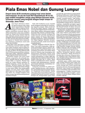 56 BERITAINDONESIA, 21 September 2006Piala Emas Nobel dan Gunung LumpurEmpat siswa SLTA membawa pulang tropi emas ilmiahinternasional. Ini ole-ole buat HUT Kemedekaan RI ke 61,juga sedikit menghibur warga yang ditimpa bencana alam,termasuk mereka yang bergulat dengan banjir lumpur diSidoardjo, Jawa Timur.nak Negeri Memburu Nobel;ini laporan khusus kado ulangtahun kemerdekaan MajalahGatra, Edisi 23 Agustus 2006.Majalah mingguan berita tersebut mengulas, munculnya secercah cahaya diantara kesuraman yang terus menderanegeri ini. Empat siswa sekolah lanjutanatas Indonesia meraih prestasi emas diolimpiade ilmiah internasional. Bisa jadiini oleh-ole buat ulang tahun kemerdekaan yang ke 61. Namun Gatra menyesalkan minimnya pembinaan anak-anakpintar dan berbakat.Pada tahun 2020 atau hanya 14 tahundari sekarang, menurut Gatra, lagi Indonesia bakal mendapat nobel di bidang fisika. Ada yang mencapai gelar professor pada umur 25 tahun, dan kini Dikmenti DKIdan TOFI berencana mendirikan ‘pelatnas’anak-anak cerdas. Tujuannya menjuaraiajang olimpiade ilmiah internasional.Muntahan lumpur dari perut bumiSidoarjo yang belum ada pertanda berhenti, menjadi laporan sampul MajalahTempo Edisi, 27 Agustus. Hampir tigabulan ini, banjir lumpur melumat sejumlah kampung, sawah dan jalan diSidoarjo. Kiriman lumpur dari dalamperut bumi, menggunung sampai setinggi4,3 juta meter kubik, bisa membengkaksampai 10,8 juta meter kubik sampaiakhir tahun ini. Jika hujan turun dalamdua bulan ini, tanggul-tanggul yangtakkan mampu lagi membendung tekananmuntahan lumpur.Pada edisi berikutnya (3/9), majalahberita mingguan terkemuka ini, menurunkan laporan sampul: Sikat Jenderal!Merah Biru Rapor Kapolri. Tempo menyorot gerak langkah Kapolri Jenderal Sutanto dalam setahun memegang tongkatkomando Polri. Sutanto, menurut Tempo,belum bisa tidur nyenyak, meskipun diasudah banyak menoreh keberhasilandalam setahun ini. Begitu diberangus,kejahatan-kejahatan, seperti pembalakanliar (illgal logging), Narkoba, korupsi,terorisme dan judi, seolah terus berpacumenghadangnya.Majalah mingguan ekonomi dan hukum, Trust edisi 3 September, lebih tertarik menurunkan laporan sampul: Melacak Korupsi Proyek Bank Dunia. Trustmengutip pernyataan perwakilan BankDunia di Jakarta yang menyingkap ulahDepartemen Pekerjaan Umum yangmengkorupsi dana bantuan bantuannyasampai sejumlah Rp 3,2 miliar. BPK jugamelaporkan dana bantuan Bank Dunia diDepkes dikorupsi Rp 5,1 miliar. BankDunia mengultimatum untuk memintakembali uang dipinjamkannya. Merekapemerintah Indonesia meniadakan kebiasaan buruk tersebut.Langsung menohok ke pokok persoalan, Majalah Konstan, edisi 6 September, menurunkan laporan sampul: Koruptor Penghianat Kemerdekaan. Dalamedisi ulang tahun kemerdekaan RI ke-61,majalah yang banyak menyorot masalahkorupsi ini; menguraikan upaya limapresiden RI, dari Soekarno sampai SusiloBambang Yudhoyono, untuk memberantas kasus-kasus korupsi yang sudahmenjadi “penyakit kanker” bagi kehidupan masyarakat. Ironisnya, penyakitkronis ini, menurut Konstan, belum bisadisembuhkan sampai saat ini. Indonesia,malahan, menduduki peringkat negarapaling korup di dunia. Konstan dan Trusttak banyak berbeda di dalam menyorotbudaya korupsi yang melanda negeri ini.Di pihak lain, majalah bisnis—Swa edisi6 September—memberi perhatian utamapada; Raja Toiletris yang Makin Terkepung. Swa memberi ruang yang dominanpada kupasan yang membedah kekuatan,kelemahan dan masa depan Unilever. Manuver Unilever Indonesia yang biasanyasangat lincah, inovatif dan kreatif, menurut Swa, belakangan ini tampak melamban. Sang pemimpin pasar ini seolah-olahtak lagi bergairah berkreasi dan memancing konsumen dengan taburan hadiah,bahkan beberapa kali tertangkap basahmeniru gerakan penantang pasarnya.Juga majalah bisnis, Investor edisi 7Agustus, mengemas laporan sampulcukup bombastis; Mafia Berkeley &Strategi Baru Ekonomi. Menurut Investor, lemahnya daya saing industri Indonesia diyakini tak lepas dari peran arsitekekonomi Mafia Berkeley.Perlukah upaya radikal untuk mengubah strategi ekonomi pasar bebas itu?Tulis Investor, tampaknya Indonesiabutuh strategi baru untuk mendorongkemajuan ekonomi. Resep pembangunanekonomi yang selama ini digunakanhanya menambah angka kemiskinan danpengangguran. Tingkat kesejahteraanrakyat tak kunjung terangkat, justrumerosot, terutama dalam delapan tahunterakhir. SB-SHALINTAS MEDIA