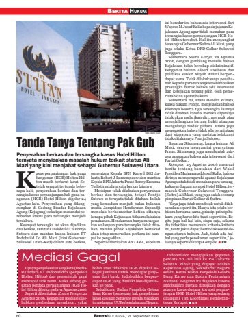 60 BERITAINDONESIA, 21 September 2006Tanda Tanya Tentang Pak GubPenyerahan berkas dan tersangka kasus Hotel Hiltonternyata menyisakan masalah hukum terkait status AliMazi yang kini menjabat sebagai Gubernur Sulawesi Utara.Mediasi Gagalini beredar isu bahwa ada intervensi dariWapres M Jusuf Kalla kepada jajaran Kejaksaan Agung agar tidak menahan paratersangka kasus perpanjangan HGB Hotel Hilton tersebut. Hal itu menyangkuttersangka Gubernur Sultra Ali Mazi, yangjuga selaku Ketua DPD Golkar SulawesiTenggara.Sementara Suara Karya, 28 Agustus2006, dengan gamblang menulis bahwaKejaksaan telah bersikap diskriminatif.Pengamat hukum Albert Hasibuan danpolitikus senior Aisyah Amini berpendapat sama. Tidak dilakukannya penahanan kepada para tersangka menimbulkanprasangka buruk bahwa ada intervensidan kebijakan tebang pilih oleh pemerintah dan aparat hukum.Sementara itu, Frans Hendra Winata,kuasa hukum Pontjo, menjelaskan bahwakliennya beserta tiga tersangka lainnyatidak ditahan karena mereka dipercayatidak akan melarikan diri, merusak ataumenghilangkan barang bukti ataupunmengulangi tindak pidana. Frans jugamenegaskan bahwa tidak ada permintaandari siapapun yang melatarbelakangitidak ditahannya Pontjo Sutowo.Bonaran Situmeang, kuasa hukum AliMazi, seraya mengamini pernyataanFrans. Situmeang juga membantah adanya anggapan bahwa ada intervensi dariPartai Golkar.Kompas, 25 Agustus 2006 memuatberita tentang bantahan dari WakilPresiden Muhammad Jusuf Kalla, bahwadirinya mempengaruhi aparat KejaksaanAgung untuk tidak menahan para tersangka kasus dugaan korupsi Hotel Hilton, termasuk Gubernur Sulawesi Tenggara (Sultra) Ali Mazi, yang juga salah seorangpimpinan Partai Golkar di Sultra.“Saya juga tidak mendesak untuk dilaksanakan seperti itu. Hanya kita selalu berbicara bersama-sama, prinsip-prinsip hukum yang harus kita taati seperti itu. Begitu juga hal-hal lain, siapa saja, selamadia tidak bisa memenuhi kriteria-kriteriaitu, tentu jaksa dapat bertindak sesuai dengan aturan hukum. Jadi, tidak ada halhal yang perlu penekanan seperti itu,” jelasnya seperti dikutip Kompas. RHasus perpanjangan hak gunabangunan (HGB) Holten Hilton masih berlarut-larut. Setelah sempat tertunda beberapa kali, penyerahan berkas dan tersangka kasus perpanjangan hak guna bangunan (HGB) Hotel Hilton digelar 24Agustus lalu. Penyerahan yang dilangsungkan di Gedung Bundar KejaksaanAgung (Kejagung) sekaligus menandai perubahan status para tersangka menjaditerdakwa.Keempat tersangka ini akan dijadikandua berkas, Dirut PT Indobuild Co PontjoSutowo dan mantan kuasa hukum PTIndobuild Co Ali Mazi (kini GubernurSulawesi Utara-Red) dalam satu berkas,sementara Kepala BPN Kanwil DKI Jakarta Robert J Lumempauw dan mantanKepala BPN Jakarta Pusat Ronny KusumaYudistira dalam satu berkas lainnya.Meskipun telah dilakukan penyerahanberkas dan tersangka, tetapi PontjoSutowo cs ternyata tidak ditahan. Inilahyang kemudian menjadi bulan-bulananmedia. Jampidsus Hendarman Supandjimenolak berkomentar ketika ditanyakenapa pihak Kejaksaan tidak melakukanpenahanan. Hendarman hanya menegaskan walaupun para tersangka tidak ditahan, namun pihak Kejaksaan bertekadakan tetap meneruskan perkara ini sampai ke pengadilan.Seperti diberitakan ANTARA, sebelumUpaya penyelesaian sengketa (mediasi) antara PT Indobuildco (pengelolaHolten Hilton) dan pemerintah gagalmencapai titik temu. Maka sidang gugatan perdata perpanjangan HGB Hotel Hilton dibuka pada 31 Agustus 2006.Seperti diberitakan Koran Tempo, 24Agustus 2006, kegagalan mediasi disebabkan perbedaan mendasar, yakniboleh atau tidaknya HGB dipakai sebagai jaminan untuk mendapat pinjaman dari bank. Indobuildco berpendapat HGB yang dimiliki bisa dijaminkan ke bank.Sebaliknya, Badan Pengelola GeloraBung Karno (pemegang hak pengelolaanlahan kawasan Senayan) menilai tindakanitu melanggar UU Perbendaharaan Negara.Indobuildco mengajukan gugatanperdata 20 Juli lalu ke PN JakartaSelatan. Pihak yang digugat adalahKejaksaan Agung, Sekretariat Negaraselaku Ketua Badan Pengelola GeloraBung Karno dan Badan PertanahanNasional. Gugatan itu diajukan karenaIndobuildco merasa dirugikan denganadanya kasus dugaan korupsi perpanjangan HGB Hotel Hilton yang sedangditangani Tim Koordinasi Pemberantasan Korupsi. RHKfoto: repro trustBERITA HUKUM