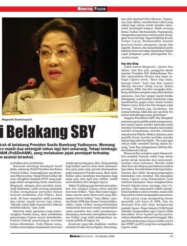 BERITAINDONESIA, 19 Oktober 2006 41BERITA POLITIKi Belakang SBYkah di belakang Presiden Susilo Bambang Yudhoyono. Memangen masih dua setengah tahun lagi dari sekarang. Tetapi lembagaHAM (PuSDeHAM), yang melakukan jajak pendapat terhadapan asumsi tersebut.perbaikan dan perubahan.Maswadi menduga kelompok JusufKalla, sekarang Wakil Presiden dan KetuaUmum Golkar, kemungkinan mendominasi Pilpres 2009. Tetapi Partai Golkar takmau mengikuti langkah PDIP yang pagipagi sekali mengusung ketua umumnya,Megawati, sebagai calon presiden 2009.Andi Mattalata, salah seorang pimpinanGolkar mengatakan partainya belumtertarik membahas soal Pilpres. KataAndi, JK baru menjabat wakil presidendua tahun, masih tersisa tiga tahun.“Biarlah Jusuf Kalla konsentrasi bekerjaterlebih dahulu,” kata Andi.Menurut Andi, partainya yang memenangkan Pemilu 2004, akan melakukanpenyaringan Capres secara demokratis.Namun bentuk penyaringan tersebutbelum ditentukan. Pada Pilpres 2004,Golkar menerapkan mekanisme konvensiuntuk menyaring para calon. Yang pentingbagi Golkar saat ini, kata Andi, menunaikan janji-janji yang pernah disampaikanpada kampanye Pemilu 2004. Kata Andi,Golkar akan membuka kesempatan bagisiapa saja, dari sipil atau militer, untukmencalonkan diri sebagai Capres.Akbar Tandjung juga berniat mencalonkan diri sebagai Capres 2009 melaluikonvensi Golkar. “Saya lihat nanti bagaimana aturan main (konvensi) yang ditetapkan Partai Golkar,” kata Akbar, mantan Ketua DPR dan Ketua Umum Golkar.Akbar ingin Golkar mempertahankanmekanisme konvensi untuk menentukancalon presiden dan wakil presidennya.Alasannya, konvensi merupakan terobosan Golkar yang telah memperkaya wawasan politik di negara ini.Konvensi yang lalu diadakan setahunsebelum Pemilu 2004 digelar, dimenangkan oleh Jenderal (Pur) Wiranto. Tujuannya, kata Akbar, memberikan waktu yangcukup bagi rakyat untuk menilai caloncalon pemimpin bangsa. Salah seorangKetua Golkar Burhanuddin Napitupulu,mengatakan partainya belum pasti menggelar konvensi lagi. Seperti dikutip KoranTempo (19/9), Burhanuddin menilaikonvensi hanya menguras energi danlogistik. Namun, dia menambahkan perlutidaknya konvensi akan diputuskan dalamrapat pimpinan pada pertengahan November nanti.Gus Dur SiapTidak hanya Megawati, Amien danAkbar. Gus Dur pun, panggilan akrabmantan Presiden KH Abdurahman Wahid, menyatakan dirinya siap maju sebagai Capres 2009. “Saya siap maju,kenapa tidak,” kata Gus Dur sepertidikutip Investor Daily (22/9). Selainpartainya, PKB, Gus Dur mengaku didukung oleh lima sesepuh yang tidak disebutnamanya. Gus Dur sangat marah ketikadisinggung soal kendala kesehatan yangmembuatnya gagal maju dalam kontesPilpres 2004. Kata Gus Dur dengan nadaberang: “Kendala apa, kesehatan. Itusemua bohong, tidak ada apa-apa kok. Itusemua kebohongan para pemimpin.”Anggota Presidium KIPP Ray Rangkutimeminta partai politik untuk mengumumkan nama Capres mereka sekarang untukmemberi kesempatan kepada masyarakatmenilai kemampuan mereka sebelummasuk arena Pilpres. Rakyat, katanya, parapemilih harus menilai perilaku merekaselama tiga tahun ke depan. “Itu wajar agarrakyat tidak membeli kucing dalam karung,” kata Ray sebagaimana dikutip Media Indonesia (18/9).Menurut Ray semakin cepat dimunculkan semakin banyak waktu bagi mesinpartai untuk memoles dan menyosialisasikan calon-calonnya. Mereka tidakakan bisa merekayasa perilakunya dalamtiga tahun, kecuali dalam beberapa bulan.Namun Ray tidak mengenyampingkankelemahan cara tersebut. Dia mengakuinama Capres yang diumumkan jauhsebelum kampanye akan mengharuskanParpol bekerja keras menjaga citra Capresnya. Jika masyarakat sudah mengetahui kejelekan calon tersebut, maka sulitbagi partai untuk mengangkat pamornya.Soal partai yang mengusung harusmemiliki 15% kursi di DPR, bila itudisetujui bisa jadi akan mengurangijumlah Capres. Pakar hukum UGM FajrulFalaakh mengusulkan agar Capres tidakdiusulkan lewat koalisi partai-partai,artinya diusulkan oleh partai tunggal. Jikausul Fajrul disetujui, hanya Golkar (23%)dan PDIP (19,8%) yang bisa mengajukanCapres. SHfoto: dokMegawati Soekarnoputri.