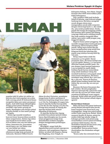 BERITAINDONESIA, 2 November 2006 33Mutiara Pemikiran Syaykh Al-Zaytunpopulasi aktif di sektor ini sekitar 50juta jiwa dari total populasi 201,9 juta.Jadi, seorang petani di Indonesia hanyamengelola lahan 500 meter persegi perkapita. Jauh lebih buruk dibandingkandengan potret petani Thailand yangmemiliki 1.850 meter persegi perkapita. Bandingkan pula dengan petaniAmerika Serikat 10.000 meter persegiper kapita.Belum lagi masalah terjadinyakonversi besar-besaran lahan sawah kelahan nonpertanian. Selama tiga tahunsaja terjadi konversi lahan sawah676.00 hektar atau 225.000 hektar pertahun. Sementara itu, pencetakansawah hanya 441.700 hektar atau147.000 hektar per tahun.Ditambah lagi masalah kurangefisiennya tenaga kerja pertanian diIndonesia. Menurut Clifford Geertzdalam Involusi Pertanian, pemakaiantenaga kerja di sektor pertanian diIndonesia tergolong sangat besar yakni0,127 Kw/ha. Sedangkan di negara lain,seperti Amerika Serikat kurang lebih0,002 Kw/ha dan Jepang 0,014 Kw/ha.Tenaga kerja manusia di Jepang danAmerika Serikat lebih intensifdibanding di Indonesia.Di Amerika Serikat dan Jepangproduktivitas pekerja (petani) bukanhanya diperhitungkan per ha sawah,tetapi penggunaan tenaga kerjadimanfaatkan seefisien mungkindengan menggunakan perhitunganyang tepat.Barangkali, sangat baik jikadigambarkan potret petani superguremIndonesia, dari pengalaman Suparno.Sekitar 25 tahun lalu Suparno datangdari Magelang, Jawa Tengah, keKabupaten Subang, Jawa Barat, denganharapan akan lebih mencerahkan jalanhidup keluarganya.Tapi, nasibnya tidak jauh berbeda.Sebab di Subang, yang terkenal sebagailumbung beras, dia hanya mengolahsawah dengan sistem maro(mengerjakan sawah milik orang laindengan sistem bagi hasil 2:1, dua untukdia, satu untuk pemilik lahan). Benih,pupuk dan tenaga dia tanggung sendiri.Dia bersama isteri (puteri asli Subangyang juga tidak punya sebidang tanah)dan anak-anaknya mengolah lahansekitar 7500 meter milik juragan yangtinggal di Jakarta.Suparno hanya petani penggarap. Diamemilih menggunakan benih padi jeniscihanjuang, karena harganya lebihmurah. Setiap masa tanam tiba diaharus mengeluarkan uang untuk limakilogram benih dan beberapa kilopupuk yang totalnya kurang lebih Rp700.000.Setiap empat bulan sekali diamemanen 3,5 ton gabah. Sesuaiperjanjian maro, dia hanya berhak atas2,33 ton gabah. Sisanya, 1,17 ton harusdiberikan kepada pemilik tanah. Diapun dengan cepat menjual bagiannya2,33 ton gabah itu masih dalamkeadaan basah karena memerlukanuang untuk membayar utang danmembeli benih baru serta pupuk untukmasa tanam selanjutnya. Dia hanyamendapat uang sebesar Rp 2.300.000-Rp 2.500.000. Karena di desanya,gabah dalam keadaan basah bisa lakusekitar Rp 100.000-Rp 120.000 perkuintal.Biasanya dia hanya bisa panen duakali setahun. Berarti penghasilanSuparno mencapai Rp 5 juta kotor ataurata-rata Rp 415.000 per bulan untukmembiayai kehidupan enam anggotakeluarga. Itulah salah satu potret petaniIndonesia. Potret petani sebuah negaraagraris!Bertani Bukan KehinaanMaka tak heran bila petani Indonesiasering disebut kelompok kelas bawah,kaum marjinal atau kaum kecil yangterpinggirkan. Image atas potret petanimiskin itulah yang harus diubah. Sebabmenurut Syaykh Al-Zaytun, petani itumiskin tidak lagi sekedar image dikalangan pemuda anak petani yangmenyebabkan concern petani di bidangpertanian tidak konstan. Dan itudisebabkan banyak hal dan unsur yangmenganggap petani itu tidakmenjanjikan. Karena petani hanyadianalogikan dan disamakan sebagaiburuh tani.“Secara sadar dan sistematis harusA LEMAH
