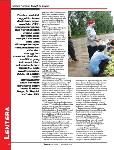 36 BERITAINDONESIA, 2 November 2006 L ENTERAMutiara Pemikiran Syaykh Al-ZaytunPemburuan bibitunggul itu terusdilakukan, sejakawal Mei 2005dengan menyilangdua varietas bibitunggul yangberbeda asal,menjadi varietasbaru yangdiharapkan dapatmenyempurnakansifat darikeunggulantersebut. Hasil daripenelitian yangtak kenal lelahselama berbulanbulan itu, padaawal Desember2005, Al-Zaytuntelahmelaunchingcalon varietasbaru yang diberinama: SumberKaya, Sri Rejeki,KKO dan KKI.36menuggu seluruh bangsa siap.Kalau mau memanen pisangjangan nunggu semua matangdi pohon. Jadi satu pisang adayang matang itu sudah siapdipanen namanya. Jadi kitaharus siap karena pastidatang.”Dia berpesan kita tidak perlutakut dengan dibukanyaliberalisasi produk pertanian,malah tambah bagus karenakita bisa punya partner yangbanyak dari mana-mana. “Kitabisa alih teknologi, kalau maukita transfer pengalaman kitaatau kita ambil daripengalaman mereka, jadinggak usah khawatir.”Al-Zaytun sendiri, sebagaibukti cinta terhadap pertanianIndonesia, telah membentukKelompok Tani Terpadu yangterdiri dari para tenaga ahlidan diketuai langsung olehSyaykh Al-Zaytun AS PanjiGumilang. Kelompok TaniTerpadu itu selalu berusahamencari terobosan baru dibidang pertanian khususnyapadi. Mereka selalumengadakan penelitian,terlebih berhubungan denganbibit unggul.Pemburuan bibit unggul ituterus dilakukan, sejak awal Mei 2005dengan menyilang dua varietas bibitunggul yang berbeda asal, menjadivarietas baru yang diharapkan dapatmenyempurnakan sifat dari keunggulantersebut. Hasil dari penelitian yang takkenal lelah selama berbulan-bulan itu,pada awal Desember 2005, Al-Zaytuntelah melaunching calon varietas baruyang diberi nama: Sumber Kaya, SriRejeki, KKO dan KKI.Padi Sumber Kaya adalah keturunanpertama (F1) dari hasil persilangan duavarietas yang berasal dari Indonesiadan Malaysia. PTB (Fatmawati) asalIndonesia disilang dengan MRQ 74 asalMalaysia menghasilkan Sumber Kaya.Dan kebalikannya MRQ 74 disilangdengan PTB (Fatmawati),menghasilkan Sri Rejeki. Kemudianvarietas lokal Indramayu biasa disebutKebo disilang dengan Konawi asalSulawesi Tenggara menghasilkan KKI,dan kebalikannya Konawi disilangdengan Kebo menghasilkan KKO.Karena masing-masing baru F1tentunya belum dapat dikatakansebagai unggul, tindaklanjutnya adalahpeningkatan kepada F2, F3, danselanjutnya sampai menjadi bibit galur.Namun dari tanda-tanda awal sangatdimungkinkan tujuan keunggulan akandapat dicapai dengan beberapa alasan.Pertama, berbagai penyakit yangbiasanya menyerang berbagai varietastersebut, seperti kresek, tungro, werengdan sundep tidak muncul selama dalamproses pertumbuhannya. Kedua,anakan produktif, jumlahnya relatifbanyak, lebih dari 20 malai (melebihiinduknya). Ketiga, keseragaman masaberbuah. Keempat, malai relatiflandung berbulir di atas 150. kelima,umur hampir bersamaan dengan indukasal antara 100-115 hari.“Pengembangan lebih lanjut terusdiusahakan sampai menjadi bibit galurdan tentunya bila semua tercapaidengan sukses akan menambahkhazanah perbibitan panganIndonesia,” harap Syaykh optimis.Dengan penelitian yang tak pernahlelah dan tak henti-henti, Syaykhoptimis, akan menghasilkan produkpertanian yang gemilang.Apalagi dengan berdirinyaUniversitas Al-Zaytun Indonesia,menurut Syaykh, akan merupakanjawaban untuk memadukan sistimpertanian yang modern dan tradisional.“Nanti Universitas Al-Zaytun kitaharapkan mencampurkan usaha
