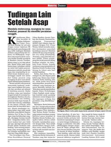 40 BERITAINDONESIA, 2 November 2006BERITA DAERAHTudingan LainSetelah AsapMandala melenceng, nyungsep ke rawa.Padahal, pesawat itu memiliki peralatancanggih.eperkasaan Mandala berakhir diTarakan, Kalimantan Timur. Pesawat jenis Boeing 737 seri 200dengan nomor registrasi PKRIE dan kode penerbangan RI394 milik maskapai MandalaAirlines yang terbang dari Jakarta via Balikpapan, tergelincir dan terperosok ke rawarawa ketika hendak mendaratdi Bandara Juwata Tarakan,Selasa siang (3/10) dua pekanlalu. Mesin turbo pada sayapkanan lepas, terlempar sekitar40 meter dari badan pesawat.Sementara roda kiri, pecah lalulepas dan terpelanting ke sebelah kanan landasan pacu -tertinggal sejauh 200 meterdari badan pesawat yangnyungsep di rawa-rawa hutannipah sebelah kanan landasan.Sesaat setelah roda pesawatmenyentuh landasan, terdengar suara ledakan dari pesawat dan percikan api munculdi lambung pesawat. RadarTarakan yang saat kejadiantengah berada di terminal keberangkatan Bandara Juwata,menyaksikan saat landing,pesawat tidak tepat berada dicenter line runway, melainkandi sisi kanan runway, tuliskoran lokal itu keesokan harinya. Alasan pandangan tertutup kabut asap tebal untukMandala yang dipiloti KaptenSulistiyo Dwi H dan Co PilotAgus yang berteknologi canggih, dianggap kurang masukakal. “Jangankan kabut, mendarat malam hari pun tidakapa-apa. Apa lagi roda pesawatberada dalam landasan saatlanding,” kata seorang penumpang yang menganggap dirinya selamat merupakan mujizat dari Yang Maha Kuasa.Tim Investigasi dan Penelitian Kecelakaan PesawatUdara Bandara Juwata Tarakan dari Komite Nasional Keselamatan Transportasi(KNKT) dari Jakarta yang dipimpin Brigjen Pol. FransWenas, belum bersedia memberi kesimpulan penyebabkecelakaan pesawat MandalaAirlines RI 394 yang mengangkut 104 orang penumpang.“Pertama, yang patut kita syukuri adalah, semua penumpang dan awak pesawat dalamkeadaan selamat, itu dulu,”kata Frans Wenas, kepadawartawan yang menantinya diBandara Juwata Tarakan yangdatang ke lokasi satu harisetelah kejadian.Kedua, kata Ketua Tim Investigasi ini, ada dugaan padakabut asap. Hanya saja, lanjutJenderal Polisi bintang satuini, tidak boleh buru-burumenyimpulkan penyebab kecelakaan yang menimpa pesawat Mandala Airlines itu.“Kita akan merekomendasikankepada Dirjen PerhubunganUdara Dephub untuk mengkaji kembali jarak pandangminimum sesuai dengan kondisi lapangan terbang danperalatan yang dimilikinya,”katanya.Sayangnya, Berita Indonesiatak bisa mengkonfirmasikankejadian ini kepada Pilot Mandala, Kapten Pilot Sulistiyo.Tapi Harian Radar Tarakanyang sempat merekam ucapanSulistiyo pasca kejadian diBandara Juwata Tarakan, mengakui bahwa dirinya sudahberusaha mendaratkan pesawat dengan baik. “Saya sudahmendaratkan dengan baik.Saya sama sekali tidak merasakan ada masalah saat landing,” katanya.Dari pantauan Asmuddin,Wartawan Berita Indonesia diTarakan yang ikut terjun kelokasi kejadian, di atas landasan jelas terlihat bekas rodapesawat ketika pertama kalimendarat sepanjang 8 sampai10 meter dengan kedalaman 3hingga 5 centimeter. Dan jikadihubungkan dengan pengakuan M Taksis, petugas Bandara Juwata Tarakan yang saatitu berada di lokasi kejadian.“Saat landing, salah satu banpesawat pecah. Karena itulahpesawat akhirnya tergelincirdan masuk ke hutan nipah disekitar bandara. Ini, bukankarena licin tapi, karena bannya pecah,” katanya yakin.Selama ini, lapangan terbang Juwata Tarakan dikatakan sudah berpredikat “Bandara Internasional” New Singapore. Tapi, jika ditilik darifasilitas yang dimiliki, sangatjauh dari standar bandarainternasional. InstrumentLanding System (ILS) salahKTerlepas. Mesin turbo pada sayap kanan pesawat terlepas sejauh 40 met