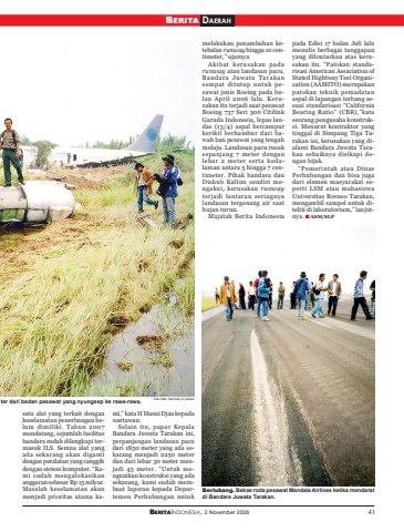 BERITAINDONESIA, 2 November 2006 41BERITA DAERAHsatu alat yang terkait dengankeselamatan penerbangan belum dimiliki. Tahun 2007mendatang, sejumlah fasilitasbandara sudah dilengkapi termasuk ILS. Semua alat yangada sekarang akan digantidengan peralatan yang canggihdengan sistem komputer. “Kami sudah mengalokasikananggaran sebesar Rp 15 milyar.Masalah keselamatan akanmenjadi prioritas utama kami,” kata H Husni Djau kepadawartawan.Selain itu, papar KepalaBandara Juwata Tarakan ini,perpanjangan landasan pacudari 1850 meter yang ada sekarang menjadi 2250 meterdan dari lebar 30 meter menjadi 45 meter. “Untuk menguatkan konstruksi yang adasekarang, kami sudah membuat laporan kepada Departemen Perhubungan untukmelakukan penambahan ketebalan runway hingga 10 centimeter,” ujarnyaAkibat kerusakan padarunway atau landasan pacu,Bandara Juwata Tarakansempat ditutup untuk pesawat jenis Boeing pada bulan April 2006 lalu. Kerusakan itu terjadi saat pesawatBoeing 737 Seri 300 CitilinkGaruda Indonesia, lepas landas (13/4) aspal bercampurkerikil berhambur dari bawah ban pesawat yang tengahmelaju. Landasan pacu rusaksepanjang 7 meter denganlebar 2 meter serta kedalaman antara 5 hingga 7 centimeter. Pihak bandara danDishub Kaltim sendiri mengakui, kerusakan runwayterjadi lantaran seringnyalandasan tergenang air saathujan turun.Majalah Berita Indonesiapada Edisi 17 bulan Juli lalumenulis berbagai tanggapanyang dilontarkan atas kerusakan itu. “Patokan standarisasi American Assaciation ofStated Hightway Test Organization (AASHTO) merupakanpatokan teknik pemadatanaspal di lapangan terbang sesuai standarisasi “CaliforniaBearing Ratio” (CBR),”kataseorang pengusaha konstruksi. Menurut kontraktor yangtinggal di Simpang Tiga Tarakan ini, kerusakan yang dialami Bandara Juwata Tarakan sebaiknya disikapi dengan bijak.“Pemerintah atau DinasPerhubungan dan bisa jugadari elemen masyarakat seperti LSM atau mahasiswaUniversitas Borneo Tarakan,mengambil sampel untuk diteliti di laboratorium,” lanjutnya. ASM/SLPeter dari badan pesawat yang nyungsep ke rawa-rawa.Berlubang. Bekas roda pesawat Mandala Airlines ketika mendaratdi Bandara Juwata Tarakan.foto-foto: berindo sl pohan