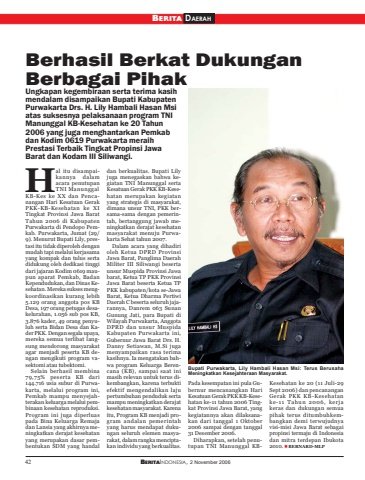 42 BERITAINDONESIA, 2 November 2006BERITA DAERAHBerhasil Berkat DukunganBerbagai PihakUngkapan kegembiraan serta terima kasihmendalam disampaikan Bupati KabupatenPurwakarta Drs. H. Lily Hambali Hasan Msiatas suksesnya pelaksanaan program TNIManunggal KB-Kesehatan ke 20 Tahun2006 yang juga menghantarkan Pemkabdan Kodim 0619 Purwakarta meraihPrestasi Terbaik Tingkat Propinsi JawaBarat dan Kodam III Siliwangi.al itu disampaikannya dalamacara penutupanTNI ManunggalKB-Kes ke XX dan Pencanangan Hari Kesatuan GerakPKK-KB-Kesehatan ke XITingkat Provinsi Jawa BaratTahun 2006 di KabupatenPurwakarta di Pendopo Pemkab. Purwakarta, Jumat (29/9). Menurut Bupati Lily, prestasi itu tidak diperoleh denganmudah tapi melalui kerjasamayang kompak dan tulus sertadidukung oleh dedikasi tinggidari jajaran Kodim 0619 maupun aparat Pemkab, BadanKependudukan, dan Dinas Kesehatan. Mereka sukses mengkoordinasikan kurang lebih5.129 orang anggota pos KBDesa, 197 orang petugas desakelurahan, 1.056 sub pos KB,3.876 kader, 49 orang penyuluh serta Bidan Desa dan Kader PKK. Dengan segala upaya,mereka semua terlibat langsung mendorong masyarakatagar menjadi peserta KB dengan mengikuti program vasektomi atau tubektomi.Selain berhasil membina79,75% peserta KB dari144.716 usia subur di Purwakarta, melalui program ini,Pemkab mampu menyejahterakan keluarga melalui pembinaan kesehatan reproduksi.Program ini juga diperluaspada Bina Keluarga Remajadan Lansia yang akhirnya meningkatkan derajat kesehatanyang merupakan dasar pembentukan SDM yang handaldan berkualitas. Bupati Lilyjuga menegaskan bahwa kegiatan TNI Manunggal sertaKesatuan Gerak PKK KB-Kesehatan merupakan kegiatanyang strategis di masyarakat,dimana unsur TNI, PKK bersama-sama dengan pemerintah, bertanggung jawab meningkatkan derajat kesehatanmasyarakat menuju Purwakarta Sehat tahun 2007.Dalam acara yang dihadirioleh Ketua DPRD ProvinsiJawa Barat, Panglima DaerahMiliter III Siliwangi besertaunsur Muspida Provinsi Jawabarat, Ketua TP PKK ProvinsiJawa Barat beserta Ketua TPPKK kabupaten/kota se-JawaBarat, Ketua Dharma PertiwiDaerah C beserta seluruh jajarannya, Danrem 063 SunanGunung Jati, para Bupati diWilayah Purwakarta, AnggotaDPRD dan unsur MuspidaKabupaten Purwakarta ini,Gubernur Jawa Barat Drs. H.Danny Setiawan, M.Si jugamenyampaikan rasa terimakasihnya. Ia mengatakan bahwa program Keluarga Berencana (KB), sampai saat inimasih relevan untuk terus dikembangkan, karena terbuktiefektif mengendalikan lajupertumbuhan penduduk sertamampu meningkatkan derajatkesehatan masyarakat. Karenaitu, Program KB menjadi program andalan pemerintahyang harus mendapat dukungan seluruh elemen masyarakat, dalam rangka menciptakan individu yang berkualitas.Pada kesempatan ini pula Gubernur mencanangkan HariKesatuan Gerak PKK KB-Kesehatan ke-11 tahun 2006 Tingkat Provinsi Jawa Barat, yangkegiatannya akan dilaksanakan dari tanggal 1 Oktober2006 sampai dengan tanggal31 Desember 2006.Diharapkan, setelah penutupan TNI Manunggal KBKesehatan ke 20 (11 Juli-29Sept 2006) dan pencananganGerak PKK KB-Kesehatanke-11 Tahun 2006, kerjakeras dan dukungan semuapihak terus ditumbuhkembangkan demi terwujudnyavisi-misi Jawa Barat sebagaipropinsi termaju di Indonesiadan mitra terdepan Ibukota2010. BERNARD-MLPHBupati Purwakarta, Lily Hambali Hasan Msi: Terus BerusahaMeningkatkan Kesejahteraan Masyarakat.