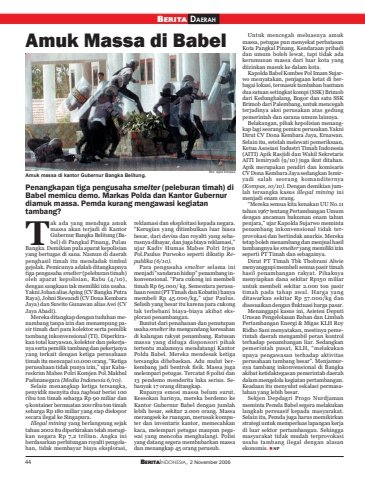 44 BERITAINDONESIA, 2 November 2006BERITA DAERAHAmuk Massa di BabelPenangkapan tiga pengusaha smelter (peleburan timah) diBabel memicu demo. Markas Polda dan Kantor Gubernurdiamuk massa. Pemda kurang mengawasi kegiatantambang?ak ada yang menduga amukmassa akan terjadi di KantorGubernur Bangka Belitung (Babel) di Pangkal Pinang, PulauBangka. Demikian pula aparat kepolisianyang bertugas di sana. Namun di daerahpenghasil timah itu mendadak timbulgejolak. Pemicunya adalah ditangkapnyatiga pengusaha smelter (peleburan timah)oleh aparat kepolisian, Rabu (4/10),dengan sangkaan tak memiliki izin usaha.Yakni Johan alias Aping (CV Bangka PutraRaya), Johni Siswandi (CV Dona KembaraJaya) dan Suwito Gunawan alias Awi (CVJaya Abadi).Mereka ditangkap dengan tuduhan menambang tanpa izin dan menampung pasir timah dari para kolektor serta pemiliktambang inkonvensional (TI). Diperkirakan total karyawan, kolektor dan pekerjanya serta pemilik tambang dan pekerjanyayang terkait dengan ketiga perusahaantimah itu mencapai 10.000 orang. “Ketigaperusahaan tidak punya izin,” ujar Kabareskrim Mabes Polri Komjen Pol.MakbulPadmanegara (Media Indonesia 6/10).Selain menangkap ketiga tersangka,penyidik menyita dua tugboat berisi 100ribu ton timah seharga Rp 90 miliar dan9 kontainer bermuatan 200 ribu ton timahseharga Rp 180 miliar yang siap dieksporsecara ilegal ke Singapura.Illegal mining yang berlangsung sejaktahun 2002 itu diperkirakan telah merugikan negara Rp 7,2 triliun. Angka iniberdasarkan perhitungan royalti pengolahan, tidak membayar biaya eksplorasi,reklamasi dan eksploitasi kepada negara.“Kerugian yang ditimbulkan luar biasabesar, dari devisa dan royalti yang seharusnya dibayar, dan juga biaya reklamasi,”ujar Kadiv Humas Mabes Polri IrjenPol.Paulus Purwoko seperti dikutip Republika (6/10).Para pengusaha smelter selama inimenjadi “sandaran hidup” penambang inkonvensional. “Para cukong ini membelitimah Rp 65.000/ kg. Sementara perusahaan resmi (PT Timah dan Kobatin) hanyamembeli Rp 45.000/kg,” ujar Paulus.Selisih yang besar itu karena para cukongtak terbebani biaya-biaya akibat eksplorasi penambangan.Buntut dari penahanan dan penutupanusaha smelter itu mengundang keresahandi kalangan rakyat penambang. Ratusanmassa yang diduga disponsori pihaktertentu malamnya mendatangi KantorPolda Babel. Mereka mendesak ketigatersangka dibebaskan. Adu mulut berkembang jadi bentrok fisik. Massa jugamelempari petugas. Tercatat 8 polisi dan13 pendemo menderita luka serius. Sebanyak 17 orang ditangkap.Rupanya emosi massa belum surut.Keesokan harinya, mereka berdemo keKantor Gubernur Babel dengan jumlahlebih besar, sekitar 2.000 orang. Massamerangsek ke ruangan, merusak komputer dan inventaris kantor, memecahkankaca, melempari petugas maupun pegawai yang mencoba menghalangi. Polisiyang datang segera membubarkan massadan menangkap 45 orang perusuh.Untuk mencegah meluasnya amukmassa, petugas pun menyekat perbatasanKota Pangkal Pinang. Kendaraan pribadidan umum boleh lewat, tapi tidak adakerumunan massa dari luar kota yangdiizinkan masuk ke dalam kota.Kapolda Babel Kombes Pol Imam Sujarwo menyatakan, penjagaan ketat di berbagai lokasi, termasuk tambahan bantuandua satuan setingkat kompi (SSK) Brimobdari Kedunghalang, Bogor dan satu SSKBrimob dari Palembang, untuk mencegahterjadinya aksi perusakan atas gedungpemerintah dan sarana umum lainnya.Belakangan, pihak kepolisian menangkap lagi seorang pemicu perusakan.YakniDirut CV Dona Kembara Jaya, Ernawan.Selain itu, setelah melewati pemeriksaan,Ketua Asosiasi Industri Timah Indonesia(AITI) Apik Rasjidi dan Wakil SekretarisAITI Ismiryadi (9/10) juga ikut ditahan.Apik merupakan pendiri dan komisarisCV Dona Kembara Jaya sedangkan Ismiryadi salah seorang komanditernya(Kompas, 10/10). Dengan demikian jumlah tersangka kasus illegal mining inimenjadi enam orang.“Mereka semua kita kenakan UU No.11tahun 1967 tentang Pertambangan Umumdengan ancaman hukuman enam tahunpenjara,” ujar Kapolda Sujarwo memintapenambang inkonvensional tidak terprovokasi dan bertindak anarkis. Merekatetap boleh menambang dan menjual hasiltambangnya ke smelter yang memiliki izinseperti PT Timah dan sebagainya.Dirut PT Timah Tbk Thobrani Alwiemenyanggupi membeli semua pasir timahhasil penambangan rakyat. Pihaknyamenyiapkan dana sekitar Rp150 miliaruntuk membeli sekitar 2.000 ton pasirtimah pada tahap awal. Harga yangditawarkan sekitar Rp 57.000/kg dandisesuaikan dengan fluktuasi harga pasar.Menanggapi kasus ini, Asisten DeputiUrusan Pengelolaaan Bahan dan LimbahPertambangan Energi & Migas KLH RoyRidho Sani menyatakan, mestinya pemerintah daerah mengambil peran kontrolterhadap penambangan liar. Sedangkanpemerintah pusat, KLH, “melakukanupaya pengawasan terhadap aktivitasperusahaan tambang besar”. Menjamurnya tambang inkonvensional di Bangkaakibat ketidaktegasan pemerintah daerahdalam mengelola kegiatan pertambangan.Keadaan itu menyulut eskalasi permasalahan yang lebih besar.Sekjen Depdagri Progo Nurdjamanmeminta Pemda Babel segera melakukanlangkah persuasif kepada masyarakat.Selain itu, Pemda juga harus memikirkanstrategi untuk memperluas lapangan kerjadi luar sektor pertambangan. Sehinggamasyarakat tidak mudah terprovokasiusaha tambang ilegal dengan alasanekonomis. SPTAmuk massa di kantor Gubernur Bangka Belitung. foto: repro kompas
