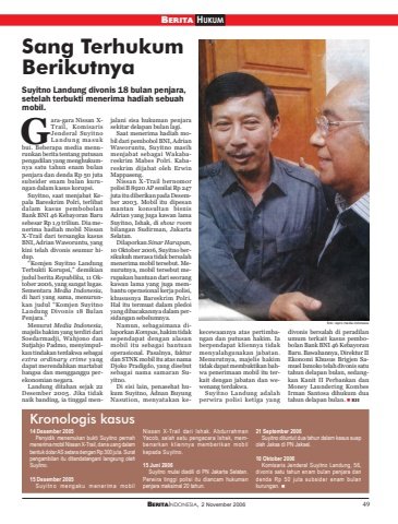 BERITAINDONESIA, 2 November 2006 49BERITA HUKUMSang TerhukumBerikutnyaKronologis kasus14 Desember 2005Penyidik menemukan bukti Suyitno pernahmenerima mobil Nissan X-Trail, dana uang dalambentuk dolar AS setara dengan Rp 300 juta. Suratpengambilan itu ditandatangani langsung olehSuyitno.15 Desember 2005Suyitno mengaku menerima mobilNissan X-Trail dari Ishak. AbdurrahmanYacob, salah satu pengacara Ishak, membenarkan kliennya memberikan mobilkepada Suyitno.15 Juni 2006Suyitno mulai diadili di PN Jakarta Selatan.Perwira tinggi polisi itu diancam hukumanpenjara maksimal 20 tahun.21 September 2006Suyitno dituntut dua tahun dalam kasus suapoleh Jaksa di PN Jaksel.10 Oktober 2006Komisaris Jenderal Suyitno Landung, 56,divonis satu tahun enam bulan penjara dandenda Rp 50 juta subsider enam bulankurungan. Suyitno Landung divonis 18 bulan penjara,setelah terbukti menerima hadiah sebuahmobil.ara-gara Nissan XTrail, KomisarisJenderal SuyitnoLandung masukbui. Beberapa media menurunkan berita tentang putusanpengadilan yang menghukumnya satu tahun enam bulanpenjara dan denda Rp 50 jutasubsider enam bulan kurungan dalam kasus korupsi.Suyitno, saat menjabat Kepala Bareskrim Polri, terlibatdalam kasus pembobolanBank BNI 46 Kebayoran Barusebesar Rp 1,9 triliun. Dia menerima hadiah mobil NissanX-Trail dari tersangka kasusBNI, Adrian Waworuntu, yangkini telah divonis seumur hidup.“Komjen Suyitno LandungTerbukti Korupsi,” demikianjudul berita Republika, 11 Oktober 2006, yang sangat lugas.Sementara Media Indonesia,di hari yang sama, menurunkan judul “Komjen SuyitnoLandung Divonis 18 BulanPenjara.”Menurut Media Indonesia,majelis hakim yang terdiri dariSoedarmadji, Wahjono danSutjahjo Padmo, menyimpulkan tindakan terdakwa sebagaiextra ordinary crime yangdapat merendahkan martabatbangsa dan mengganggu perekonomian negara.Landung ditahan sejak 22Desember 2005. Jika tidaknaik banding, ia tinggal menjalani sisa hukuman penjarasekitar delapan bulan lagi.Saat menerima hadiah mobil dari pembobol BNI, AdrianWaworuntu, Suyitno masihmenjabat sebagai Wakabareskrim Mabes Polri. Kabareskrim dijabat oleh ErwinMappaseng.Nissan X-Trail bernomorpolisi B 8920 AP senilai Rp 247juta itu diberikan pada Desember 2003. Mobil itu dipesanmantan konsultan bisnisAdrian yang juga kawan lamaSuyitno, Ishak, di show roombilangan Sudirman, JakartaSelatan.Dilaporkan Sinar Harapan,10 Oktober 2006, Suyitno bersikukuh merasa tidak bersalahmenerima mobil tersebut. Menurutnya, mobil tersebut merupakan bantuan dari seorangkawan lama yang juga membantu operasional kerja polisi,khususnya Bareskrim Polri.Hal itu termuat dalam pledoiyang dibacakannya dalam persidangan sebelumnya.Namun, sebagaimana dilaporkan Kompas, hakim tidaksependapat dengan alasanmobil itu sebagai bantuanoperasional. Pasalnya, fakturdan STNK mobil itu atas namaDjoko Pradigdo, yang disebutsebagai nama samaran Suyitno.Di sisi lain, penasehat hukum Suyitno, Adnan BuyungNasution, menyatakan kekecewaannya atas pertimbangan dan putusan hakim. Iaberpendapat kliennya tidakmenyalahgunakan jabatan.Menurutnya, majelis hakimtidak dapat membuktikan bahwa penerimaan mobil itu terkait dengan jabatan dan wewenang terdakwa.Suyitno Landung adalahperwira polisi ketiga yangdivonis bersalah di peradilanumum terkait kasus pembobolan Bank BNI 46 KebayoranBaru. Bawahannya, Direktur IIEkonomi Khusus Brigjen Samuel Ismoko telah divonis satutahun delapan bulan, sedangkan Kanit II Perbankan danMoney Laundering KombesIrman Santosa dihukum duatahun delapan bulan. RHGfoto: repro media indonesia