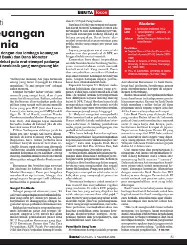 BERITAINDONESIA, 2 November 2006 53BERITA TOKOHtieuangannia dengan dua lembaga keuangand Bank) dan Dana Moneterelekat pula erat stempel padanyami neoklasik yang mengusung ideYudhoyono menang Ani juga termasukorang yang turut dipanggil ke Cikeasmenjalani “fit and proper test” sebagaicalon menteri.Sempat beredar kabar terjadi tarikmenarik yang sangat kuat, akan di posmana Ani ditempatkan. Bahkan, sebelumitu Yudhoyono diperhadapkan pada duapilihan yang sangat sulit antara memilihkubu yang pro IMF (Ani dan kawankawan), atau kubu yang anti IMF (diwakilifigur Dr. Rizal Ramli, mantan MenkoPerekonomian dan Menteri Keuangan eraGus Dur). Ani dengan tegas menolakbersedia duduk di kabinet jika di situbercokol nama Rizal Ramli.Pilihan Yudhoyono akhirnya jatuh kekubu pro IMF tetapi Ani hanya ditempatkan di kursi Menneg PPN/KepalaBappenas. Satu tahun pertama usiakabinet banyak muncul tuntutan reshuffle. Secara tepat solusi yang ditempuhYudhoyono adalah memanggil kembalimantan koleganya di era Kabinet GotongRoyong, mantan Menkeu Boediono untukditempatkan sebagai Menko Perekonomian.Bersamaan itu Presiden juga merotasiSri Mulyani ke habitat aslinya di posMenteri Keuangan. Pasar pun bergeloramemberikan optimisme, hingga duapenghargaan bergengsi tadi akhirnyaberhasil tiba di pundak Ani.Sangat Pro-BisnisSebagai penganut ekonomi pasar, SriMulyani sangat ingin menelurkan kebijakan yang serba pro-bisnis pro-pasar. Keberpihakan ini dianggapnya sebagai bagian dari upaya perbaikan iklim investasi.Bahkan karena begitu responsif memenuhi kebutuhan pasar Ani sempat ‘diancam’ anggota DPR untuk tak akanmelanjutkan pembahasan paket limaRUU Perpajakan khususnya yang tiga:RUU Ketentuan Umum dan Tata CaraPerpajakan; RUU Pajak PertambahanNilai dan Pajak Penjualan Barang Mewah;dan RUU Pajak Penghasilan.Pasalnya Sri Mulyani sempat melayangkan Surat Menteri Keuangan Nomor 224tertanggal 31 Mei 2006 tentang penyempurnaan rancangan undang-undang dibidang perpajakan. Surat berisi akomodasi pemerintah atas permintaan parapelaku usaha yang sangat pro-pasar danpro-bisnis.Sayang pengajuan surat menyalahimekanisme dan prosedural di DPR sehingga ditolak mentah-mentah.Kemacetan baru dapat terpecahkansetelah Presiden Susilo Bambang Yudhoyono memerintahkan untuk menarikkembali surat tadi. Yang menarik, Presiden menyebutkan penarikan dilakukanatas saran Menteri Keuangan Sri Mulyanipula, dengan harapan supaya pembahasan bisa dilakukan lebih baik.Pupuskah harapan Sri Mulyani melahirkan kebijakan ekonomi yang propasar? Tidak juga. Sebab masih ada celahlain. Ide usulan-usulan penyempurnaanbisa dititipkan kepada masing-masingfraksi di DPR. Tetapi Menkeu harus lebihmengerahkan segala daya untuk melobifraksi-fraksi agar mau menerima usulan,dan memperjuangkannya hingga gol.Sri Mulyani mengakui memperbaikiiklim investasi bukan pekerjaan mudah.Harus terlebih dahulu melakukan beberapa reformasi di bidang pembukaanusaha, pajak, peraturan perdagangan, danperbaikan infrastruktur.“Kita harus bekerja keras dan optimis.Beberapa perbaikan dapat meningkatkankepercayaan investor dalam maupun luarnegeri,” kata Ani, kepada Diah DewiJuniarti dari Bali Post di Nusa Dua, Balipada pertengahan Desember 2005.Secara konkrit, dalam kebijakan perdagangan akan diusahakan terdapat pemotongan waktu pengurusan izin. Beberapakebijakan distribusi barang dalam negeri,terutama yang menghambat dan negatifharus dihilangkan. Pengajuan paket RUUPerpajakan merupakan salah satu revisikebijakan yang menyangkut persoalanadministrasi.“Semuanya bertujuan untuk memberikan insentif dan menyediakan regulasiyang pro-bisnis. Di antara RUU perpajakan dan bea yang sedang diajukan inisalah satunya menurunkan nilai pajak,”ujar Menteri yang sepanjang tahun 2006memiliki tujuh prioritas pembangunan.Yakni mengurangi kemiskinan, merevitalisasi pertanian, meningkatkan akses dankualitas pendidikan serta layanan kesehatan, memberantas korupsi, memperkuat hukum dan penegakannya, danmerehabilitasi Aceh dan Nias.Pukul Balik Sang TuanMemberantas korupsi adalah programAni tahun ini. Bersamaan itu Bank Dunia,lewat Paul Wolfowitz, Presidennya, gencarpula memberantas korupsi di negaranegara berkembang.Bank Dunia sadar, korupsi memberikankontribusi besar terhadap proses pemiskinan masyarakat. Karena itu Bank Duniatelah menahan 1 miliar dollar AS danapinjaman untuk negara-negara Asia danAfrika karena adanya dugaan korupsi.Lalu Bank Dunia yang dipimpin Paul,yang mantan Dubes AS untuk Indonesiapada 26 Juni 2006 mendaratkan sepucuksurat di meja kerja Ani. Isinya, pemberitahuan indikasi korupsi di jajaranDepartemen Pekerjaan Umum RI yangmenerima suap dari WSP InternationalLtd, kontraktor dari Inggris yang dipercaya mengerjakan Proyek TransportasiWilayah Indonesia Timur senilai 150 jutadollar AS di tahun 2001.Usai menerima dua penghargaan diSingapura Ani lantas memanfaatkan forum sidang tahunan Bank Dunia-IMFmenyerang balik mantan “tuannya”.Dalam pidatonya Ani menegaskan komitmen pemerintah untuk memerangi korupsi. Serangan kemudian dilancarkandengan meminta Bank Dunia dan IMFbekerjasama dengan Pemerintah RIuntuk melacak aset para koruptor, maupun mengembalikan aset yang telahdikorupsi.Bank Dunia harus bekerjasama denganberbagai institusi di Indonesia untuk berbagi informasi dari hasil investigasinya secara berkala. Diusulkannya agar dilakukan investigasi dan mencari solusi bersama.“Jika bank menghendaki kami terbukamengenai isu korupsi, kami mendesakBank Dunia juga lebih terbuka kepada kamimengenai berbagai temuannya dari hasilinvestigasi korupsi,” tutur Sri, yang kontanmemperoleh applaus tepuk tangan meriahdari semua peserta sidang. “Jadilah mitra,bukan sebagai pengkhotbah.” HT/MSBiodata:Nama : Sri Mulyani Indrawati, Ph.DLahir : Tanjungkarang, Lampung, 26Agustus 1962Jabatan : Menteri Keuangan Kabinet Indonesia BersatuPendidikan:fl Sarjana Ekonomi Fakultas Ekonomi Universitas Indonesia (FE-UI) Jakarta (1981-1986)fl Master of Science of Policy Economics,University of Illionis Urbana Champaign
