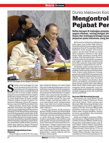 54 BERITAINDONESIA, 2 November 2006BERITA EKONOMIDunia Melawan KoruMengontrol Pejabat PemNafsu korupsi di kalangan penyelensegera ditekan, seiring dengan diraDunia dan lembaga-lembaga keuanpinjaman pada Indonesia, yang bergilan Akrab Sri Mulyani itu resah, bukansaja latar belakang kedatangan surat itu,melainkan tujuan Bank Dunia mengirimkan suratnya. Dalam surat itu, Bank Duniameminta pemerintah Indonesia mengembalikan dana yang mereka kucurkan sebesar 4,7 juta dolar AS, sebagai sanksi ataspenyuapan dalam proyek itu. Itu samaartinya dengan merongrong APBN, karena pemerintah harus mengeluarkandana yang tidak kecil untuk mengembalikan pinjaman dana Bank Dunia, tidakpada waktunya.Untung saja Komisi PemberantasanKorupsi (KPK) berhasil membujuk BankDunia agar tidak melanjutkan penjatuhansanksinya meminta kembali dana sebesar4.7 miliar dolar AS, hingga KPK menyelesaikan penyelidikan atas indikasi suappada proyek Transportasi Wilayah Indonesia Timur dan proyek Infrastruktur Jalan Strategis. “Jangan sampai hanya ulahsegelintir orang, keuangan negara danrakyat harus menanggung akibatnya,”kata Wakil Ketua KPK Erry Riyana Hardjapamekas, seperti dikutip HarianKompas, Sabtu (19/8).Kasus suap ini sebenarnya berlangsungpada tahun 2001 ketika WSP International Ltd berhasil memenangkan kontrakpengerjaan Proyek Transportasi WilayahIndonesia Timur dengan nilai kontraksebesar 150 juta dolar AS dari 4,7 miliardolar pinjaman Indonesia dari BankDunia untuk membiayai proyek Infrastruktur Jalan Strategis lainnya. MenurutWakil Presiden RI Jusuf Kalla, kontraktorasal Inggris itu diketahui memberi kickback atau semacam uang terima kepadapara pejabat di Departemen PU saat itu.Jusuf Kalla sendiri sempat tidak menerima sikap Bank Dunia yang akan menjatuhkan sanksi kepada pemerintah Indonesia, karena yang seharusnya bertanggung jawab adalah WSP International Ltd.Namun Kepala Perwakilan Bank Dunia diJakarta, Andrew Steer dan PenasehatKepala Tata Kelola Pemerintahan BankDunia Joel Hellman menyatakan bahwakasus korupsi proyek jalan yang didanaiBank Dunia tidak semata-mata menjaditanggung jawab pengusaha yang menyogok aparat pemerintah saja, tetapi jugamenjadi tanggung jawab dan kesalahanaparat pemerintah.Konvensi PBB Menantang KorupsiMencuatnya isu suap dalam ProyekTransportasi Wilayah Indonesia Timuroleh Bank Dunia, tidak terlepas dariKonvensi PBB Menentang Korupsi atauUnited Nation Convention Against Corruption (UN CAC). Konvensi PBB ini telahdiratifikasi Indonesia dengan UU No 7Tahun 2006. Dengan demikian, Indonesia harus menjalankan dan mematuhikonvensi PBB tersebut.Salah satu langkah yang harus dilakukan Indonesia, sebagai tindak lanjut dariratifikasi Konvensi PBB ini adalah mengintegrasikan delik-delik korupsi yang diatur dalam United Nation ConventionAgainst Corruption ke dalam UU TindakPidana Korupsi. Dalam hal ini, UU No. 31Tahun 1999 tentang PemberantasanTindak Pidana Korupsi, juga harus diamandeman. Perumusan amandeman iniebuah surat bertanggal 26 Juni2006 mendarat di meja Sri Mulyani Indrawati. Perempuan yangbelum setahun menjabat MenteriKeuangan RI itu tentu sangat terkejutdengan surat dari Bank Dunia itu. Sepertidilaporkan Harian Kompas, Kamis (31/8), surat Bank Dunia itu berisi pemberitahuan indikasi korupsi di jajaran Departemen Pekerjaan Umum RI yang menerima suap dari WSP International Ltd.Dalam suratnya, Bank Dunia mengindikasikan Perusahaan asal Inggris itu telahmenyuap para pejabat di jajaran DepartemenPekerjaan Umum RI agar dapat memenangkan kontrak pengerjaan proyek jalan di Sulawesi yang dibiayai dengan pinjaman BankDunia. Bahkan Bank Dunia sempat mengancam akan membatalkan sejumlah pinjamanIndonesia lainnya yang belum sempat dicairkan pemerintah melalui fasilitas pinjamandalam East Indonesia Region-TransportProject (EIR-TP) dari Bank Dunia tersebut.Diminta Mengembalikan DanaPinjamanYang mungkin membuat Bu Ani, pangSMenteri Keuangan RI Sri Mulyani Indrawati. foto: berindo wilson