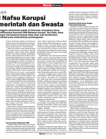 BERITAINDONESIA, 2 November 2006 55BERITA EKONOMIupsil Nafsu Korupsimerintah dan Swastaenggara administasi publik di Indonesia, tampaknya harusratifikasinya Konvensi PBB Melawan Korupsi. Jika tidak, Bankangan internasional lainnya tidak akan sudi memberikanerakibat pada melambatnya pembangunan.tengah dilakukan Badan PembinaanHukum Nasional (BPHN) beserta Departemen Hukum dan HAM di bawah pimpinan tim perumus Dr. Andi Hamzah.Salah satu aturan yang paling pentingdari United Nation Convention AgainstCorruption, bahwa tidak hanya pejabatpublik yang dapat dituduh melakukankorupsi, tetapi pejabat dari sektor usaha.Seperti dilaporkan Harian Kompas, Sabtu(12/8), Ketua KPK Taufiqurrachman Rukimengungkapkan bahwa masalah penyuapan (bribery) dan penggelapan (embezzlement) yang dilakukan swasta,bersamaan dengan Konvensi PBB Melawan Korupsi, sudah masuk dalam pidanakorupsi. Pada Pasal 21 dan 22 KonvensiPBB Melawan Korupsi, menetapkanbahwa setiap negara anggota wajib mengadopsi legislasi yang menetapkan penyuapan serta penggelapan kekayaan disektor swasta sebagai sebuah kejahatan.Kesadaran Bank Dunia akan kontribusikorupsi terhadap proses pemiskinanmasyarakat, sesungguhnya sudah lahirsejak lama. Namun baru belakangan inikesadaran tersebut diwujudkan dalamsebuah langkah strategik, menyusul lahirnya Konvensi PBB Menentang Korupsi. Seperti dilaporkan Harian Suara Pembaruan (19/9), langkah-langkah yang diambil Bank Dunia dalam kerangka Konvensi PBB ini, telah menahan sekitar 1miliar dolar AS dana pinjaman untuk negara-negara Asia dan Afrika, karenaadanya dugaan korupsi.Bank Dunia, melalui Komite KebijakanPerencanaannya, juga telah menyusunstrategi yang lebih luas guna melawantindakan korupsi. Komite yang beranggotakan 24 anggota dewan eksekutif itu bertugas mengawasi dan memastikan keputusan-keputusan komite dilaksanakandengan benar.Rencana Aksi Antikorupsi ADBLangkah Bank Dunia melawan korupsi,tidak hanya dilakukan untuk internalnyasendiri, tetapi juga mendorong bank-bankmultilateral lainnya melakukan hal yangsama. Dalam pertemuan tahunan BankDunia dengan IMF di Singapura, 19 September silam, Presiden Bank DuniaWolfowitz mengumumkan telah tercapainya kesepakatan dengan bank-bankpembangunan multilateral lainnya dalampembagian informasi guna memerangifraud dan korupsi.Di pihak lain, Asian Development Bank(ADB), seperti yang dilaporkan HarianBisnis Indonesia, Kamis (24/8) juga telahmenyusun rencana aksi antikorupsi dipemerintahan yang menggunakan danaADB. Perwujudan rencana aksi antikorupsi ini, dilakukan dengan memintanegara-negara peminjam membuat kontrak penghargaan publik dan hasilnyaakan diumumkan pada situs resmi ADB.Kontrak penghargaan publik akandiberlakukan ADB untuk kontrak pinjaman di atas 1 juta dolar AS. Di sampingitu, ADB juga akan mengembangkanfasilitas pelaporan dugaan kecurangandan korupsi. Wakil Presiden ADB, Geertvan der Linder, seperti yang dituliskanpada situs resmi ADB menyatakan bahwalangkah-langkah yang dilakukan ADBtersebut merupakan jawaban atas kelemahan pemerintah mengatasi korupsi,sangat signifikan menghalangi investasi,pengelolaan sumber daya alam, danmampu mengubah sasaran alokasi penganggaran pemerintah.“Korupsi telah merusak kredibilitaskewenangan masyarakat dan efektivitaslembaga pemerintah. Pihak yang palingbanyak dirugikan adalah masyarakatmiskin,” tuturnya.Rencana Aksi Antikorupsi ADB padaempat sasaran. Pertama, memperhitungkan risiko kemiskinan dari sisi pemerintahan, kelembagaan yang lemah, dankorupsi untuk mengembangkan sosialdan ekonomi negara. Kedua, memastikan risiko korupsi tidak akan mengganggu perhitungan proyek-proyek yangdirancang.Ketiga, membentuk agen khusus meminimalkan risiko korupsi ketika proyekproyek sedang dikerjakan. Keempat,mendata ulang kemampuan ADB secaraberkala dalam melakukan kesepakatandengan pemerintah, dengan mengembangkan kemampuan staf untuk mengadopsi strategi terbaik.Kerjasama Bank Dunia denganPemerintah IndonesiaBerkaitan dengan dugaan korupsi dansuap dalam proyek Transportasi WilayahIndonesia Timur, Bank Dunia akhirnyamenyetujui permintaan KPK agar menunda penjatuhan sanksi kepada pemerintahIndonesia, berupa pengembalian danapinjaman sebesar 4,7 miliar dolar AS. KPKberharap, Bank Dunia akan bersabarmenunggu hasil penyelidikan atas dugaankorupsi tersebut, paling tidak hingga ketingkat penyidikan selesai. Setelah itu,Bank Dunia boleh menjatuhkan sanksinyakepada pemerintah Indonesia.Untuk menindaklanjuti surat MenteriKeuangan RI sehubungan dengan kasusdugaan korupsi tersebut, serta hasilpertemuan Wakil Ketua KPK Erry RiyanaHardjapamekas dengan Tim Ekonomidan Senior Disbursement Officer BankDuia 11 Juli 2006, pada hari itu juga KPKmembentuk Tim Penyidik. Maka padapertemuan itu, Bank Dunia juga berjanjiakan menyerahkan hasil investigasimereka atas kasus tersebut.Dalam berbagai kesempatan, PresidenBank Dunia Paul Wolfowijk meminta agardibangun kerjasama yang baik antaraBank Dunia dan IMF dengan pemerintah,guna melawan korupsi. Maka pada Pertemuan Tahunan IMF dengan Bank Duniadi Singapura, 19-20 September 2006,Menteri Keuangan RI Sri Mulyani Indrawati seakan menagih janji Presiden BankDunia tersebut.Dalam pidatonya pada pembukaanpertemuan tahunan Dana Moneter Internasional (IMF) dan Bank Dunia itu, SriMulyani dengan tandas meminta IMF danBank Dunia, tidak hanya melawan korupsitetapi juga membantu melacak aset parakoruptor. Untuk itu dia meminta kerjasama tim dari Bank Dunia dan IMF di Indonesia guna melacak aset (asset tracing)maupun pengembalian aset (asset recovery) yang telah dikorupsi.Bank Dunia, menurut Menkeu, harusbekerja sama dengan berbagai institusi diIndonesia untuk berbagi informasi darihasil investigasinya secara berkala. Diabahkan mengusulkan agar dilakukaninvestigasi dan mencari solusi bersama.”Jika bank menghendaki kami terbukamengenai isu korupsi, kami mendesakBank Dunia juga lebih terbuka pada kamimengenai berbagai temuannya dari hasilinvestigasi korupsi,” tutur Sri Mulyaniseperti dikutip Harian Bisnis Indonesia,Rabu 